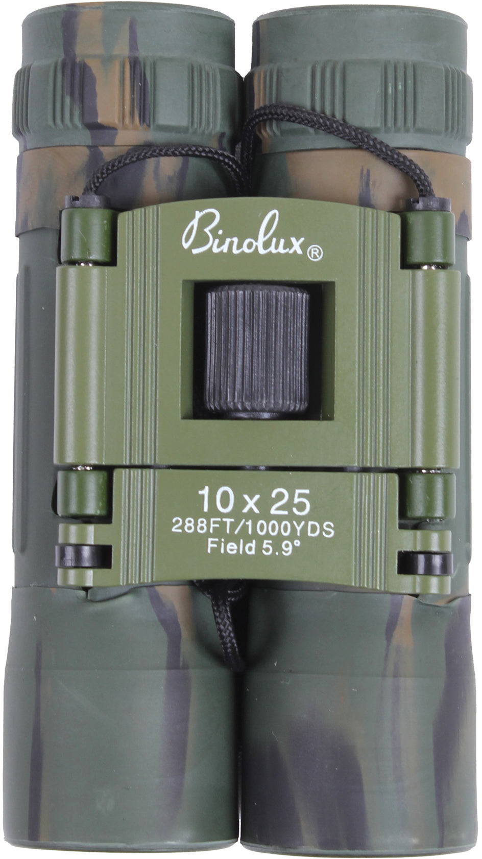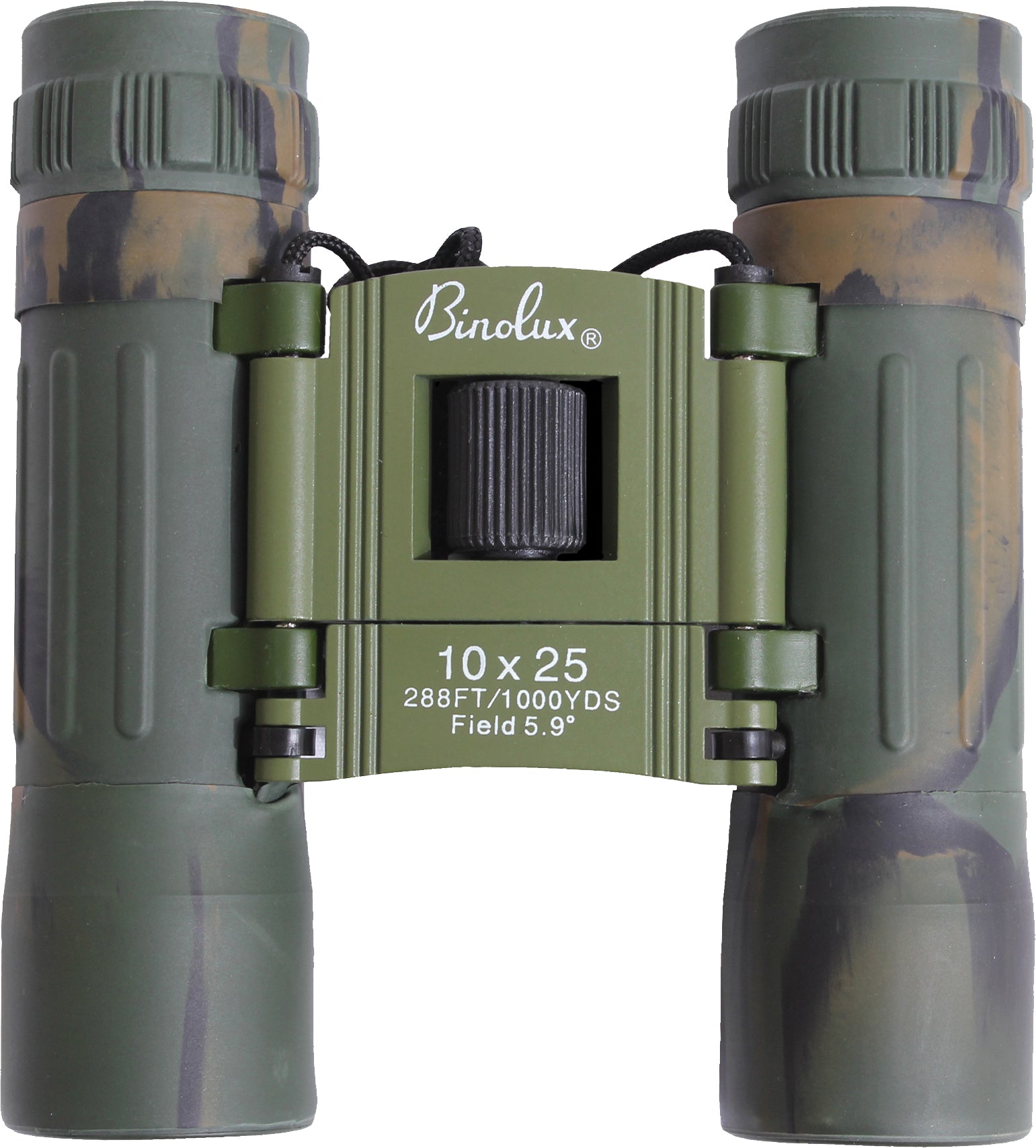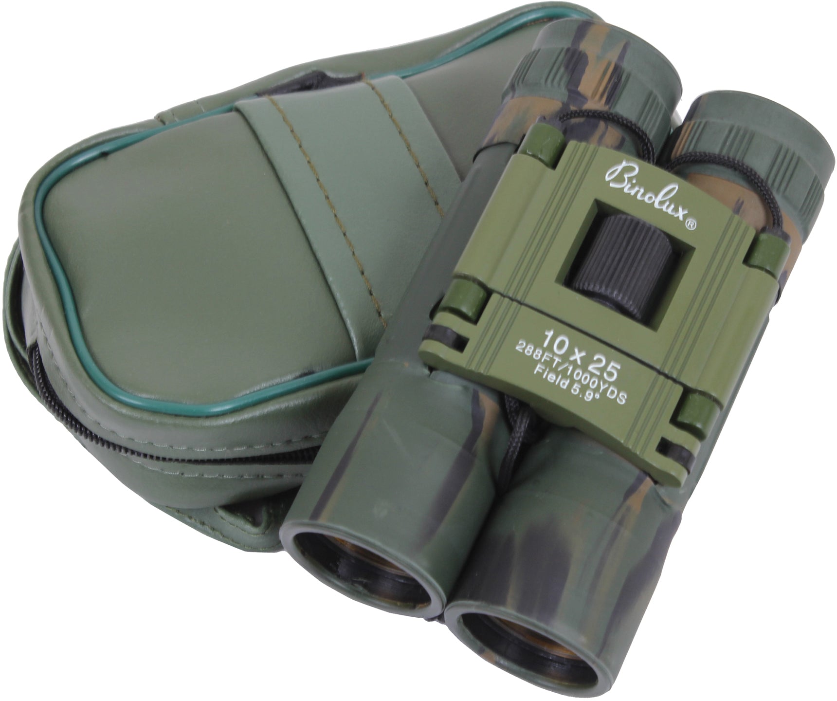 Hand-held binoculars. Camouflage compact prism. Rubber covered for extra protection, rubber eyecups, Field of view 288 feet at 1,000 yards. Carrying case included. Binoculars meets objective for outdoor use. Great for bird watching, hunting, theater shows, Opera, tourist attractions, etc. Don't pay money for those installed pedestal mounted coin-operated binoculars. GI Government Issued style. 10 x 25 98m/100m printed on binoculars. Camouflage 10 x 25mm compact binoculars. Lens Dimensions: 10 x 25mm.