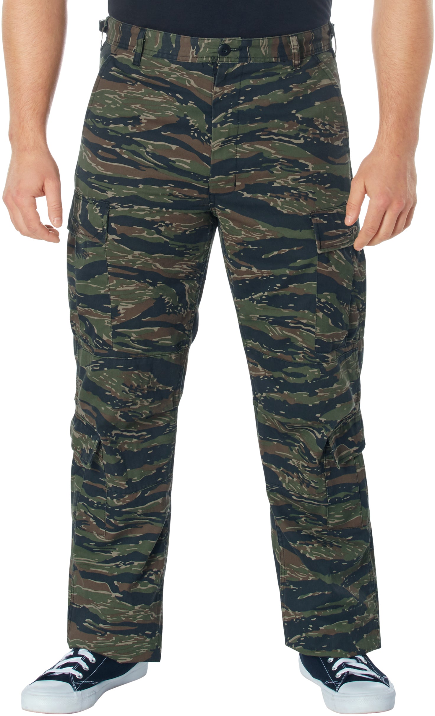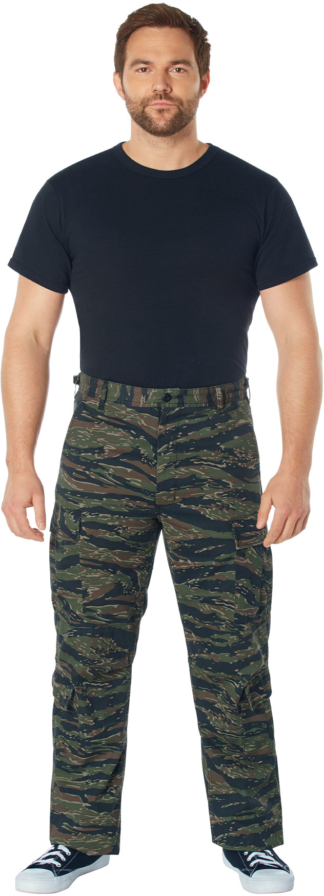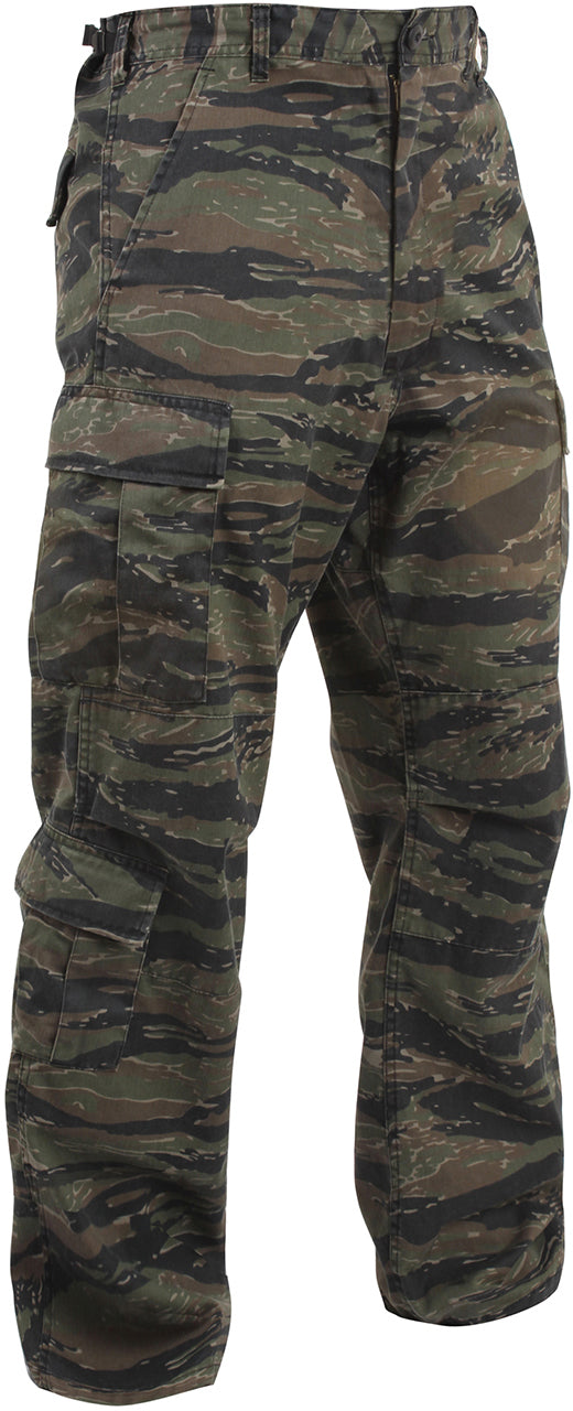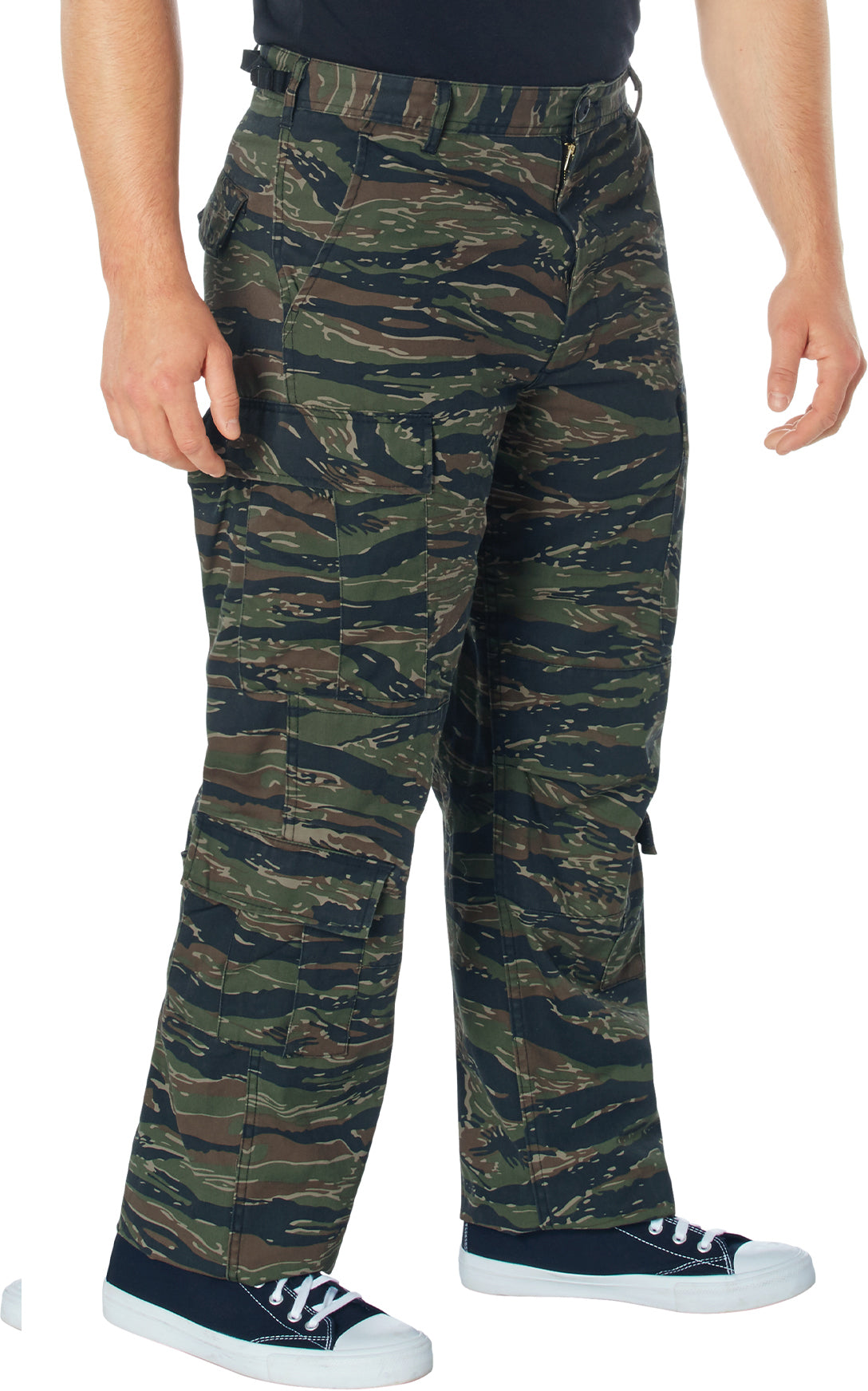 The vintage paratrooper fatigue pants are a military inspired pants, constructed after the BDU (Battle Dress Uniform) pants. The vintage paratrooper fatigue pants are worn today as a fashion statement, for sports such as air soft and paintball, for use by law enforcement personnel and by a wide range of military's. The tiger stripe camo polyester / cotton vintage paratrooper fatigue pants are comfortable enough to be worn as casual pants or as part of a tactical uniform.