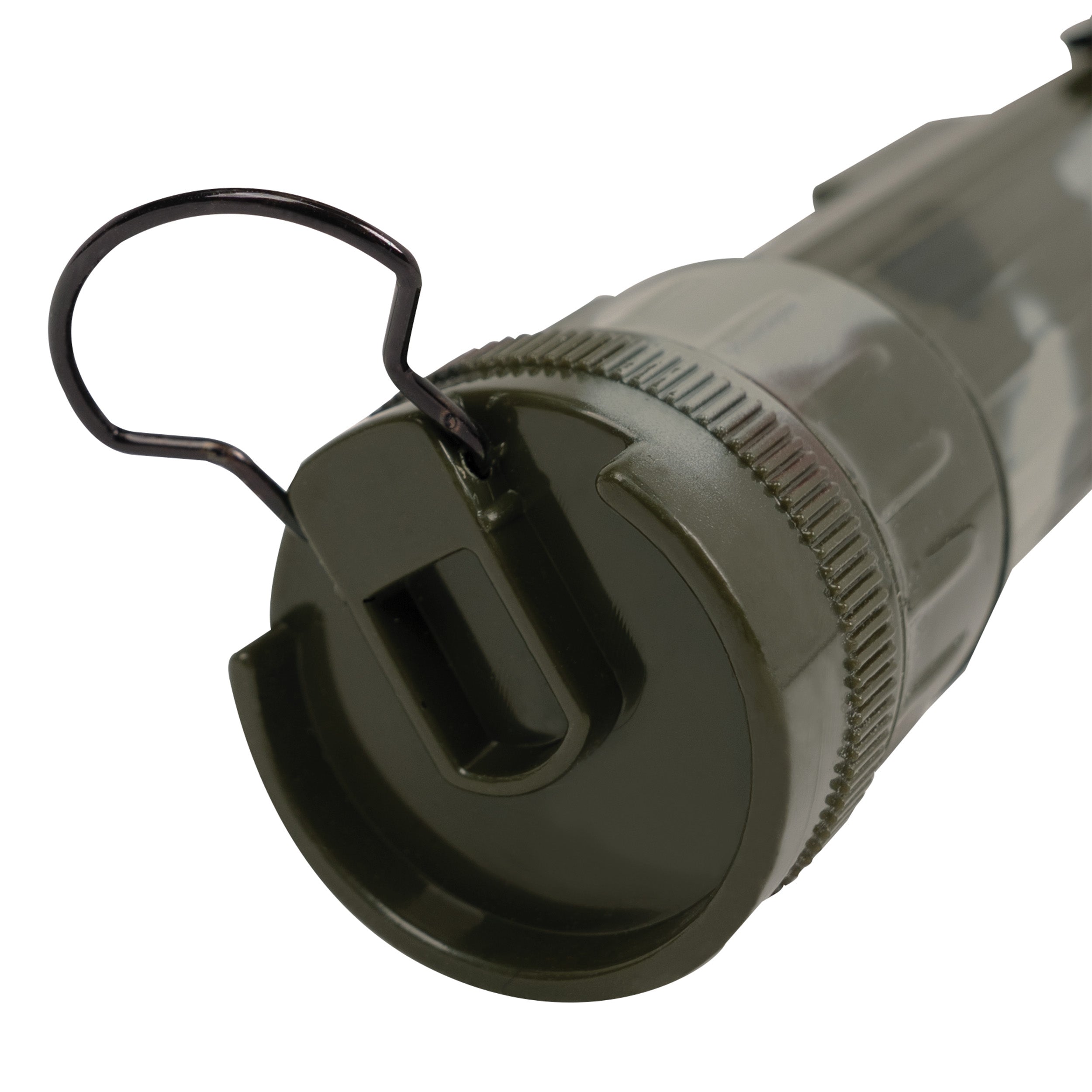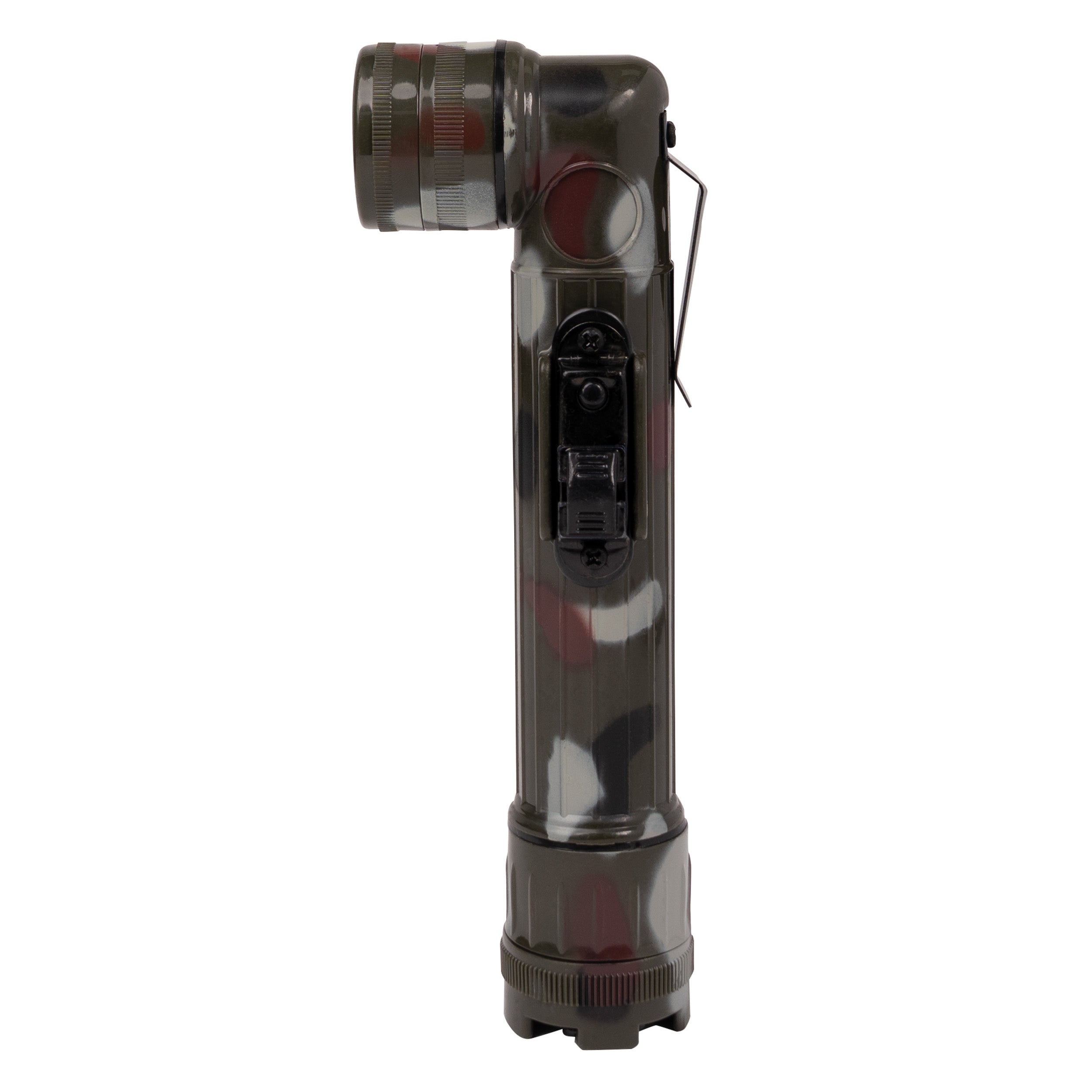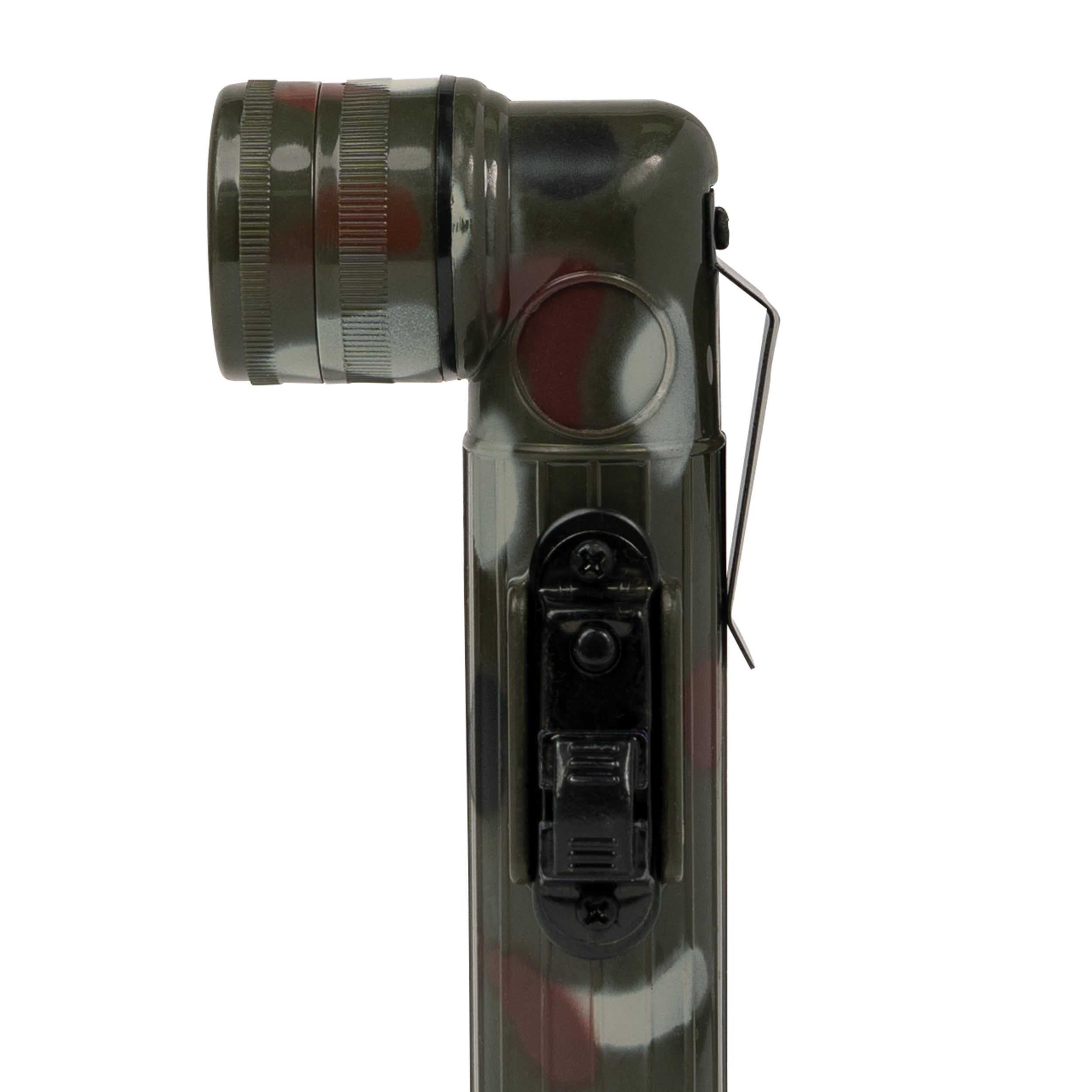 High density construction. Belt clip. Comfortable angle head design. Comes with extra lenses and 1 spare bulb. Lenses are colored red, blue, yellow, green. Requires 2 AA batteries(batteries not included). Military crookneck flashlight. GI Government issued type. Official standard type of the US Military. Woodland Camouflage mini Army style and anglehead flashlight. Size: 152 x 35.2 x 29.5mm (Millimeters). Length: 6" (inches).
