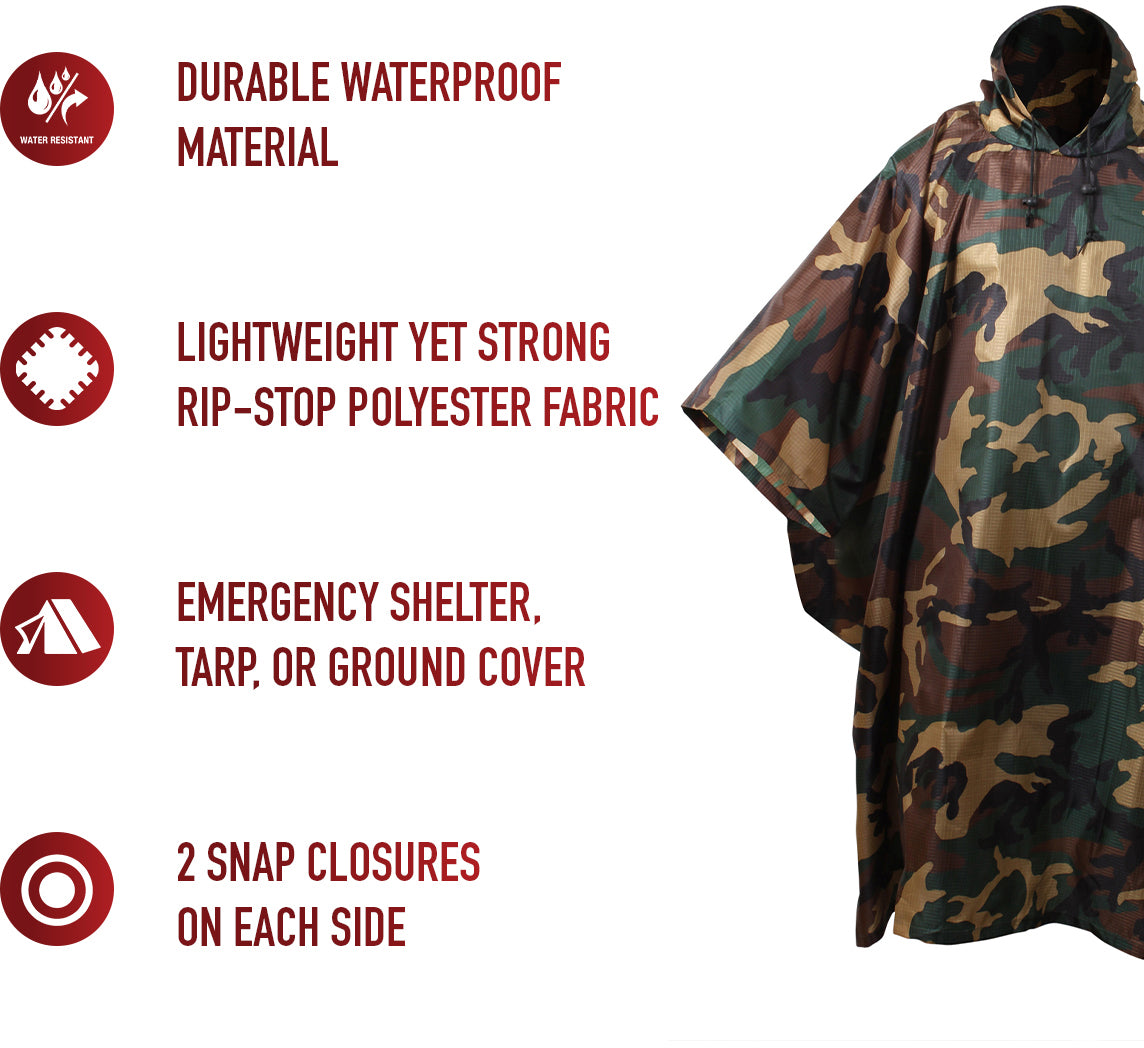 Made of 100% polyester ripstop. Durable and waterproof construction. Snaps closures on each side for double protection. Grommeted corners for use as emergency shelter. Elongated hood with under-chin ties. Government issue style. Military specification with enhanced quality and construction. Woodland camouflage GI army poncho (polyester rip-stop). Dimensions: 56" x 90" (inches).