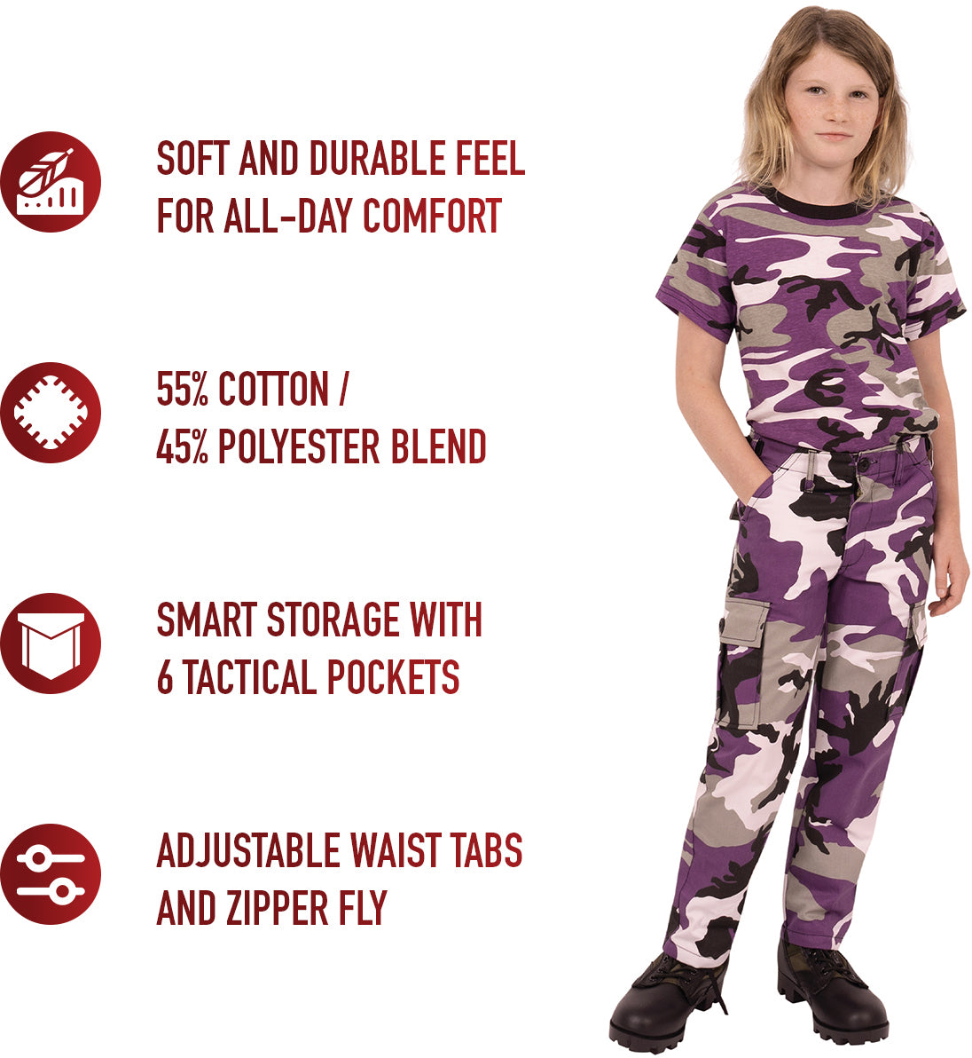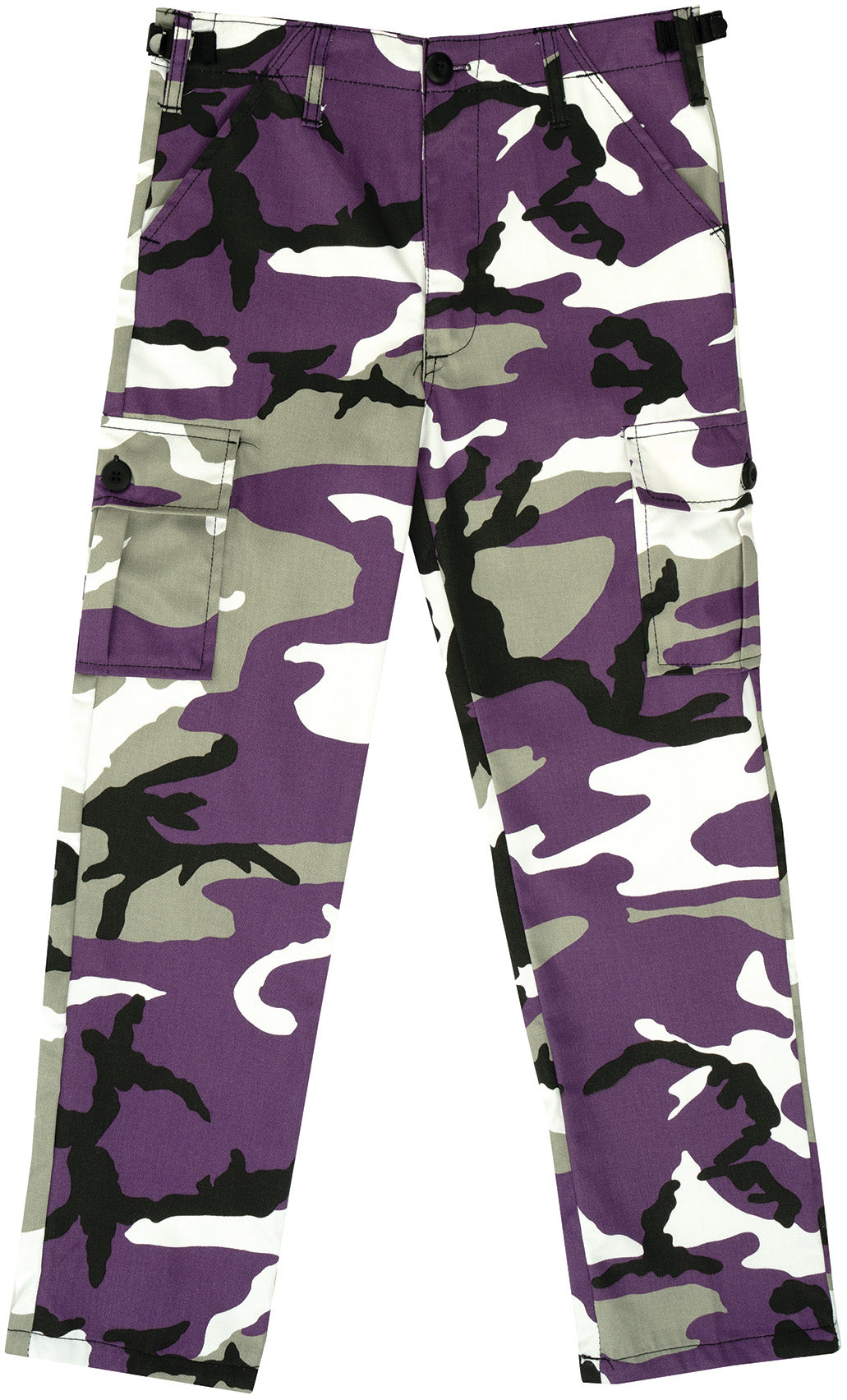 | Product | Ultra Violet Camouflage - Tactical BDU Cargo Pants - Poly/Cotton Twill - Zipper Fly - Kids |