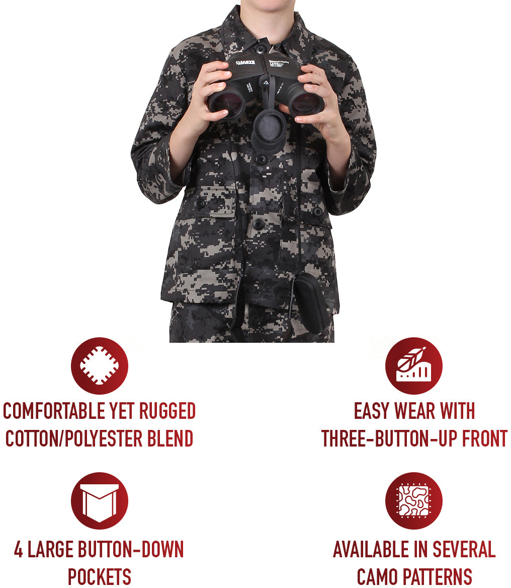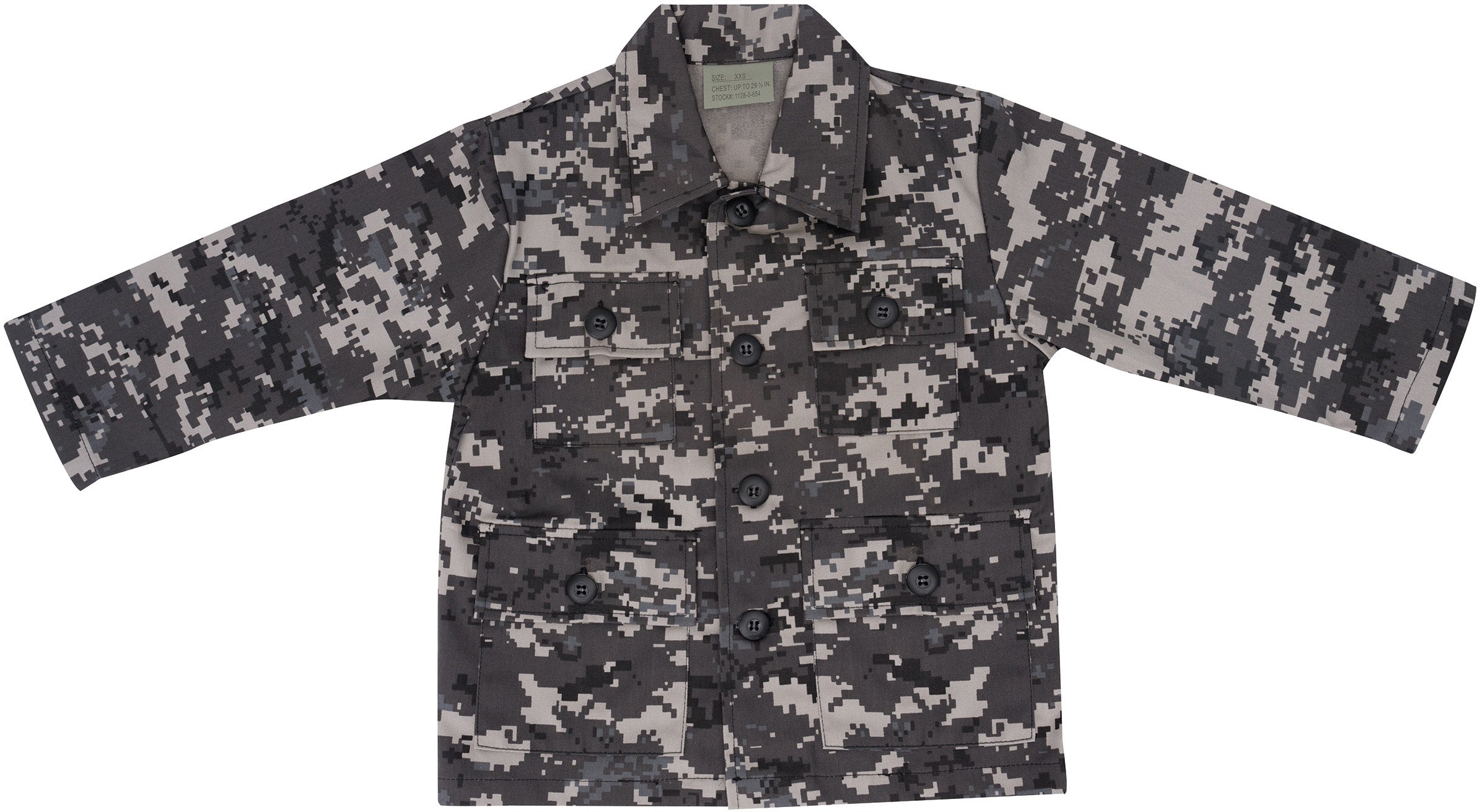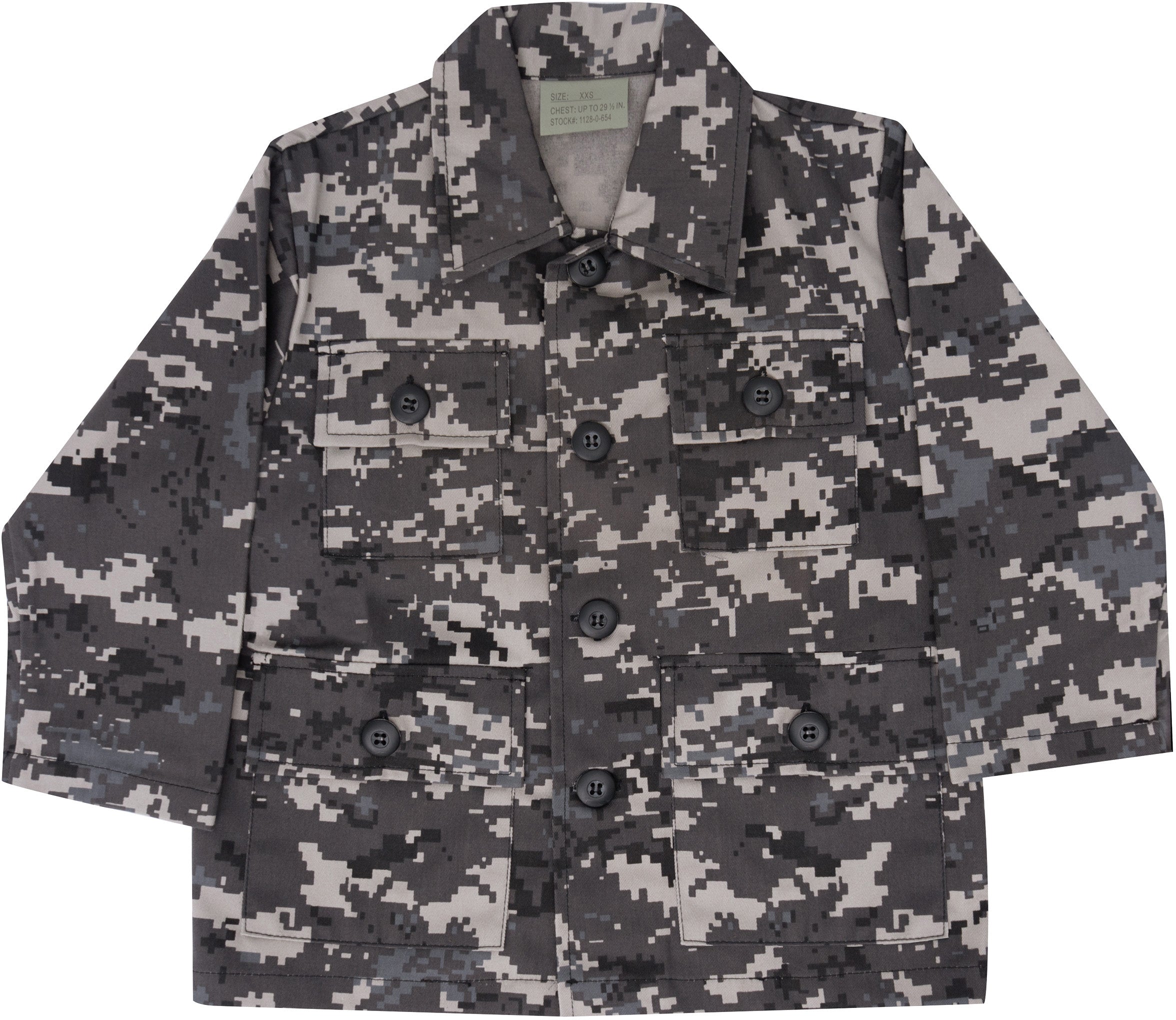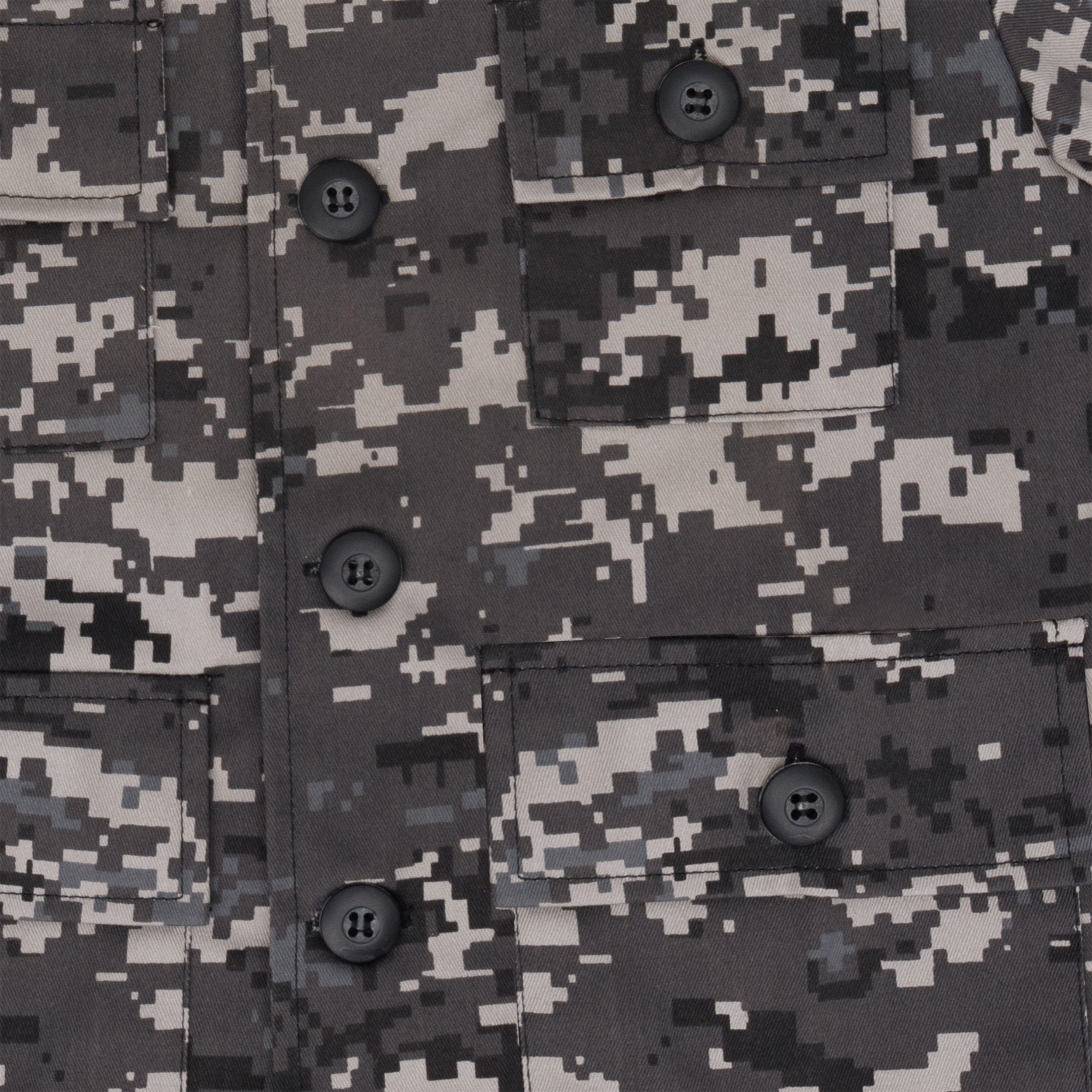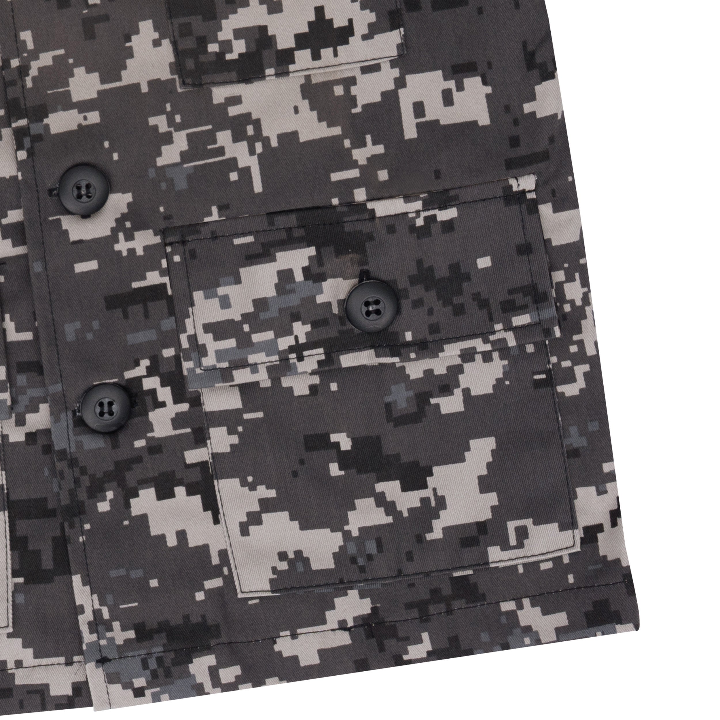 The BDU (Battle Dress Uniform) shirt is an iconic pair of pants, once used by the US military and many others. The kids BDU shirts are worn today as a fashion statement and for sports such as air soft and paintball. The subdued urban digital camo cotton / polyester kids battle dress uniform shirts are comfortable enough to be worn as an everyday casual shirt.