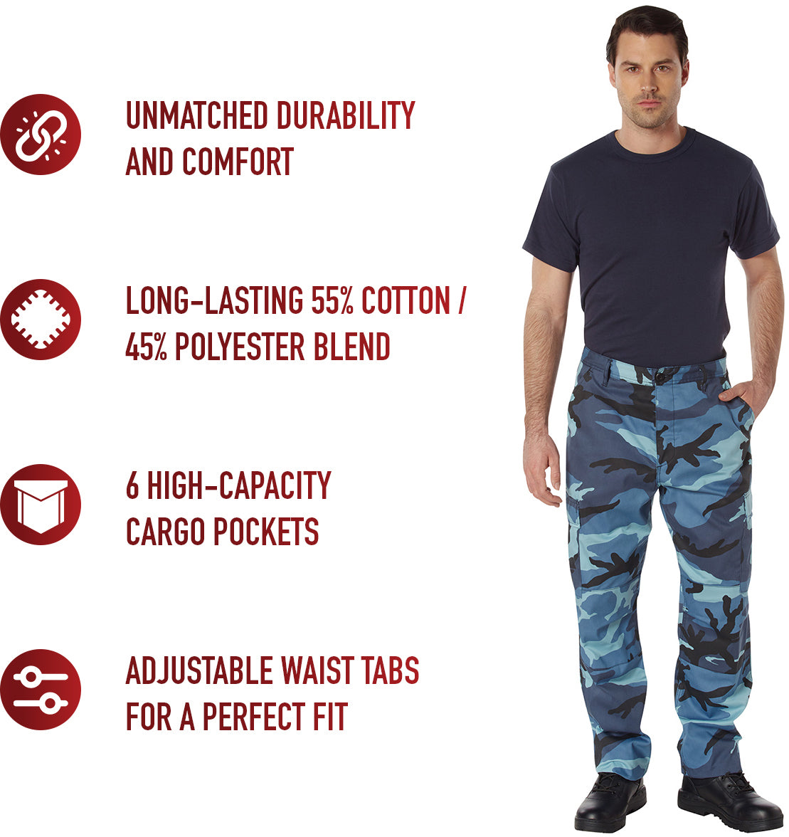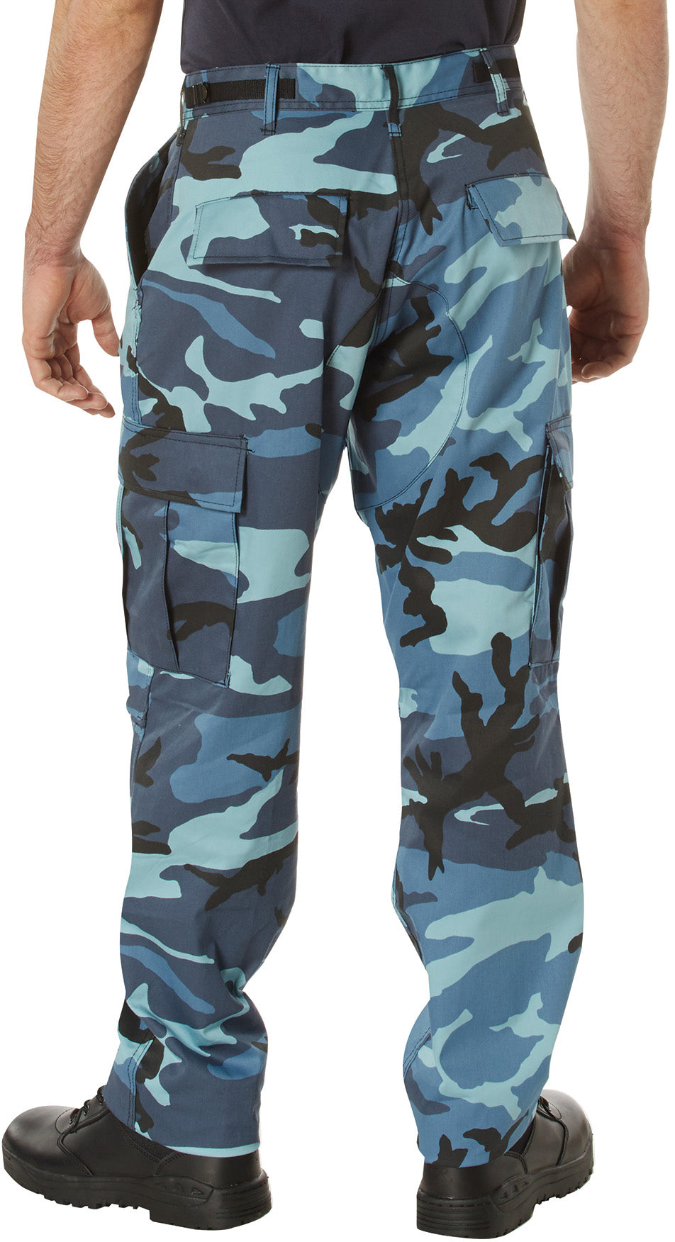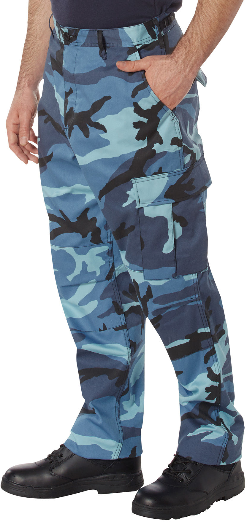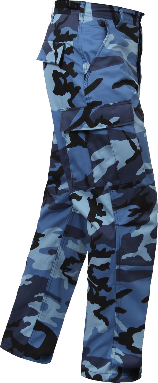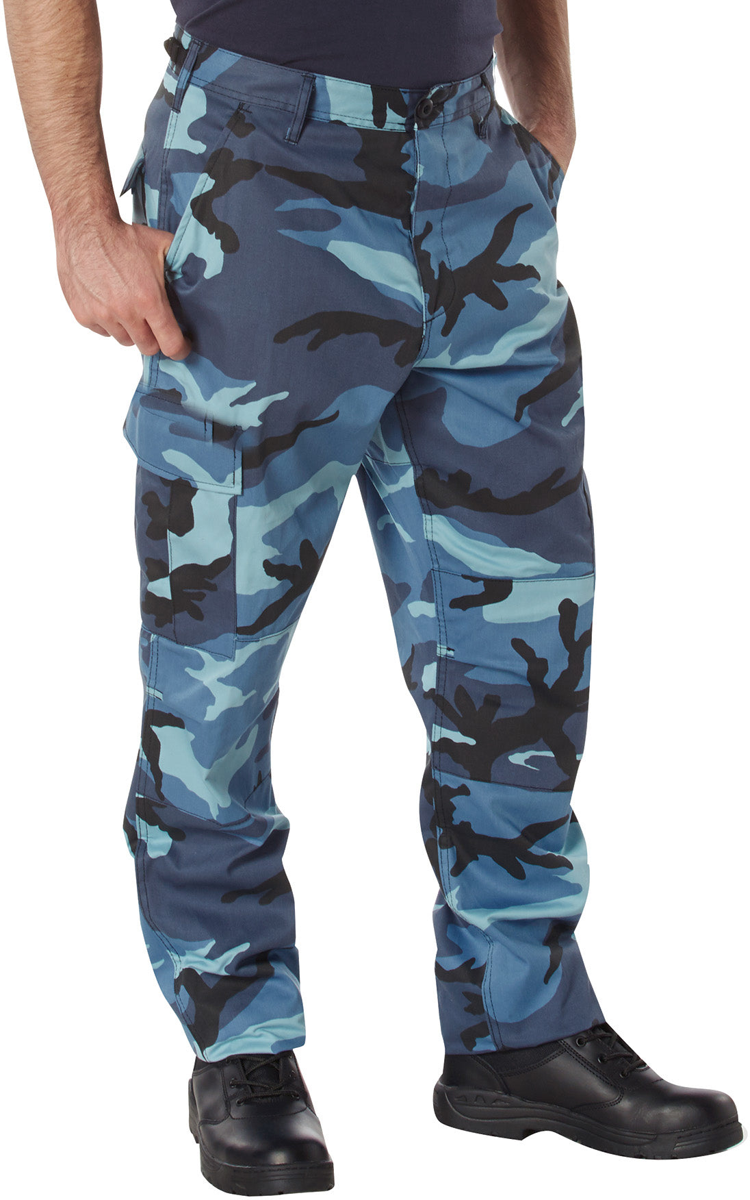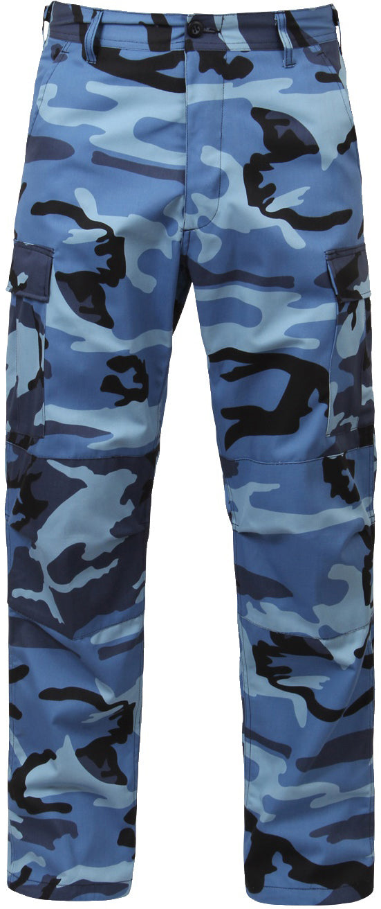 The BDU (Battle Dress Uniform) trouser is an iconic pair of pants, once used by the US military and many others. The BDU trousers are worn today as a fashion statement, for sports such as air soft and paintball, for use by law enforcement personnel and a wide range of military's. The sky blue camo polyester / cotton battle dress uniform pants are comfortable enough to be worn as casual pants or as part of a tactical uniform.