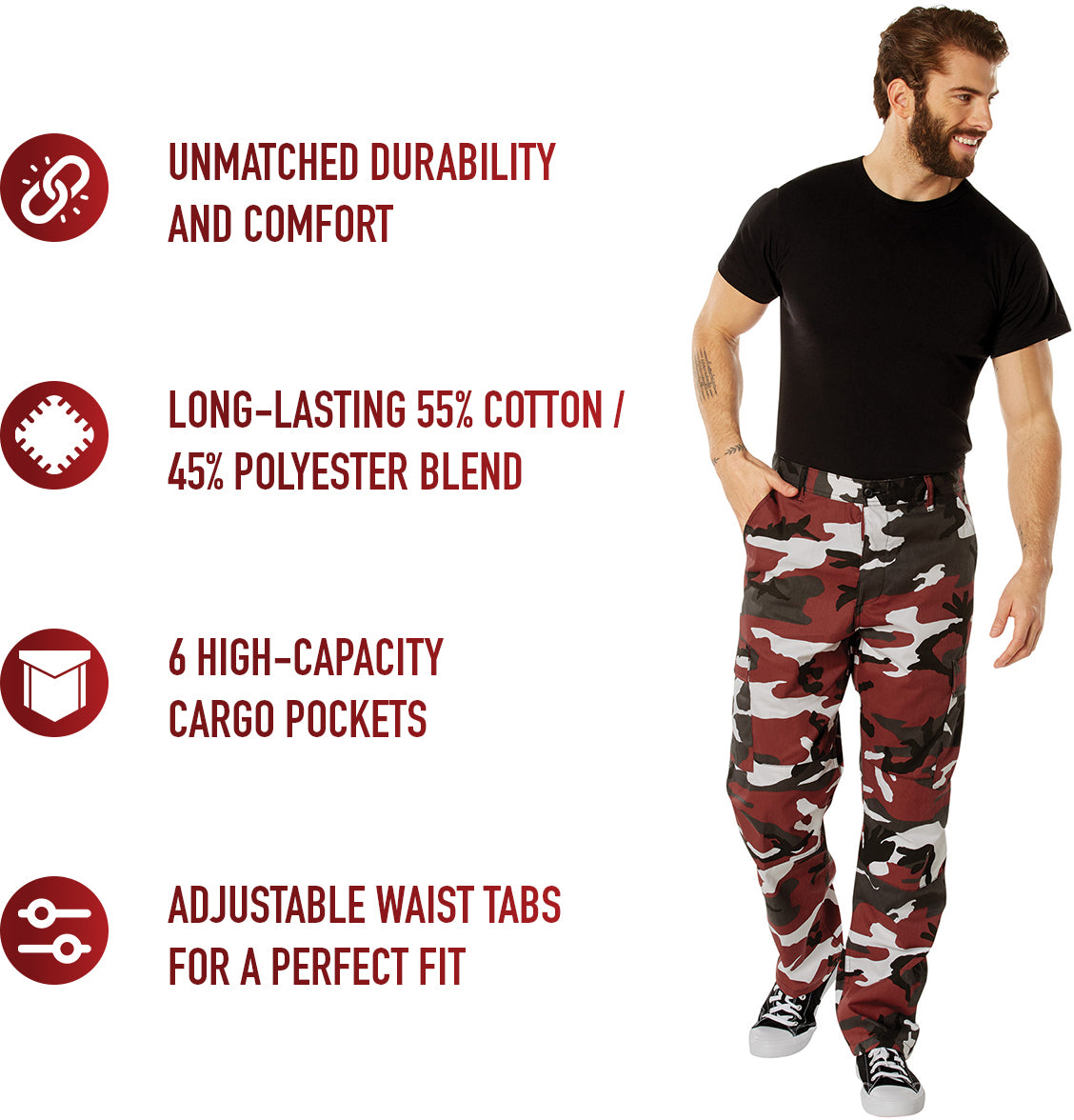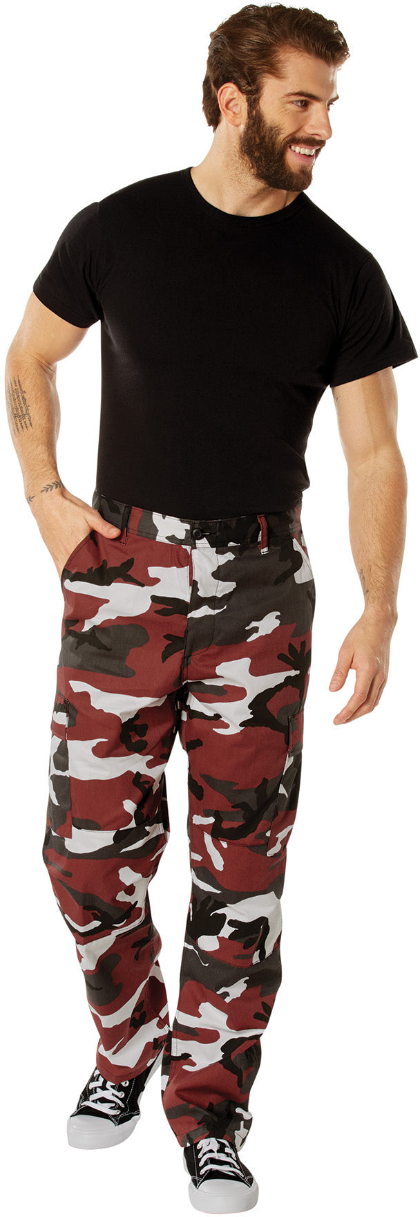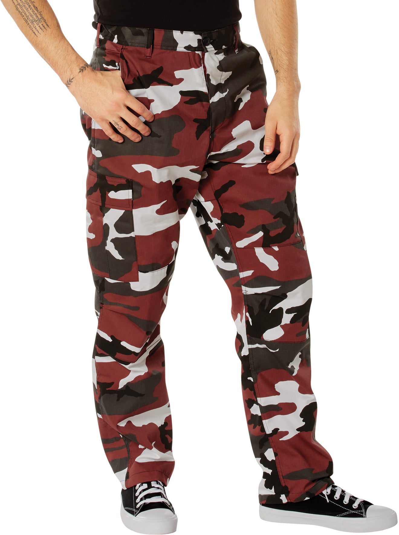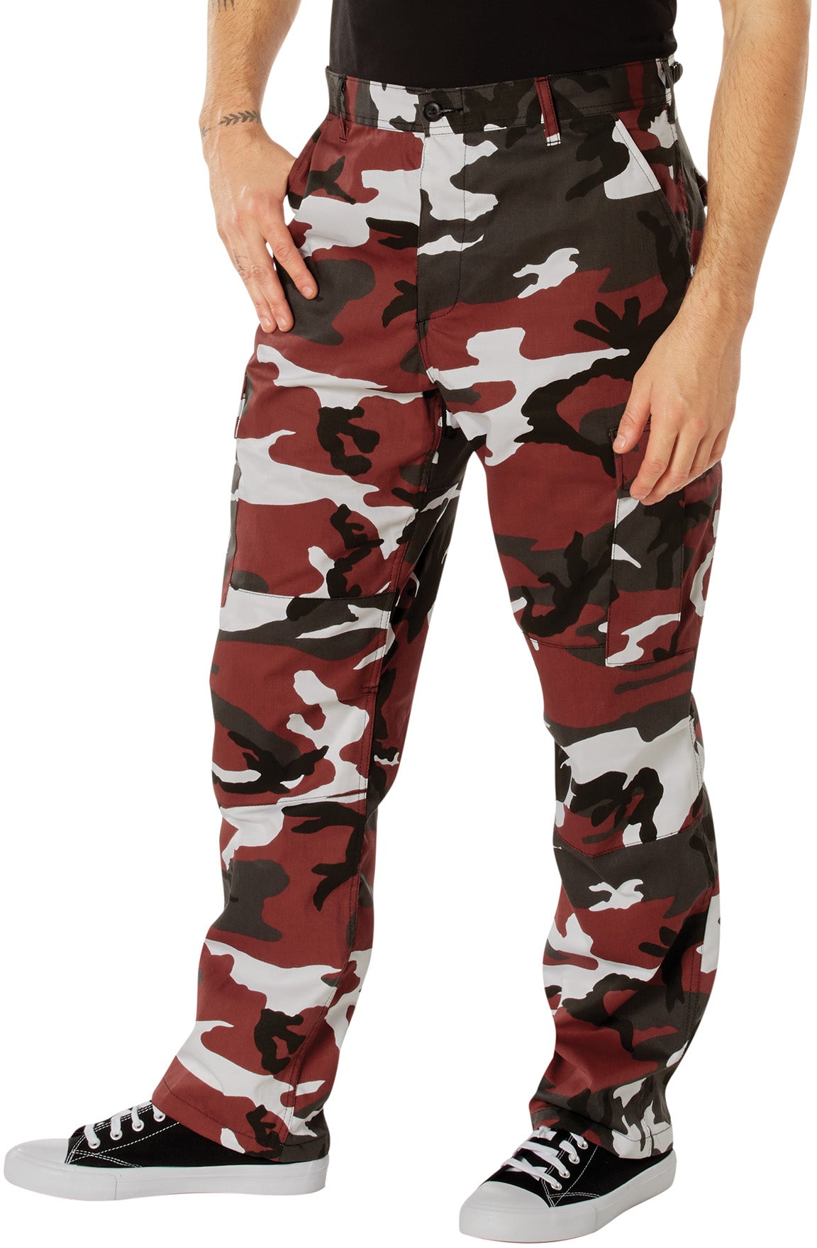 The BDU (Battle Dress Uniform) trouser is an iconic pair of pants, once used by the US military and many others. The BDU trousers are worn today as a fashion statement, for sports such as air soft and paintball, for use by law enforcement personnel and a wide range of military's. The red camo polyester / cotton battle dress uniform pants are comfortable enough to be worn as casual pants or as part of a tactical uniform.