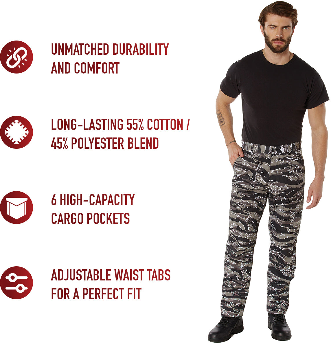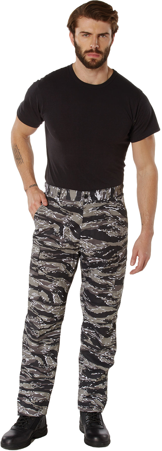 The BDU (Battle Dress Uniform) trouser is an iconic pair of pants, once used by the US military and many others. The BDU trousers are worn today as a fashion statement, for sports such as air soft and paintball, for use by law enforcement personnel and a wide range of military's. The urban tiger stripe camo polyester / cotton battle dress uniform pants are comfortable enough to be worn as casual pants or as part of a tactical uniform.