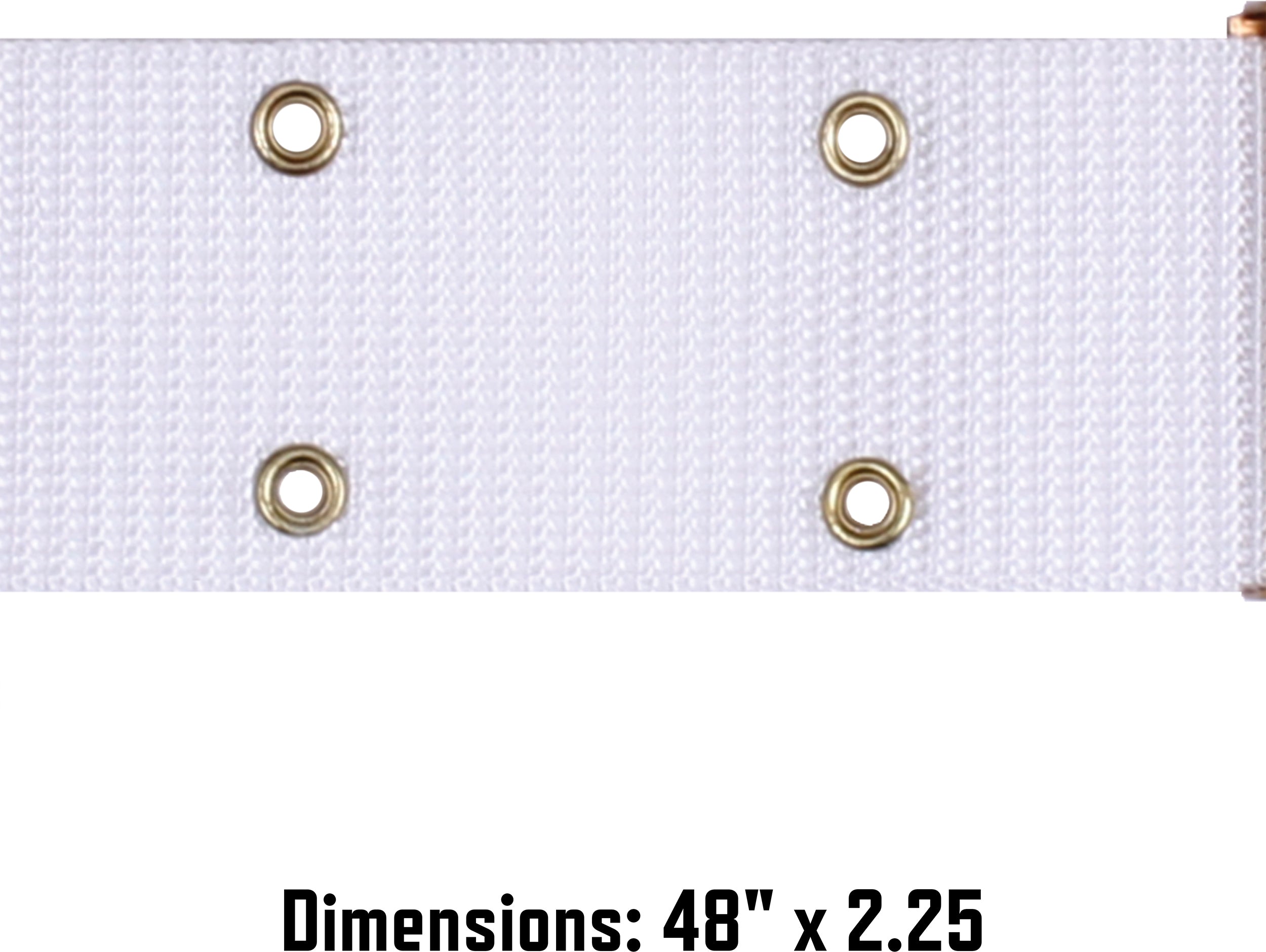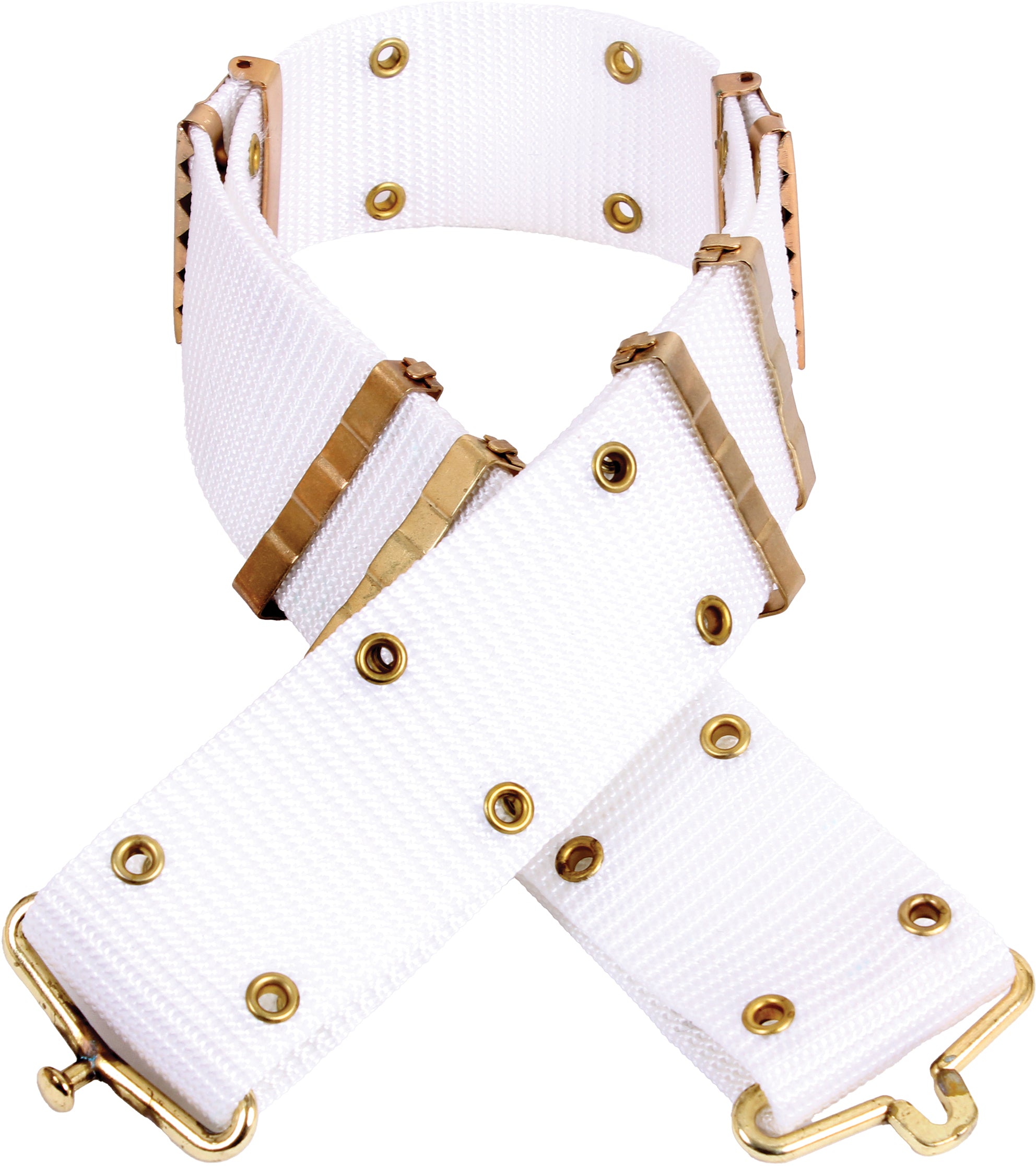 Heavy duty nylon material. Adjustable belt. Gold colored brass buckle and hardware. Grommets with eyelets to mount old style belt. Individually polyester bagged. Very stylish and comfortable. Extremely durable. Unisex. Fits BDU pants and many others. With iron fitting and buckle. Army style. GI Government Issued style. White nylon pistol belt with brass metal buckle. Description: 48 inches x 2.25 inches.