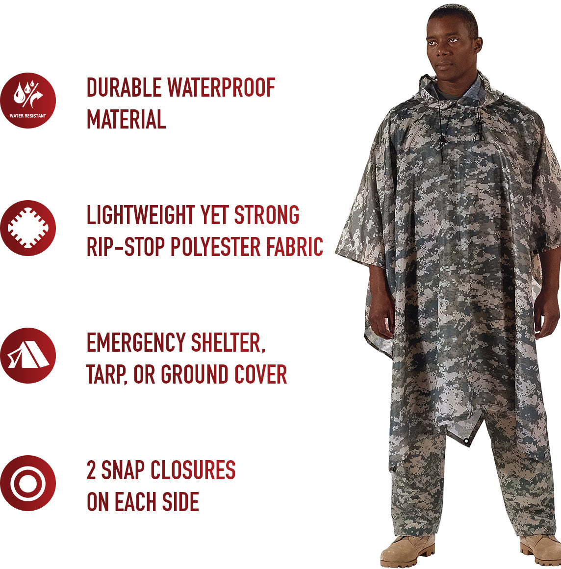Made of 100% polyester ripstop. Durable and waterproof construction. Snaps closures on each side for double protection. Grommeted corners for use as emergency shelter. Elongated hood with under-chin ties. Government issue style. Military specification with enhanced quality and construction. ACU Digital Camouflage GI army poncho (polyester rip-stop). Dimensions: 56" x 90" (inches).