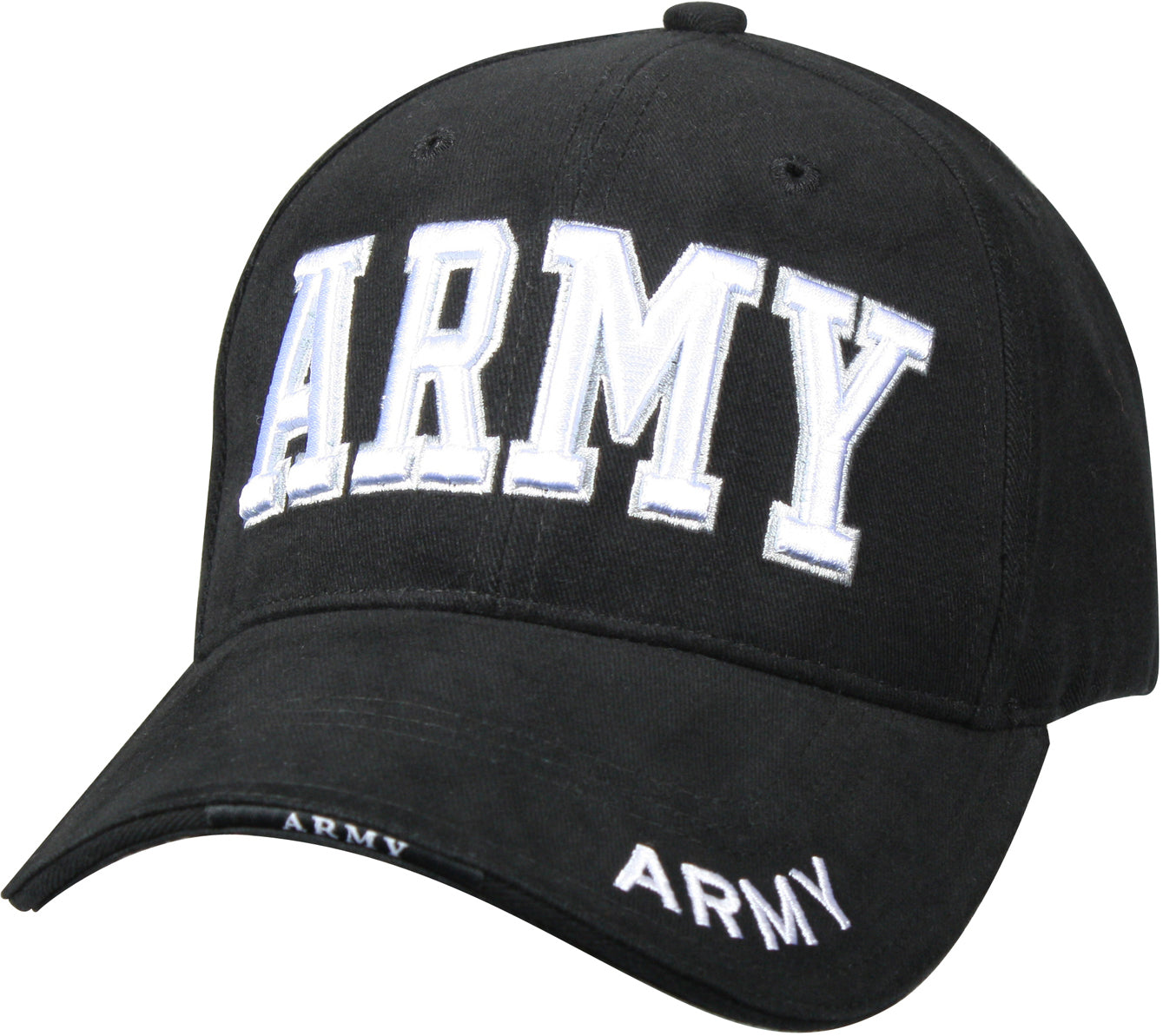 100% brushed cotton twill. Cap color is black - raised embroidery lettering is white. Sandwich brim with 1 piece woven label. Hook and loop tape closure with 1 piece woven label. Front panel with Army raised embroidery. Upper brim with Army direct embroidery. Black - Army deluxe low profile cap.