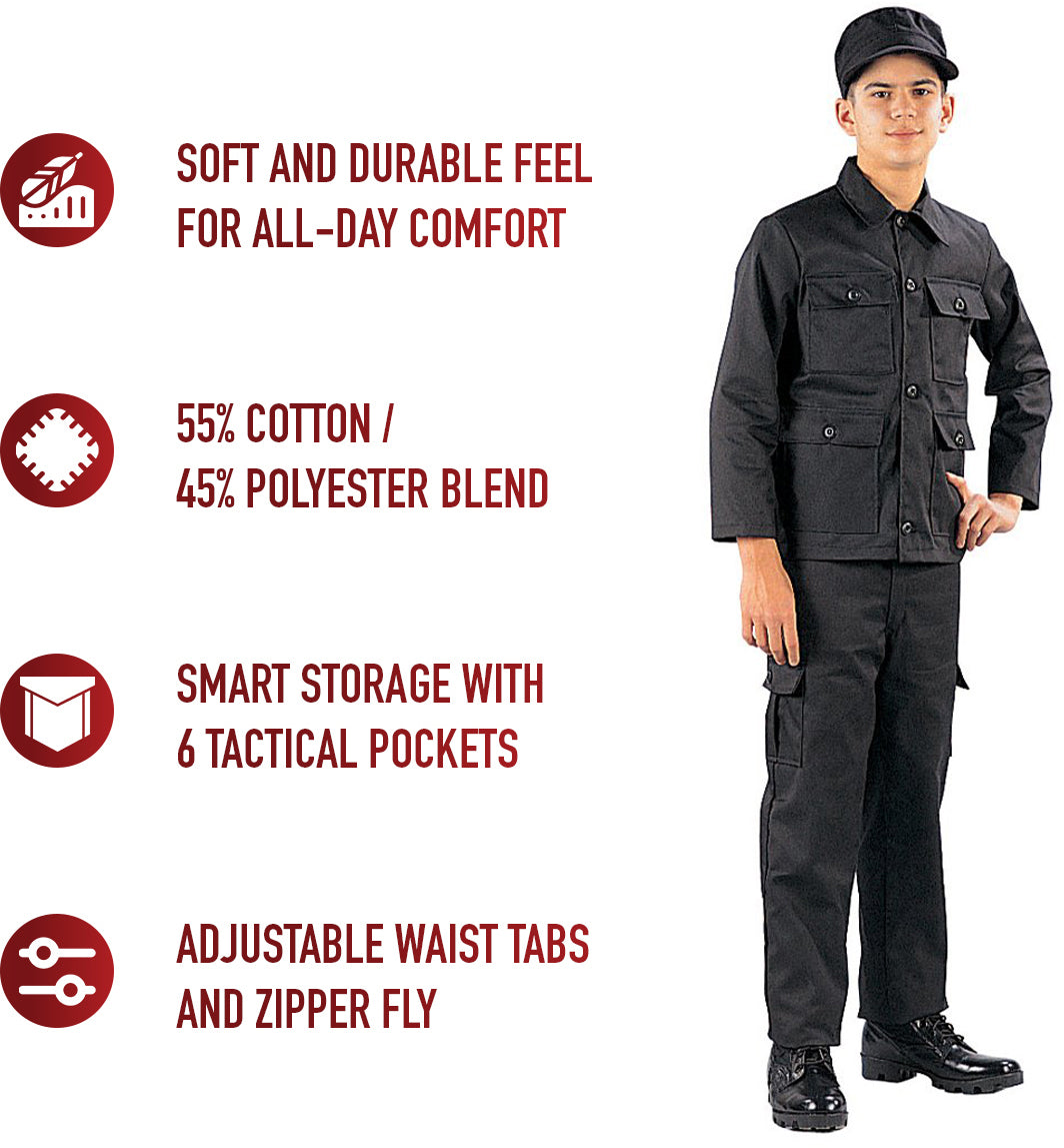 | Product | Black - Tactical BDU Cargo Pants - Poly/Cotton Twill - Zipper Fly - Kids |