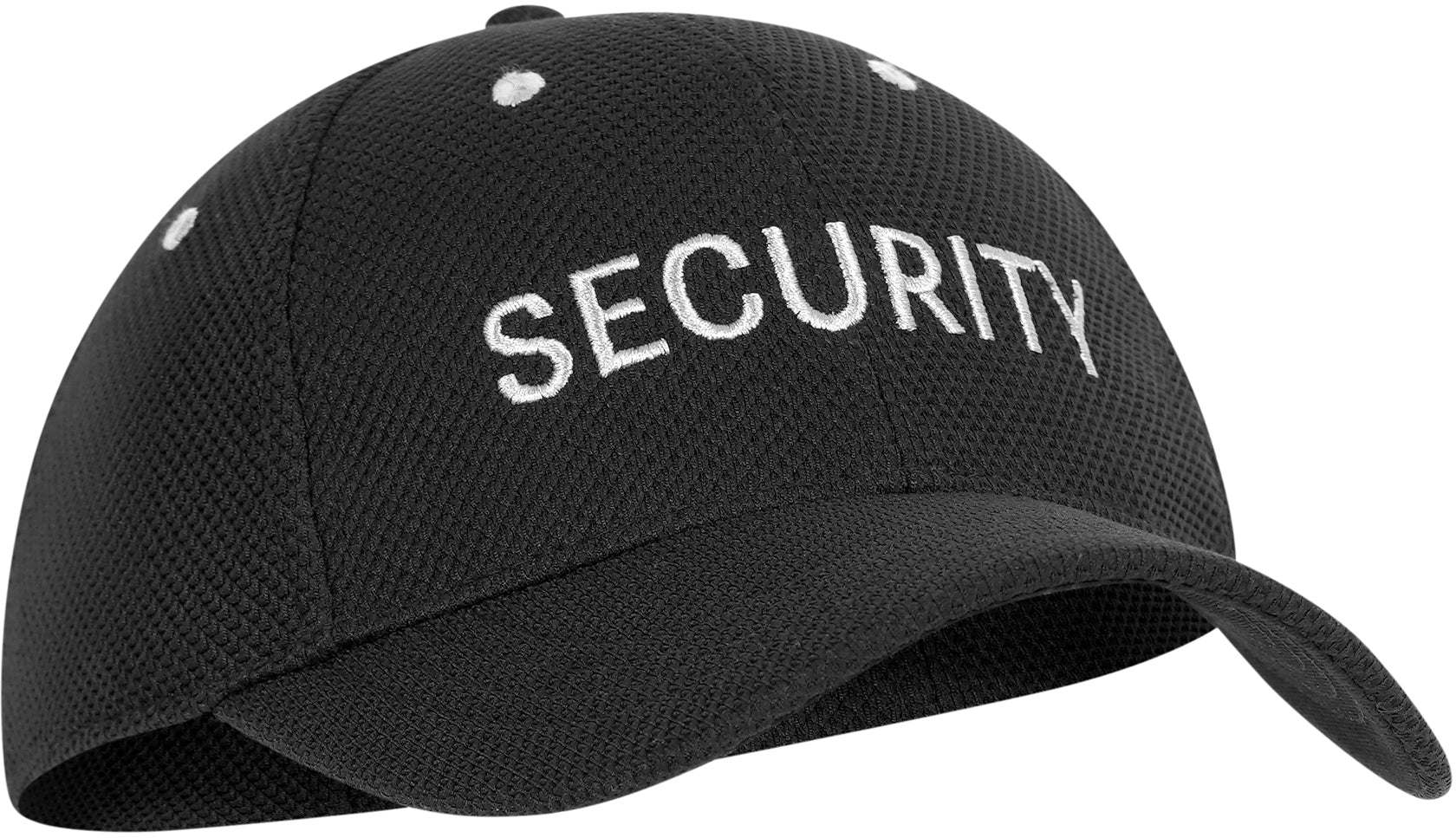 100% Polyester, mesh material. One size fits most. Silver embroidered Security lettering. Hook & loop closure. Black insignia cap with white lettering on the front. Black Air Mesh Low Profile Security Cap.