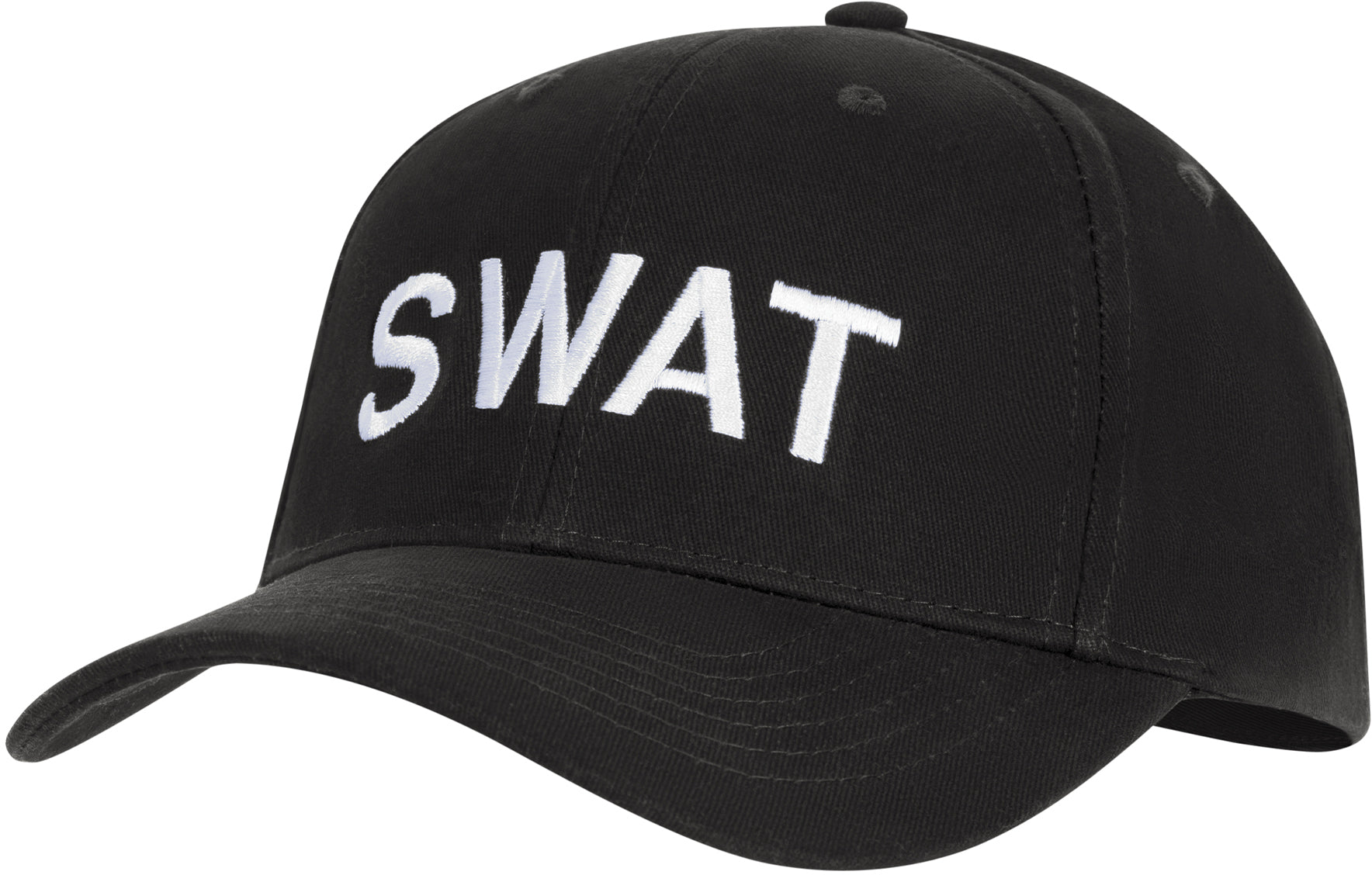 Comfortable brushed cotton twill. One size fits most. Padded sweatband. T-sliding adjustable metal buckle. Embroidered insignia. Black insignia cap with white lettering on the front. Black SWAT lettering supreme low profile cap.