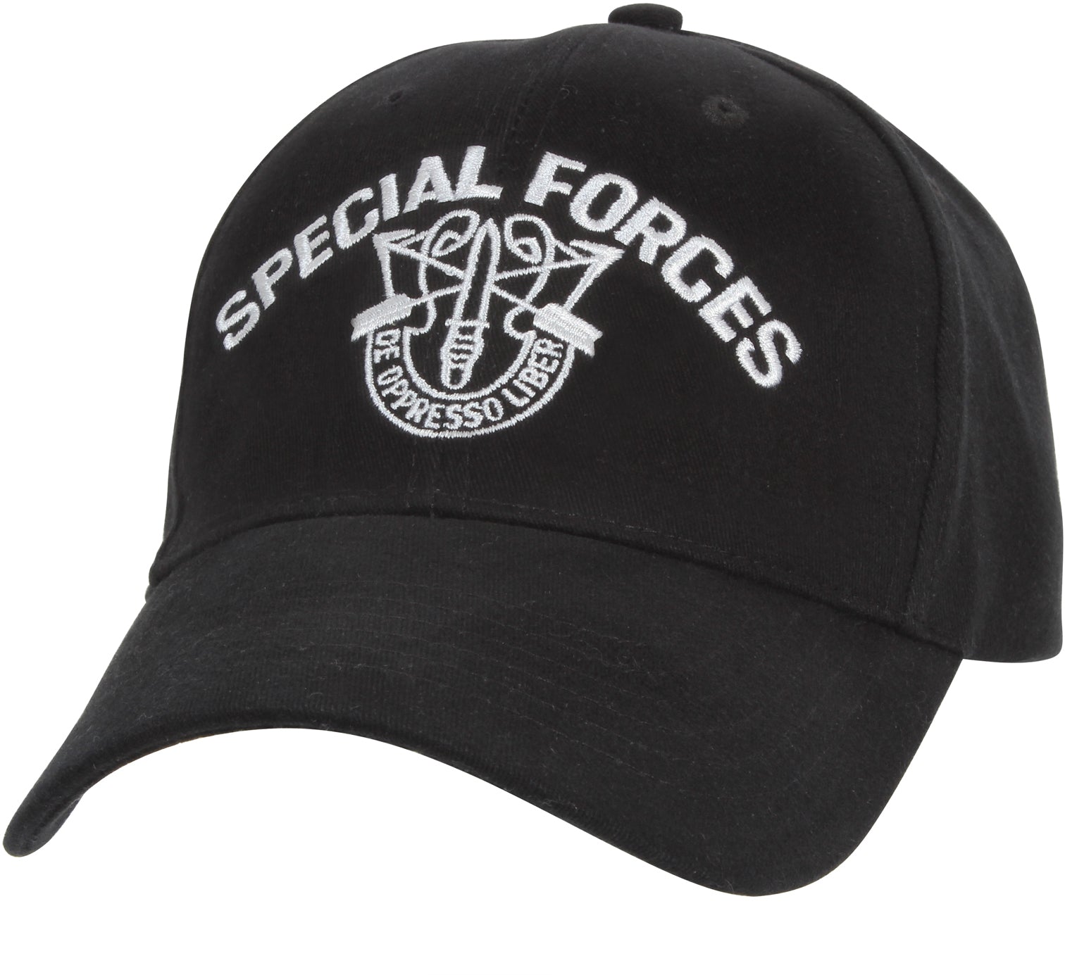 Comfortable brushed cotton twill. Unisex. One size fits most. Padded sweatband. T-sliding adjustable metal buckle. Embroidered insignia. Special Forces, Deoppressouber printed on front panel of hat. Special Forces logo pictured on front. Logo includes a knife with two arrows crossing through and meeting in the middle of knife. Supreme low profile insignia cap. Black - Special Forces low profile cap.