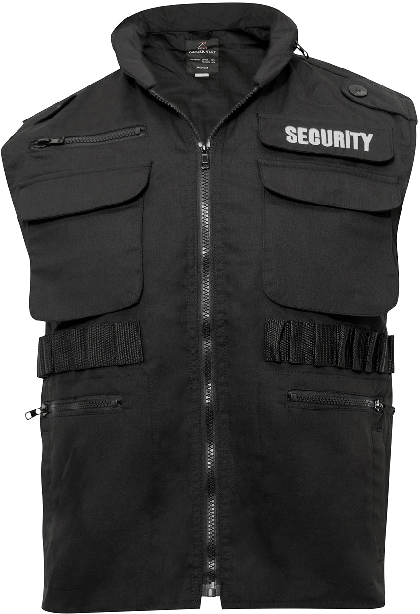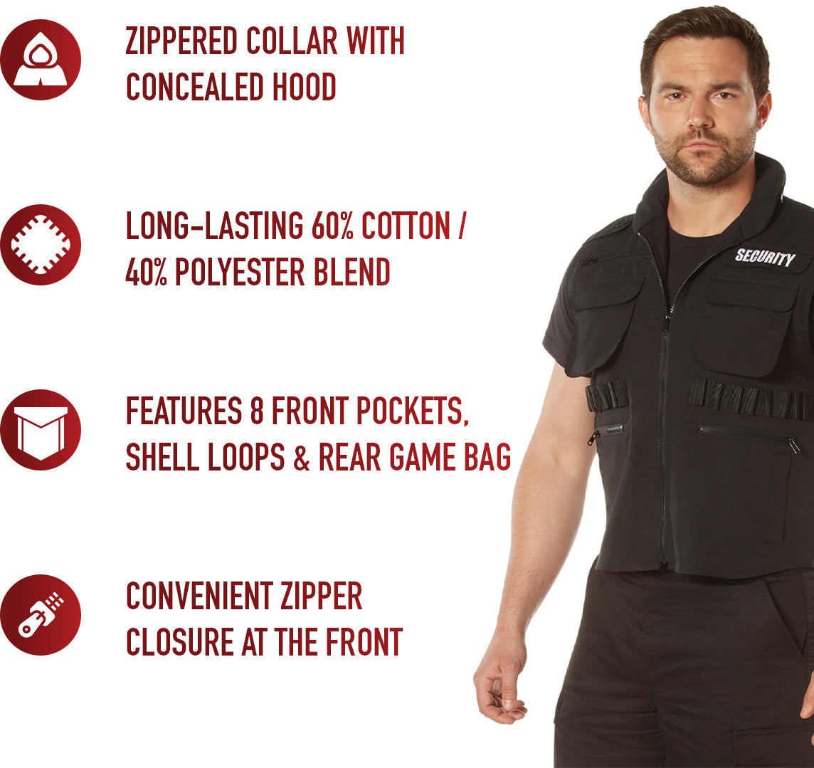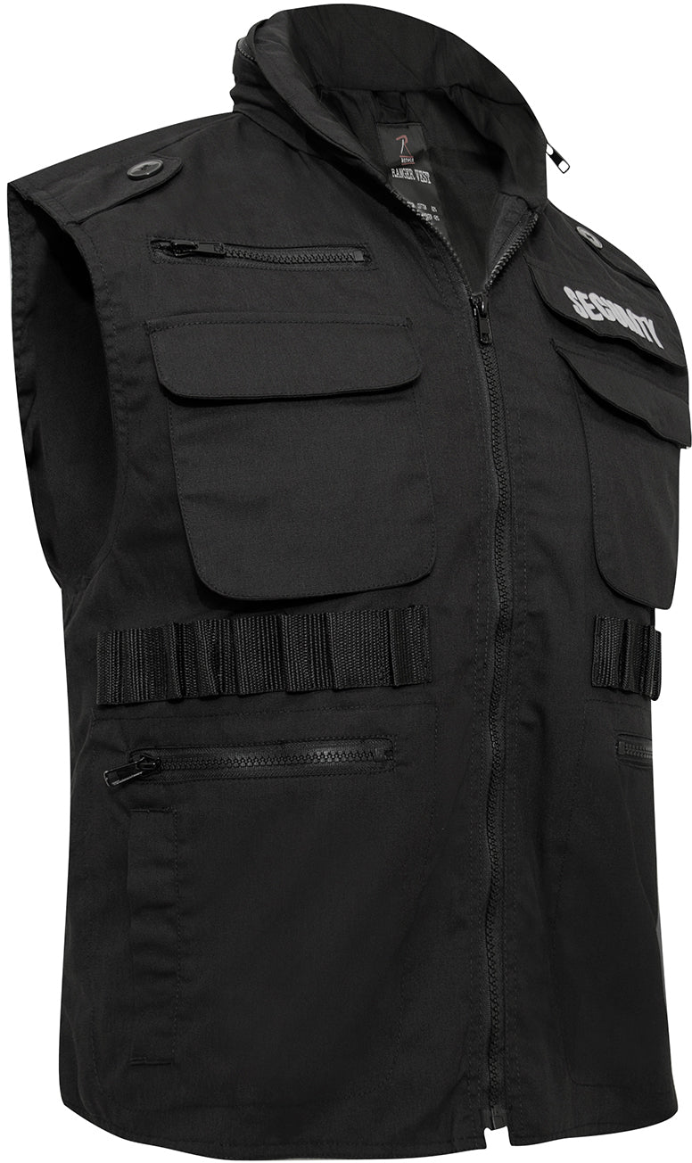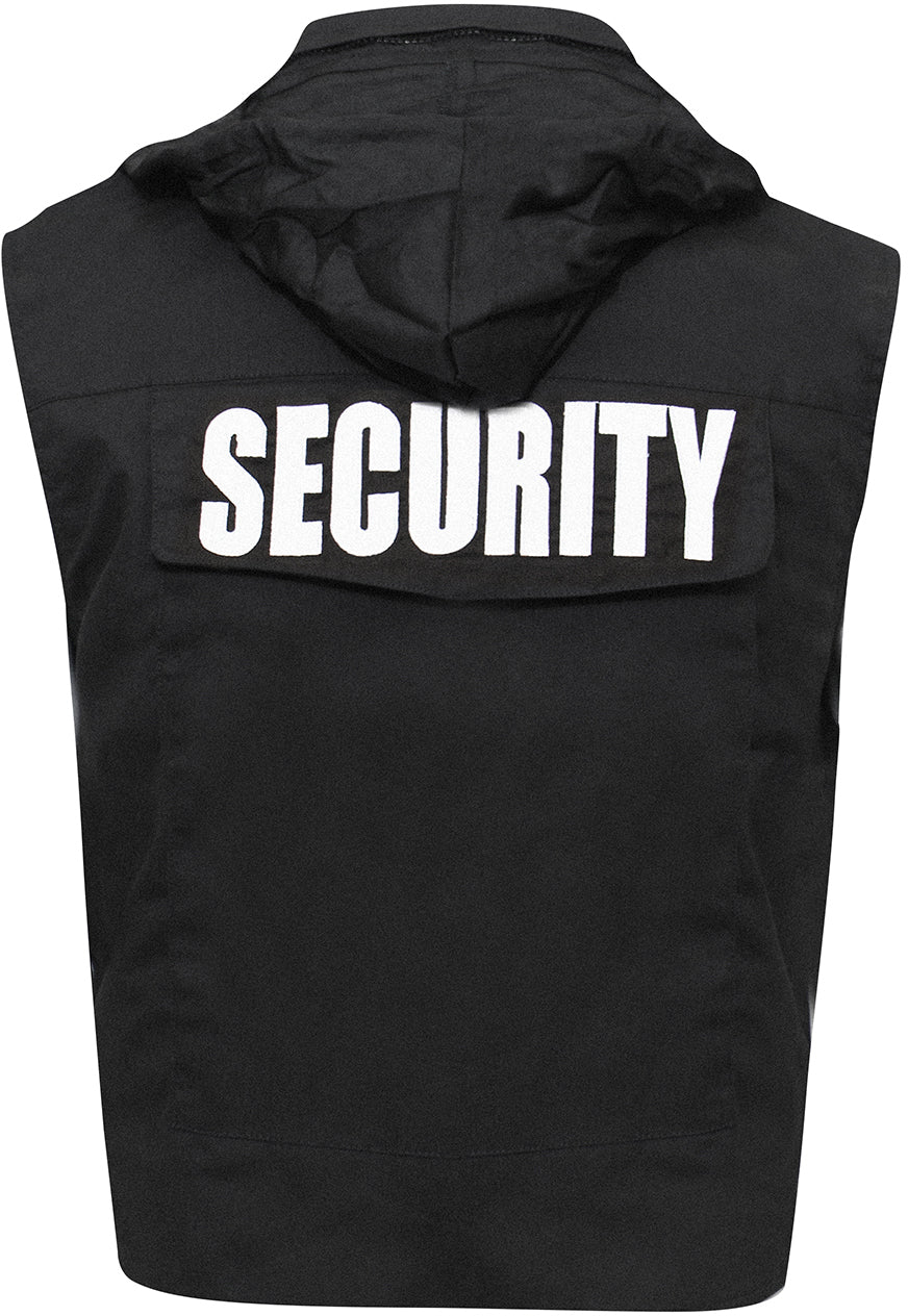 Made of polyester/cotton. "SECURITY" embroidered on back pocket flap and on top of left chest pocket flap in white. 8 front pockets total. 3 chest pockets with flap and single hook and loop closure. 1 chest pocket with zipper closure. 2 lower front pockets with zipper closure. 1 slash pockets on each side (2 total). Rear hook and loop game bag has flap with single hook and loop closure. Rear game bag is approximately 12" x 15". 8 shell loops on each side of the front of the vest. Zippered collar with concealed hood. Zipper front. Epaulets with single button on each shoulder. Black ranger vest.