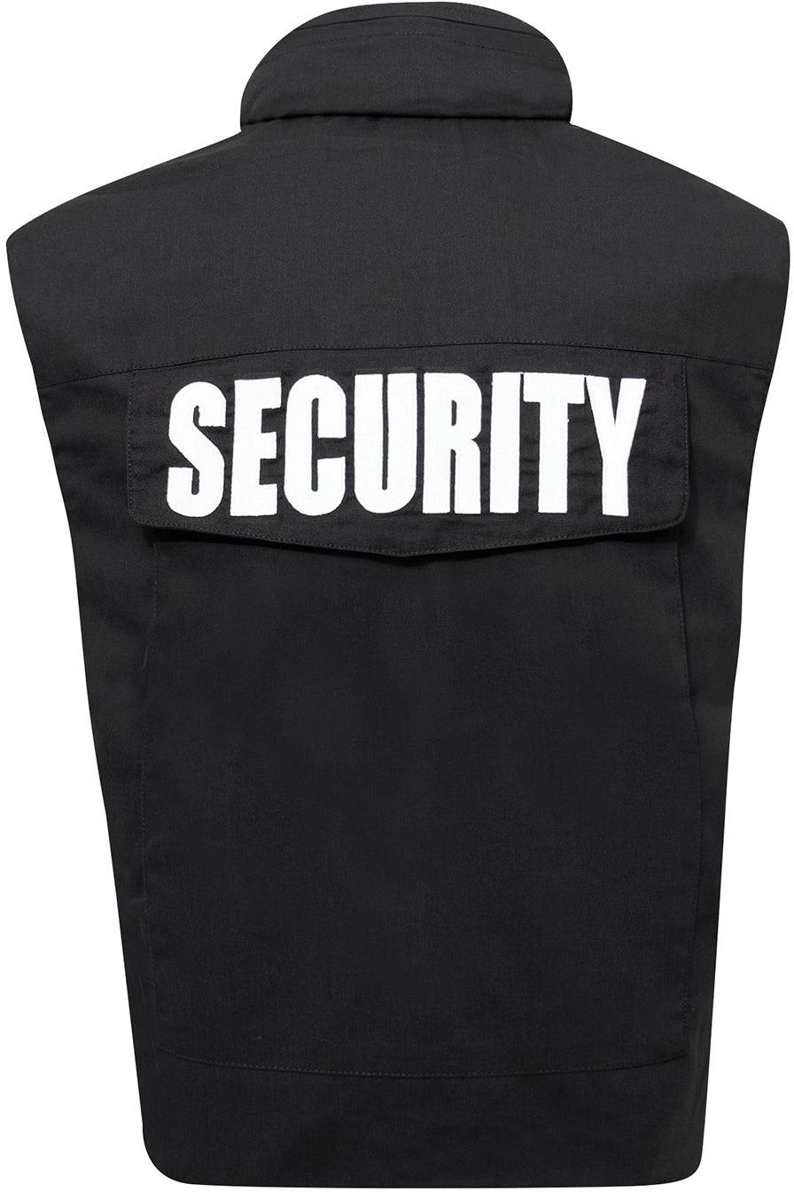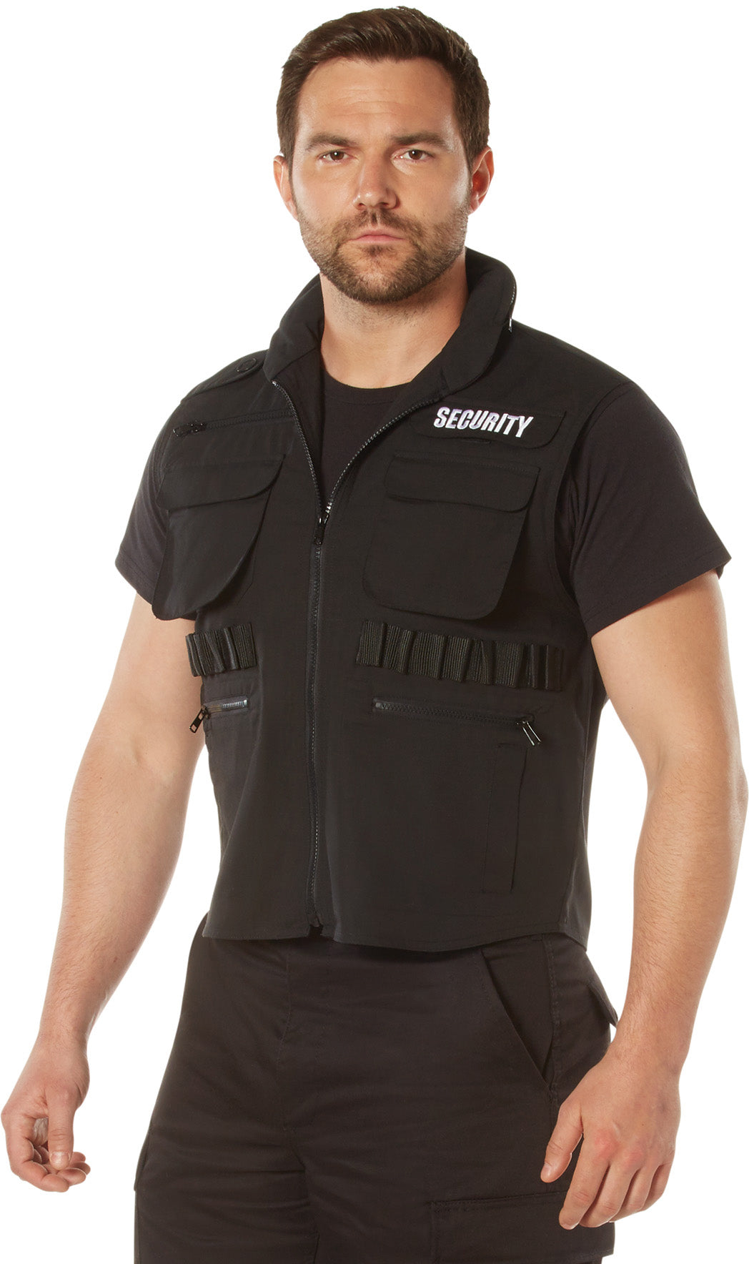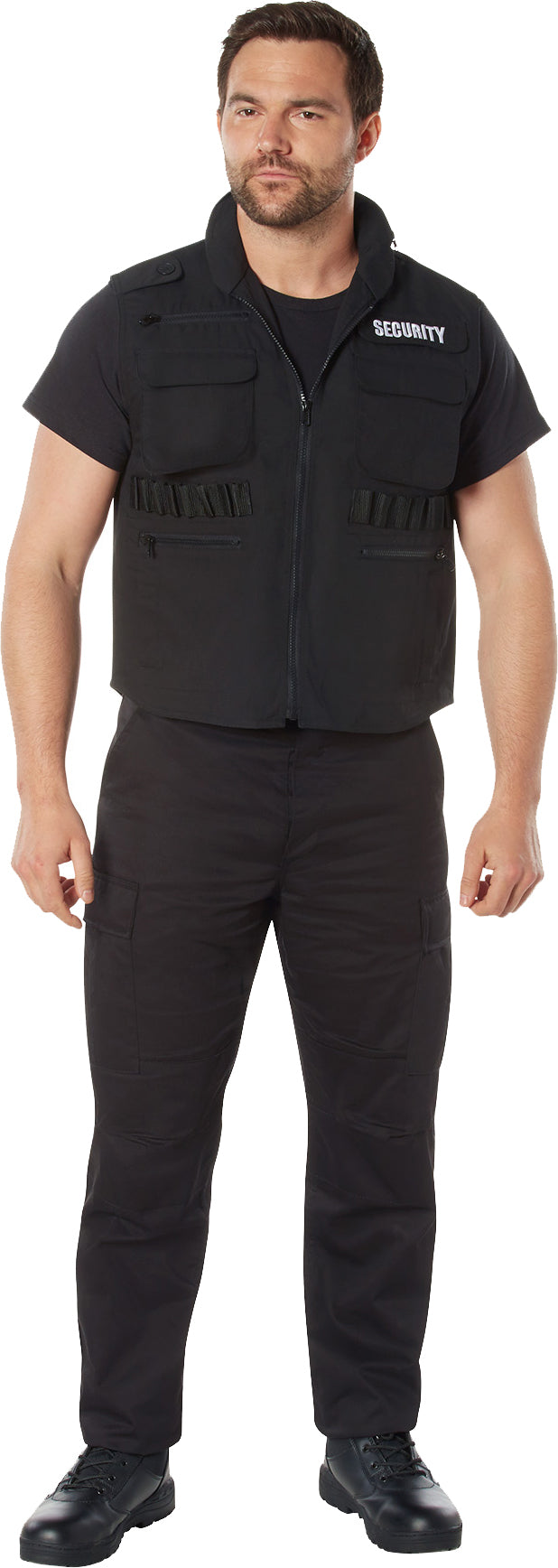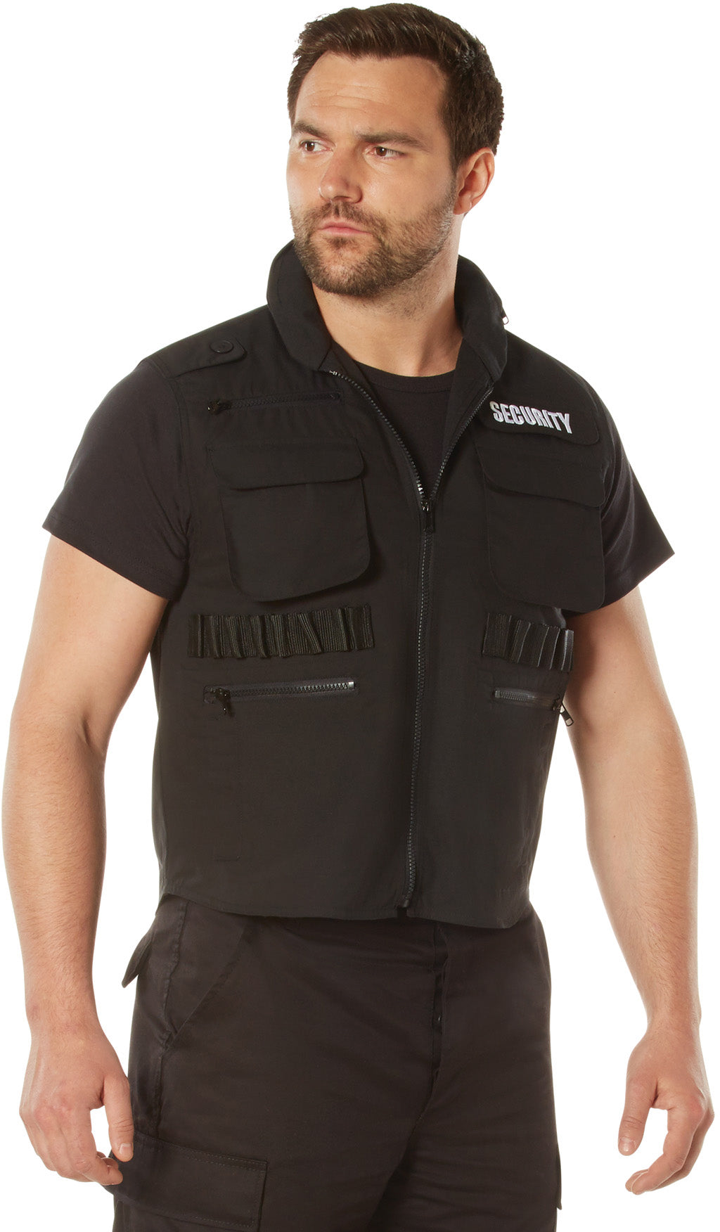 Made of polyester/cotton. "SECURITY" embroidered on back pocket flap and on top of left chest pocket flap in white. 8 front pockets total. 3 chest pockets with flap and single hook and loop closure. 1 chest pocket with zipper closure. 2 lower front pockets with zipper closure. 1 slash pockets on each side (2 total). Rear hook and loop game bag has flap with single hook and loop closure. Rear game bag is approximately 12" x 15". 8 shell loops on each side of the front of the vest. Zippered collar with concealed hood. Zipper front. Epaulets with single button on each shoulder. Black ranger vest.