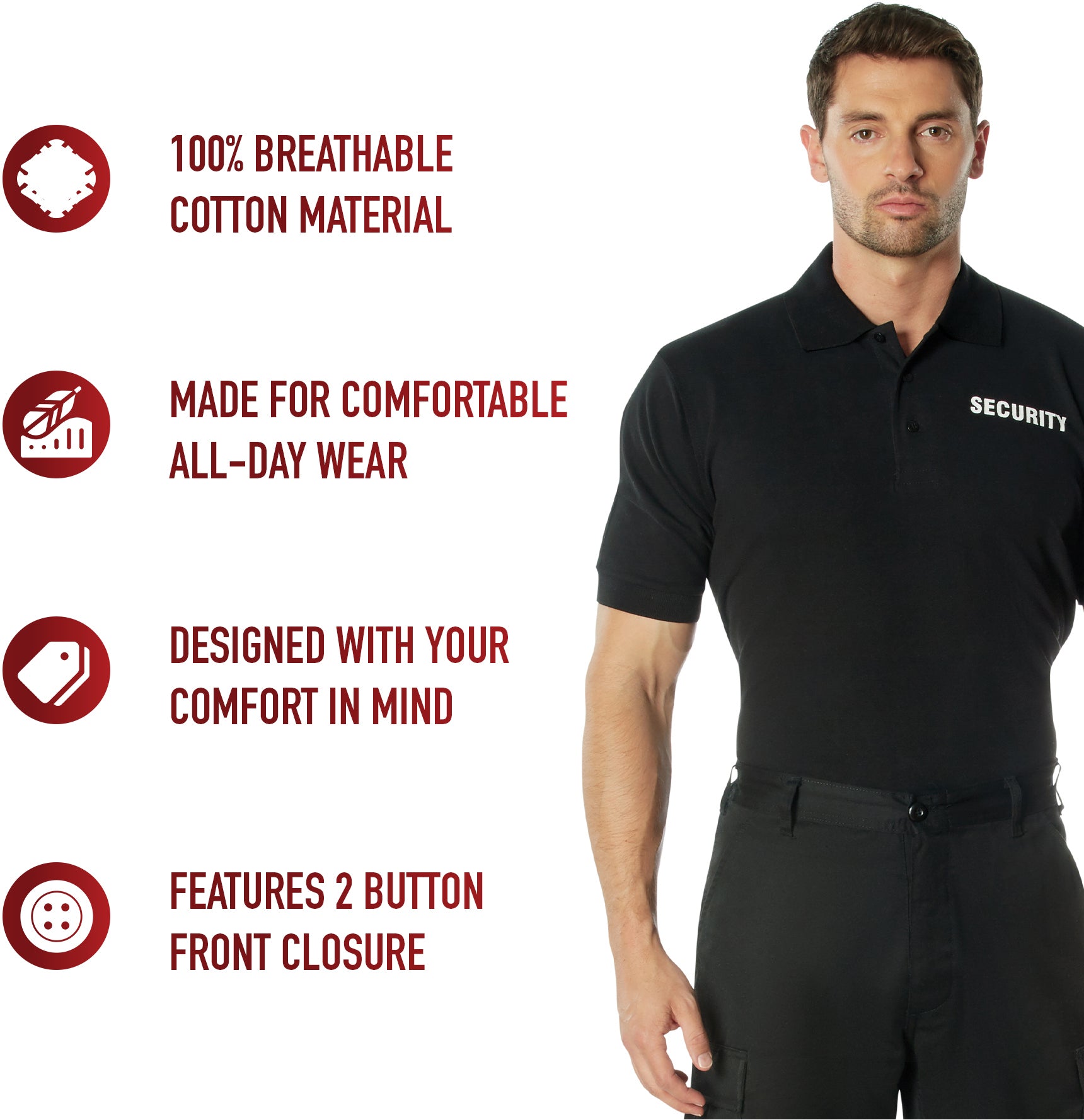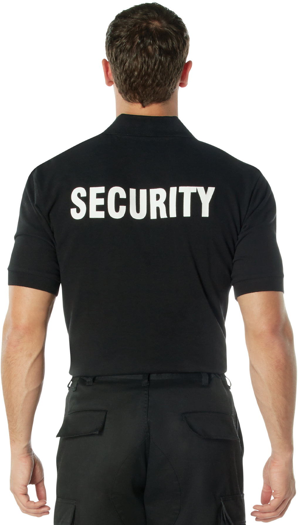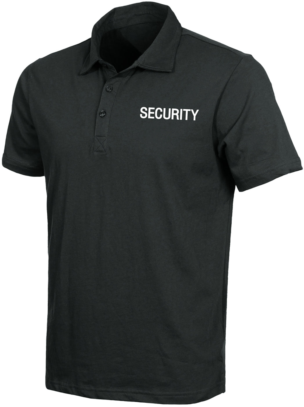 100% cotton material. Black polo style shirt with white security lettering print. 2 sided print. 3 button closure front. Full size cut.