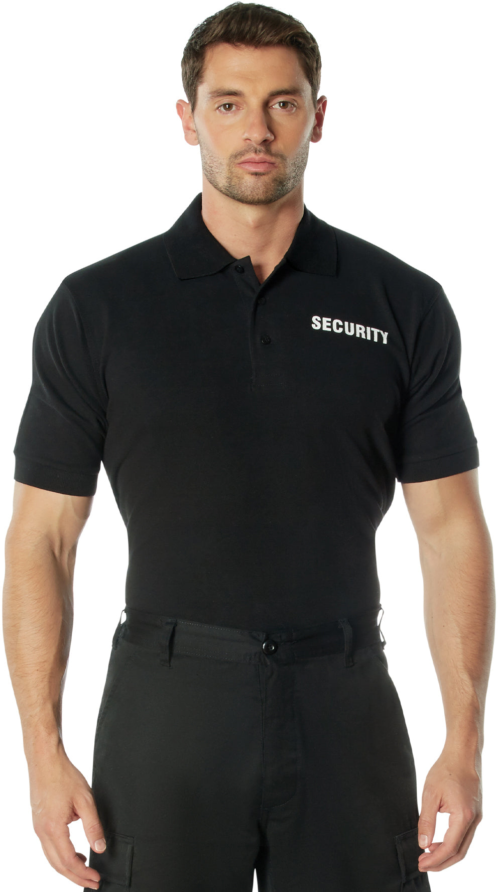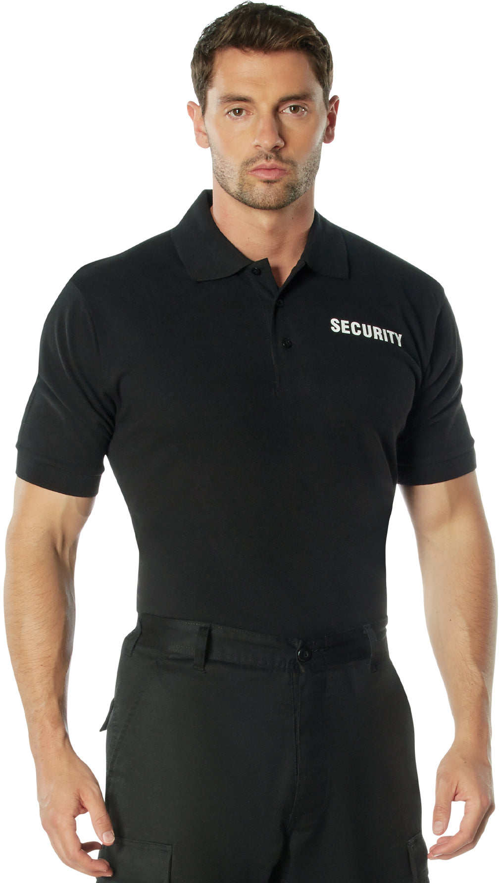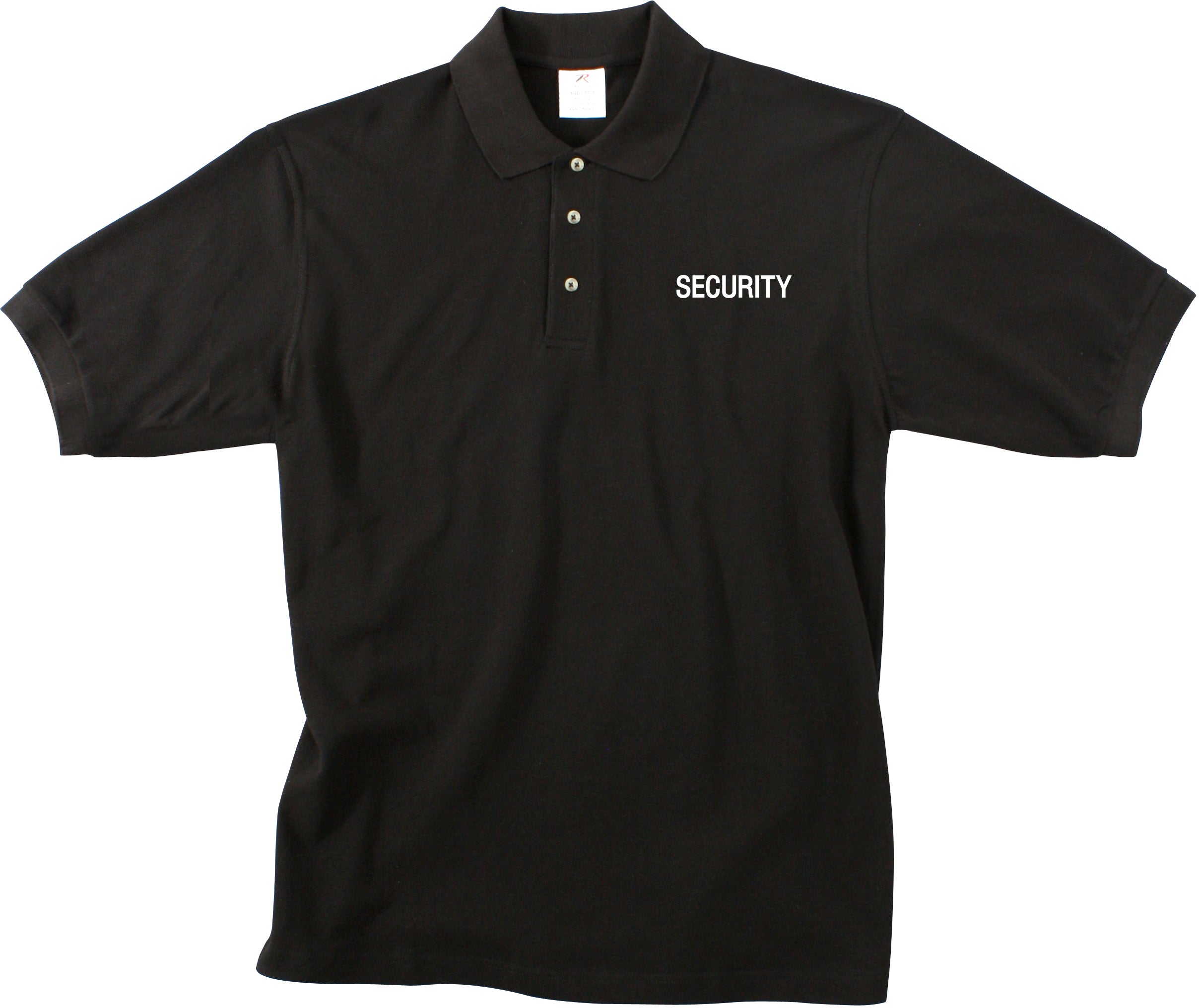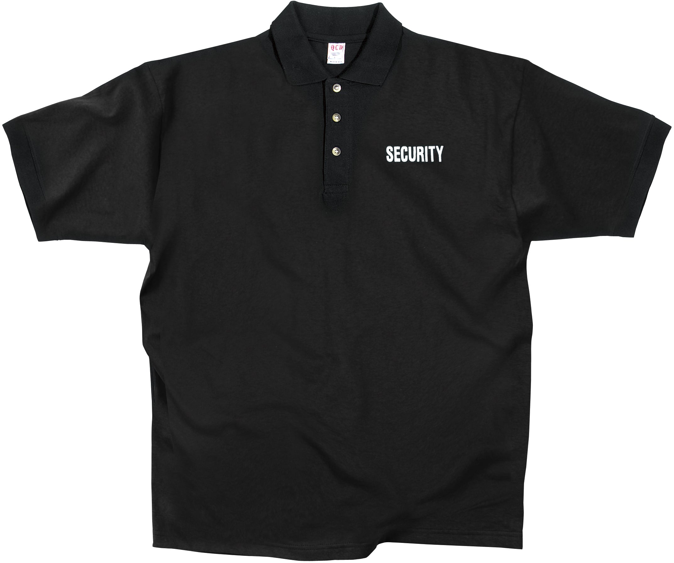 100% cotton material. Black polo style shirt with white security lettering print. 2 sided print. 3 button closure front. Full size cut.
