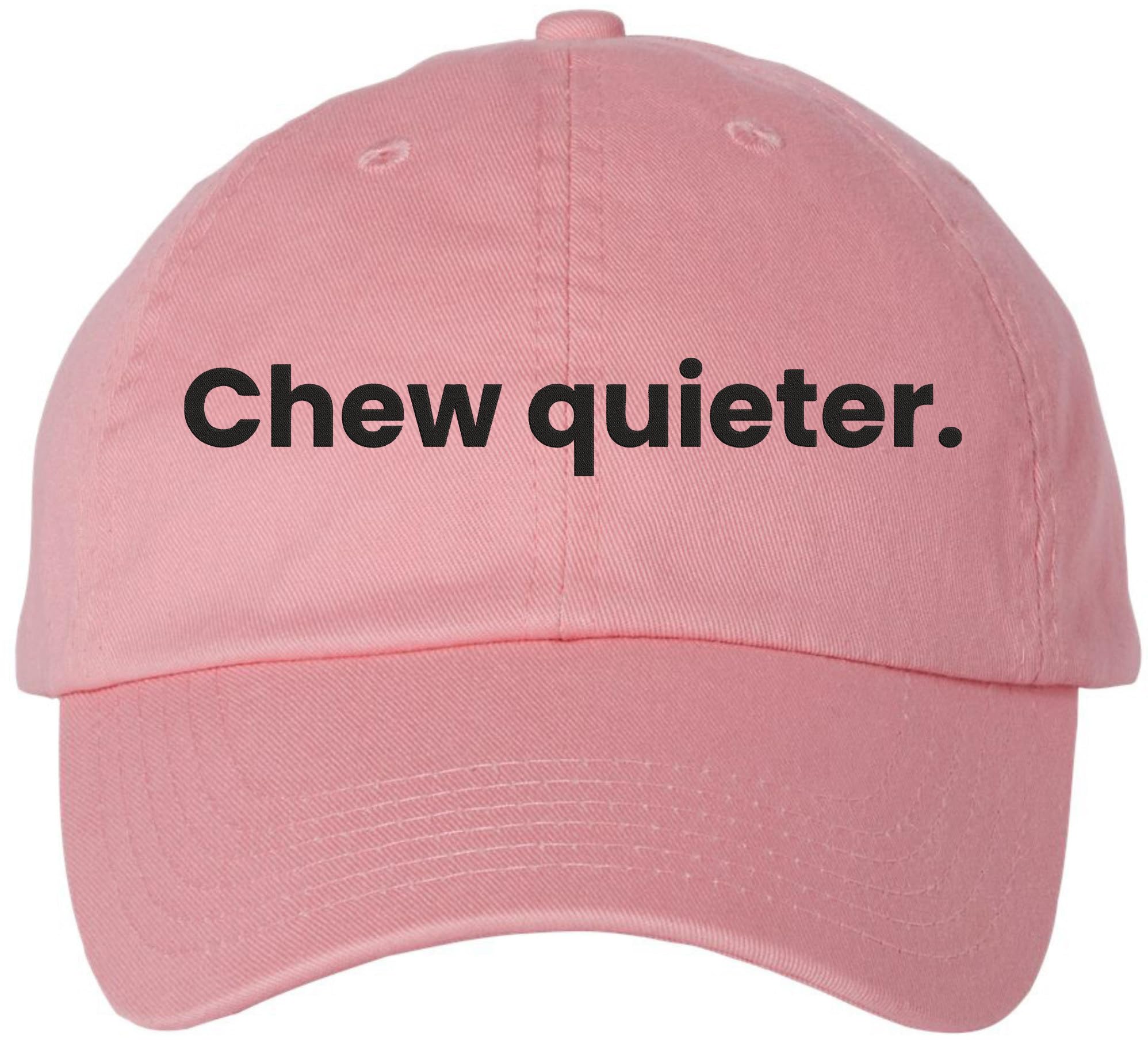 The "Chew Quieter." Embroidered Baseball Cap is the perfect blend of sarcasm, style, and comfort—ideal for introverts, humor lovers, and anyone tired of loud chewers. Made from 100% breathable cotton with an adjustable tri-glide buckle, this unstructured dad hat offers a relaxed fit for everyday wear. Whether you're running errands, lounging at a café, or throwing subtle shade at a dinner table, it adds a snarky twist to any outfit. Proudly embroidered in the USA, it makes a great gift for friends, coworkers, or yourself. Minimalist in design but bold in message, this cap is your go-to for funny, passive-aggressive fashion.