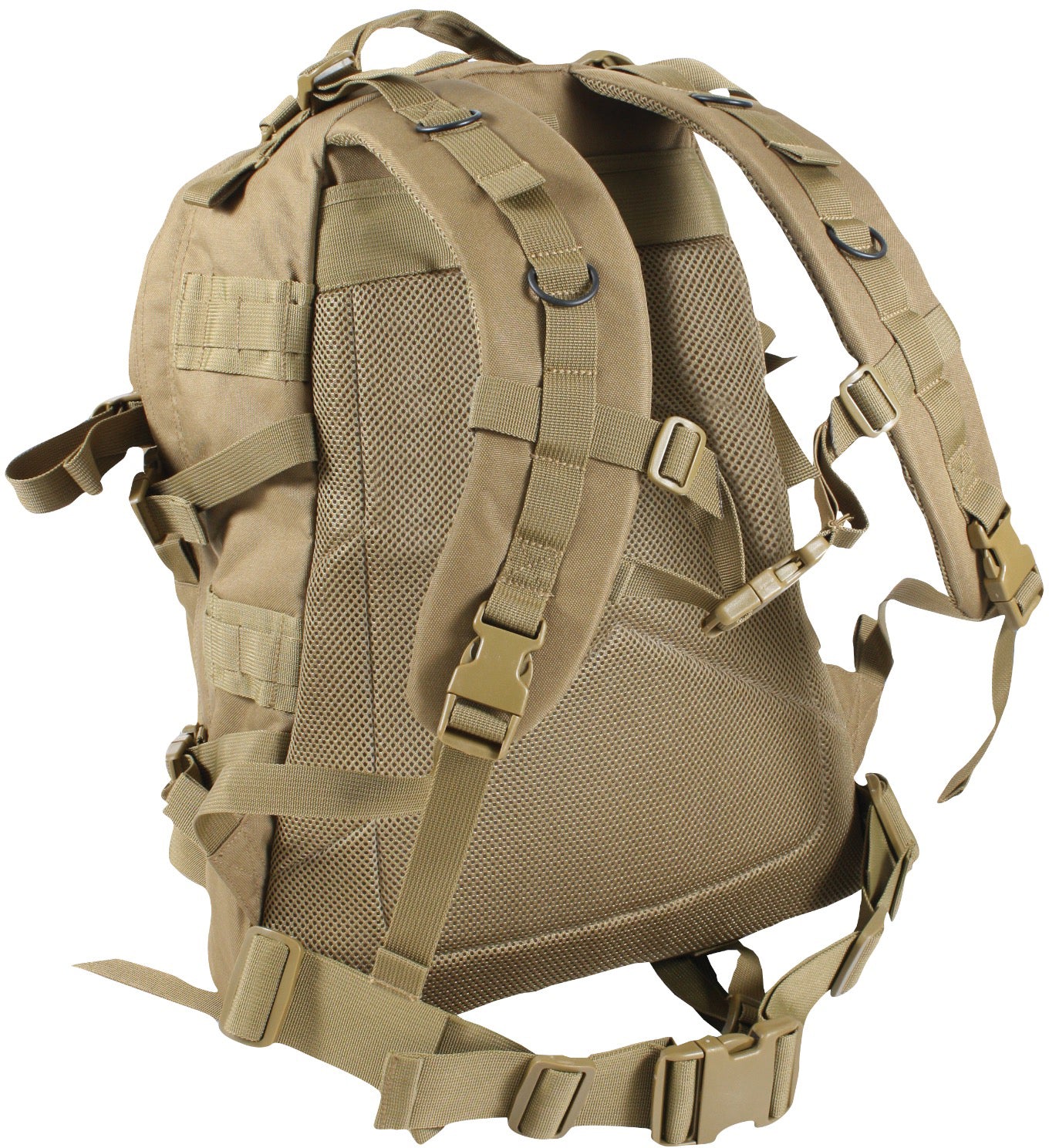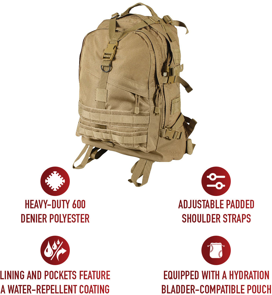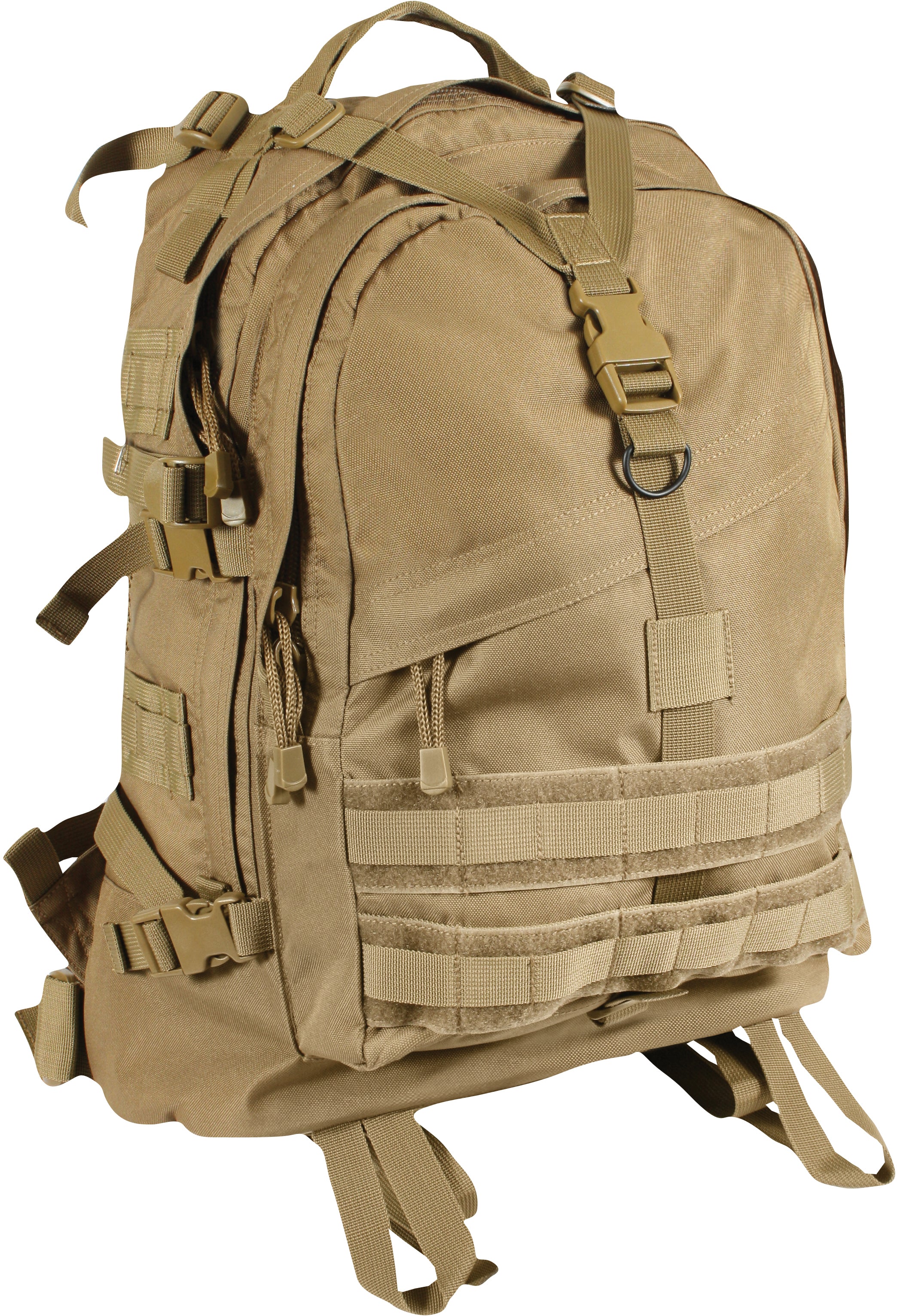 Made of heavyweight 600 Denier Polyester. PU (Polypropylene) Webbing. MOLLE compatible. Hydration bladder compatible. Waterproof bottom. Heavy duty zippers. Polyurethane coated lining and pockets for water repellency. 1 large main compartment with interior mesh zippered pocket. Front zippered compartment with exterior zippered pouch. Adjustable and removable waist belt. Adjustable padded shoulder straps with D-Rings. Padded back with breathable mesh backing. Top carry handle. Top & side adjustable web straps with quick release belt buckles. Size: 19" x 15" x 8". Great for school, camping, hunting, back packing, etc. GI Government Issued style. Coyote tan large transport pack. large tactical transport pack.