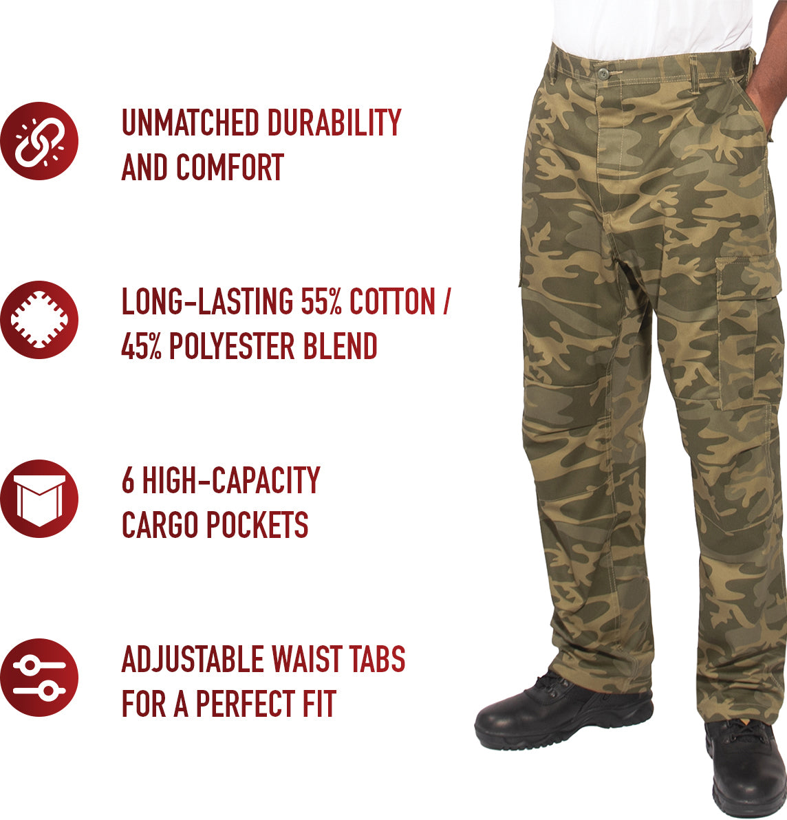 - Camo bdu pants are built to withstand wear and tear with long-lasting 55% cotton / 45% polyester material