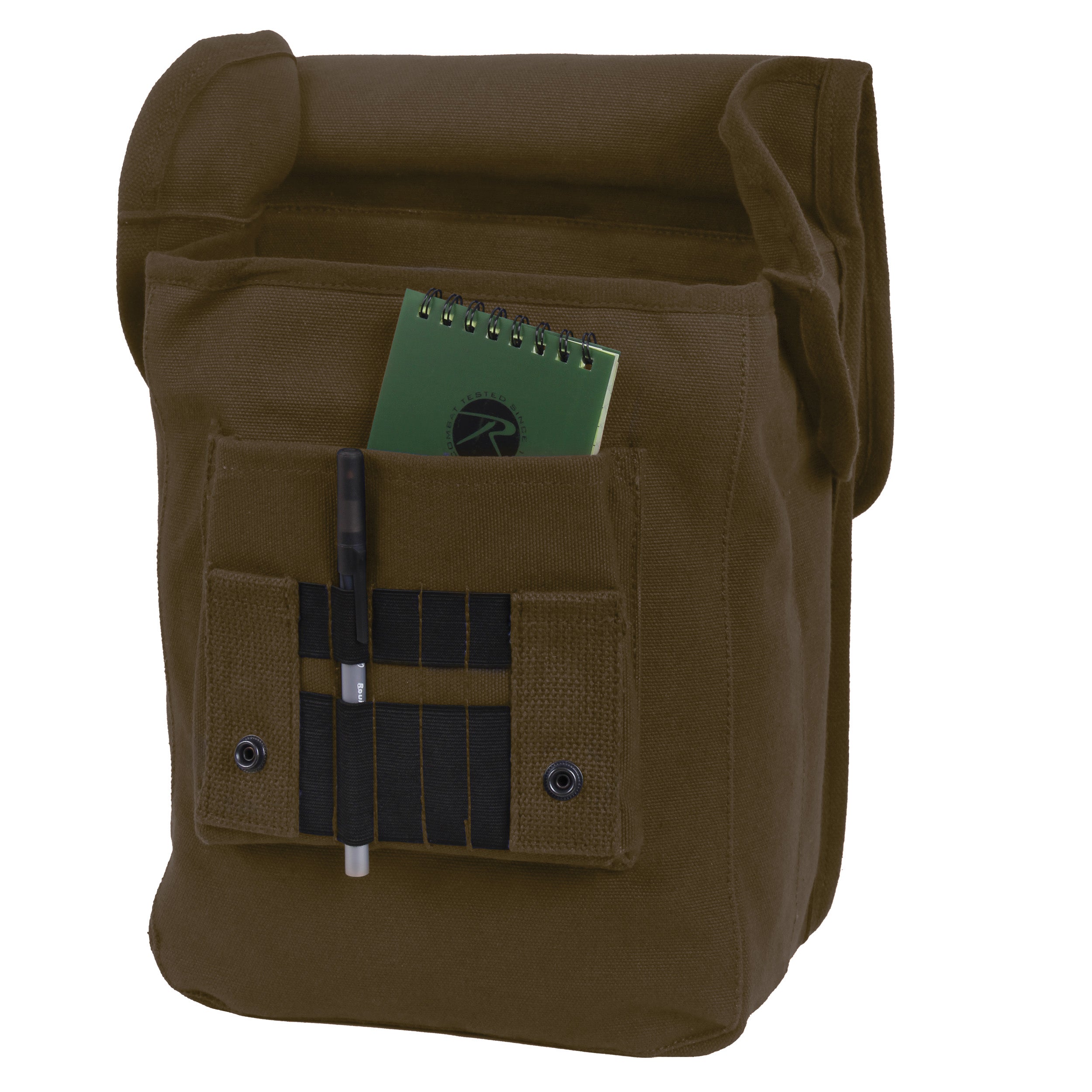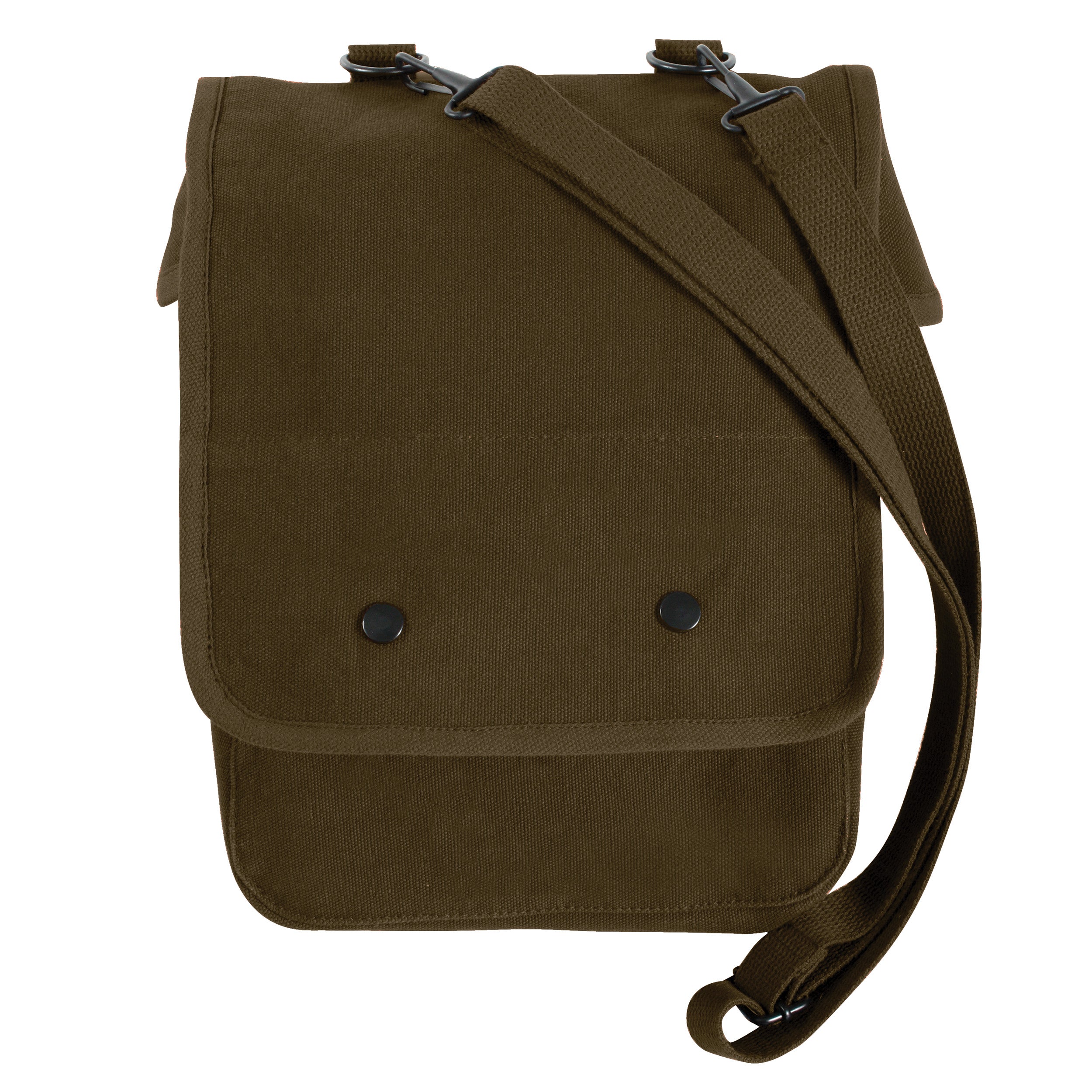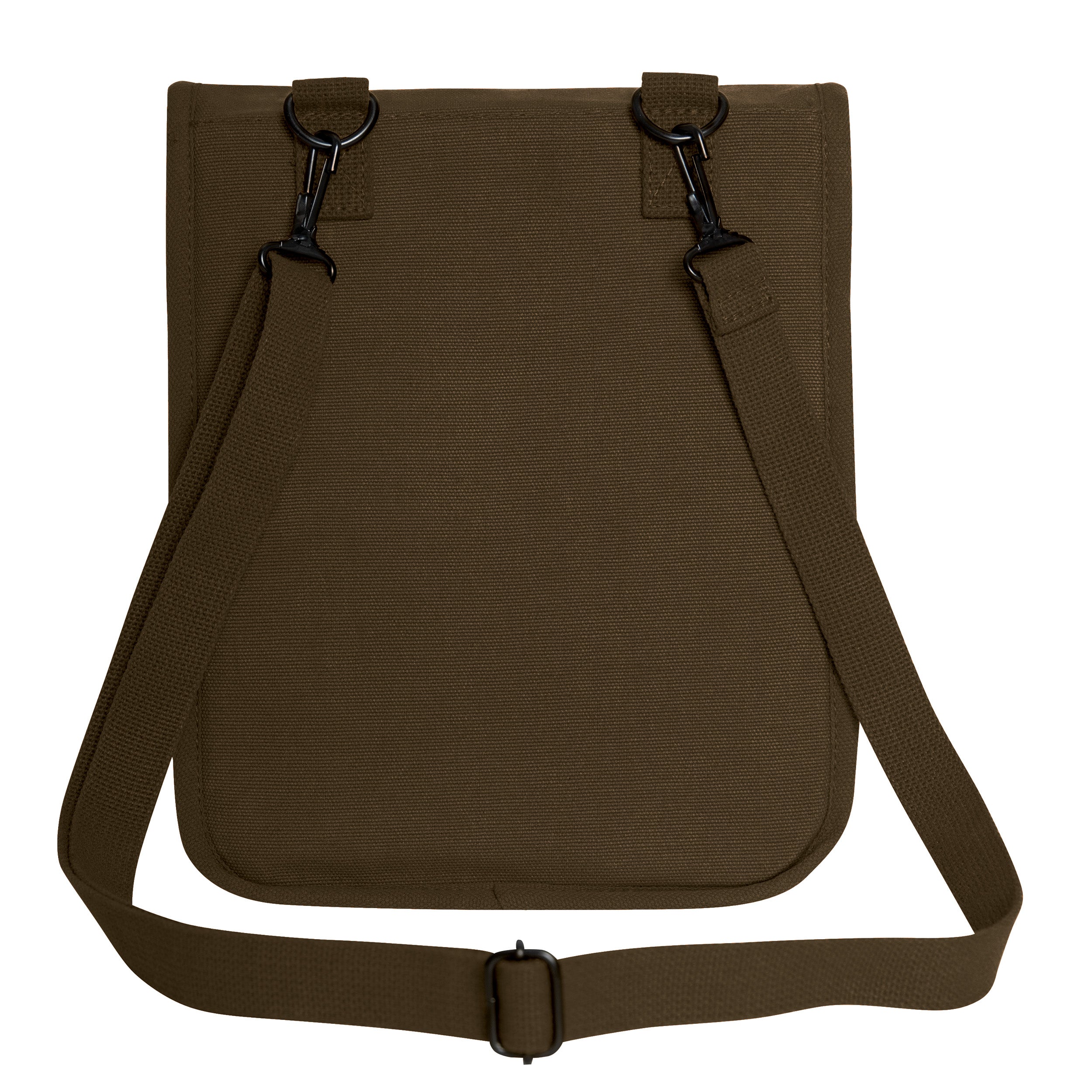 Constructed of heavy weight cotton canvas for durability. Front organizer pocket. Inner divider. Hard board stiffener sewn into back. Detachable and adjustable shoulder strap. Front pocket with snap down flap. Shell loops on front organizer pocket for pens and pencils. Handy travel bag with many compartments for all needs. Unisex. Great size shoulder bag to carry textbooks, notepads, I-pads, Kindles, tablets, E-readers and other small objects. Dimensions 12" x 8.5" x 4.5" (inches). Earth brown canvas map case shoulder bag.