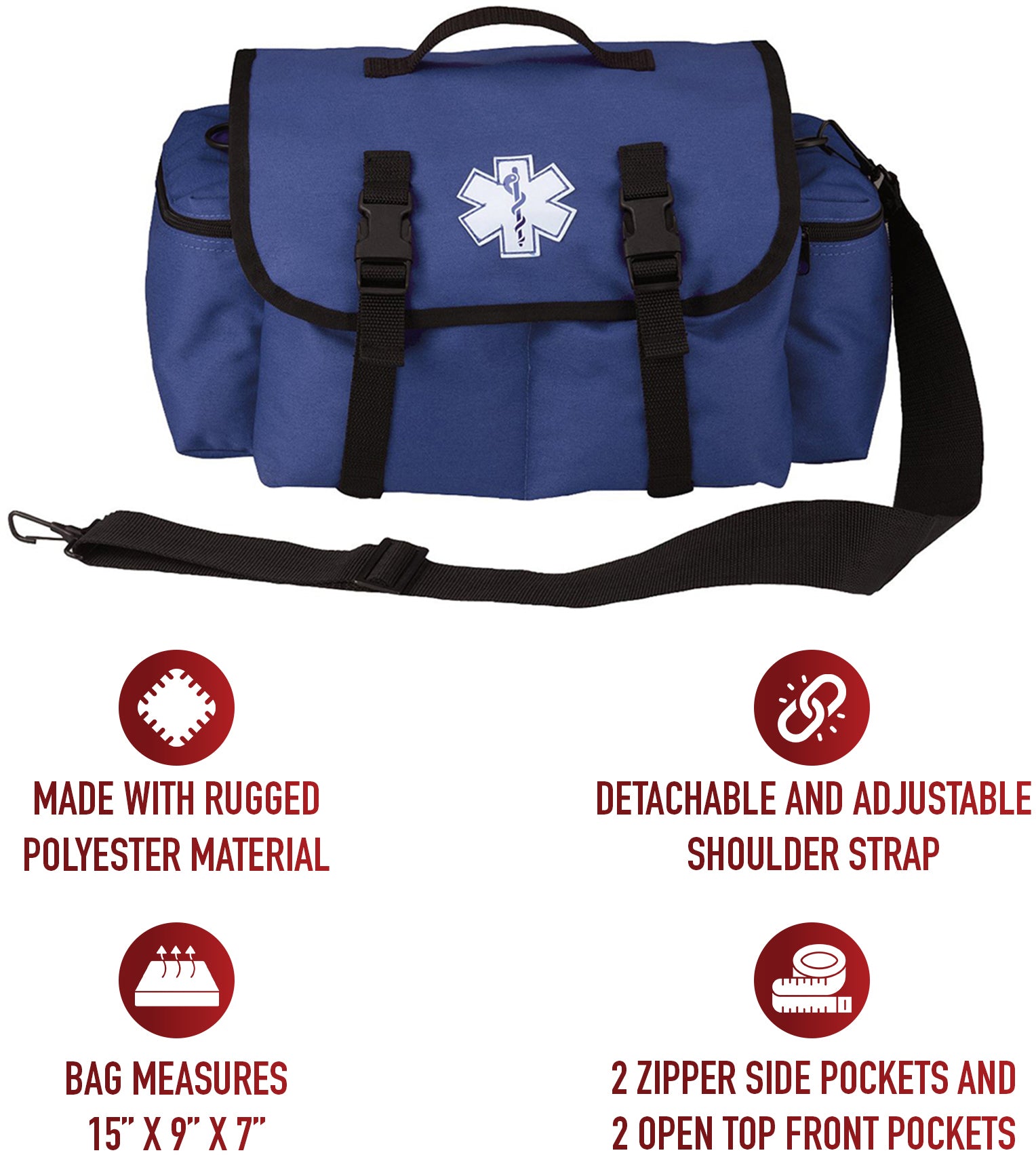 Heavyweight cordura nylon. 3-section central compartment. Zip-flap storage pocket and tool loops. 2 zippered side pouches. 2 front pouches and tool loops. Top handle. Adjustable shoulder strap. Quick-release buckle and hook and loop closures. Reflective star of life emblem. Accessories from picture not included. Also known as medical rescue response bag. Also know as EMS and EMT bag. Blue EMT response bag. Dimensions: 15" x 9" x 7" (inches).