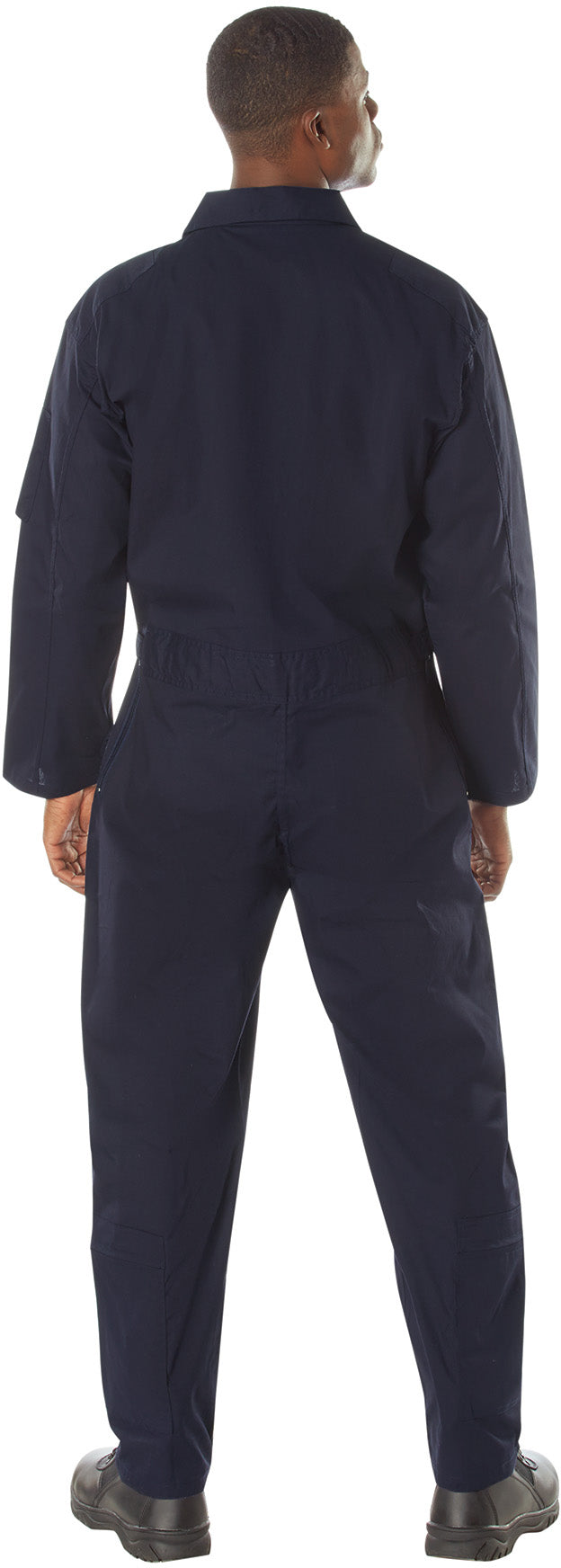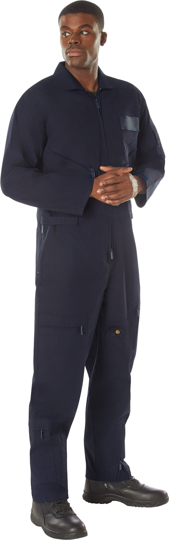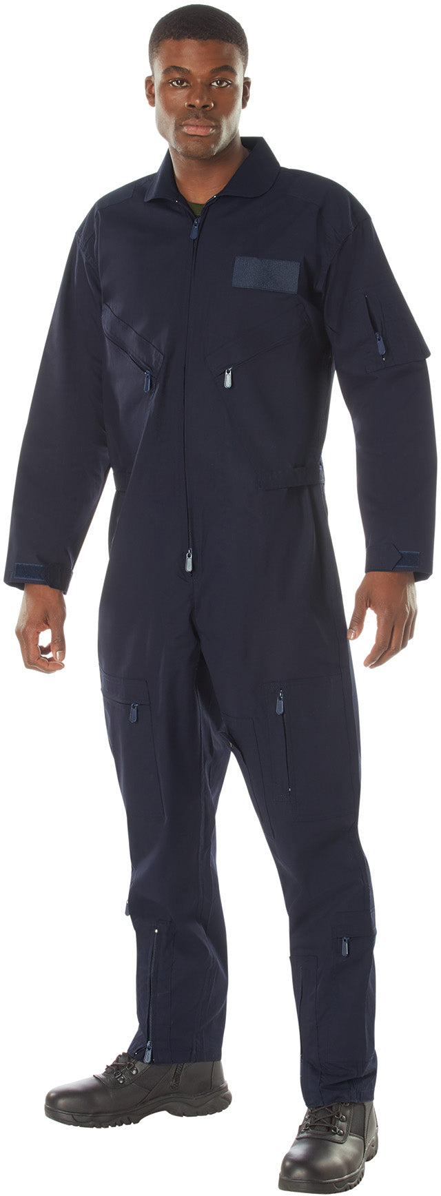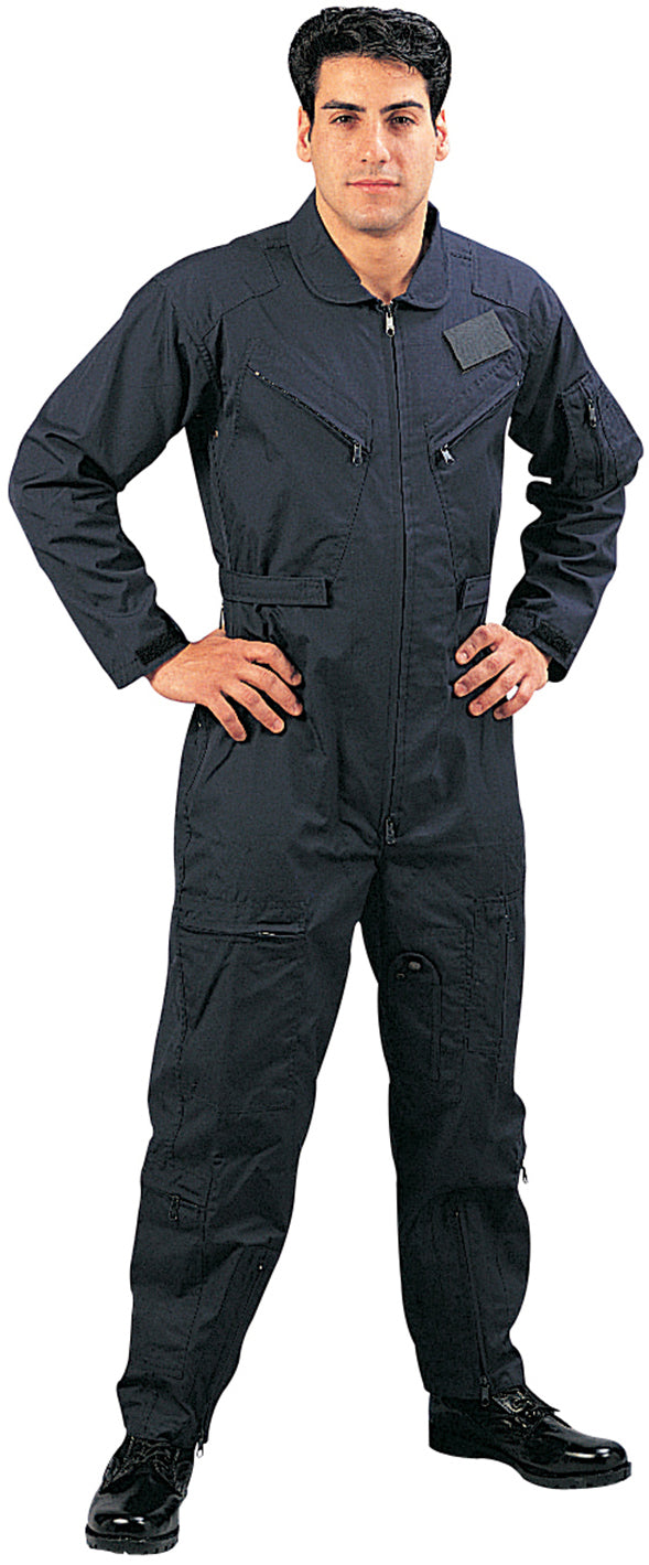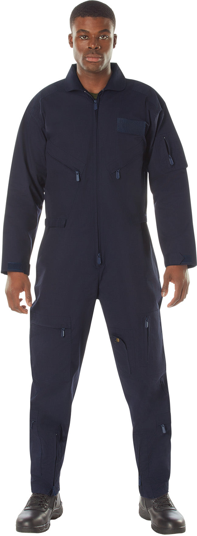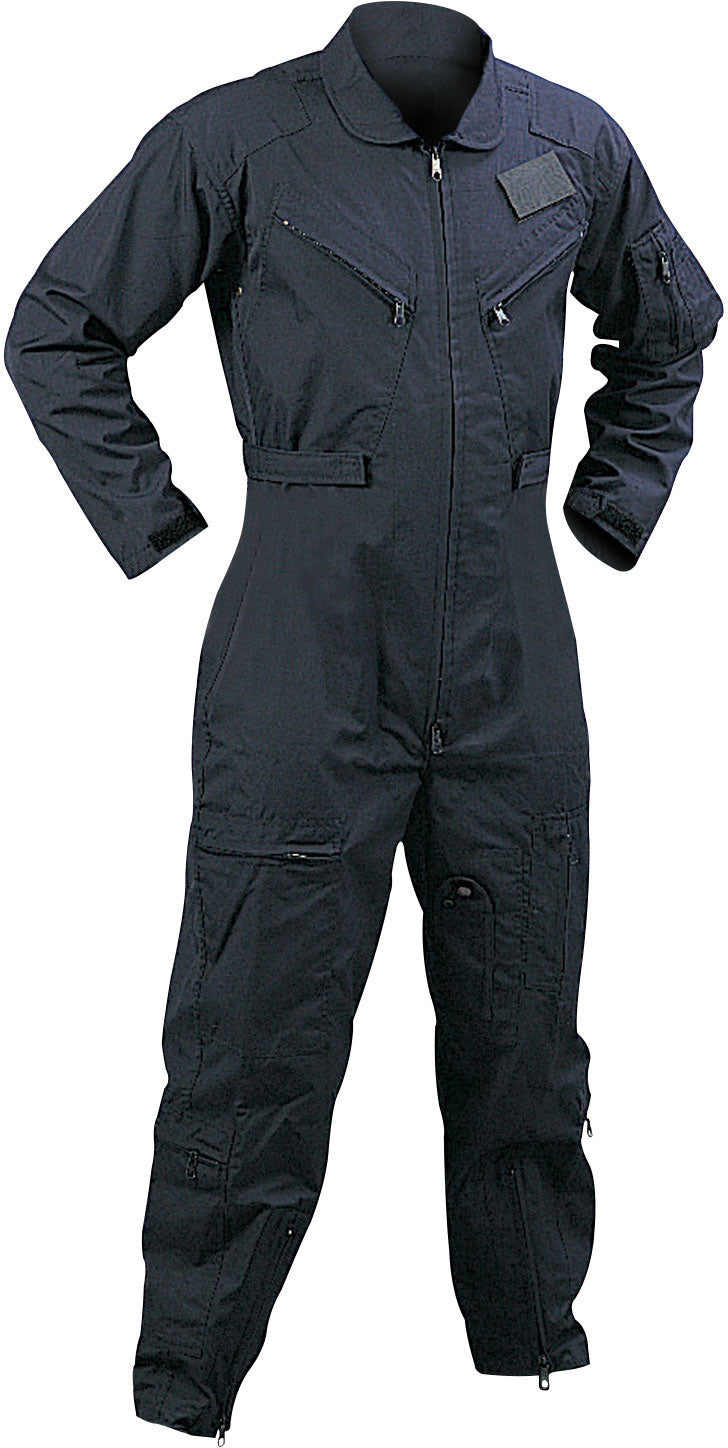Made of Polyester/Cotton material. Collard flight suit. 2 way front zipper. Pleated leg zippers on front and bottom of leg. Adjustable wrist cuff tabs with hook and loop closure. Adjustable waist tabs with hook and loop closure. 2 slash pockets on chest with zipper closure. Removable name badge holder on right chest. Reinforced shoulders. Zippered utility pocket with pen holder on right arm. Under arm vents. 2 zippered slash pockets. Leg pockets with zipper closure and 1 with snap closure. USAF US Air Force style flight suit. Navy Blue color.