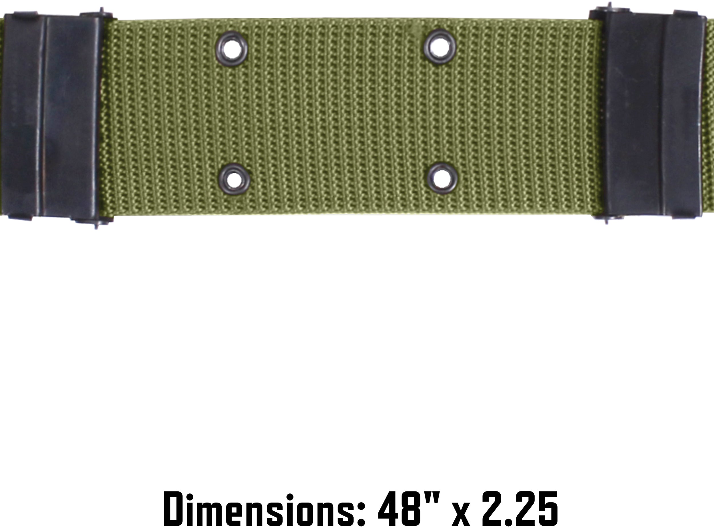 Heavy duty nylon material. Adjustable belt. Metal buckle. Grometed with eyelets to mount old style belt. Individually polyester bagged. Very stylish and comfortable. Extremely durable. Unisex. Fits BDU pants and many others. With iron fitting and buckle. Army style. GI Government Issued style. Olive Drab nylon pistol belt with metal buckle. Width: 2.25" (inches). Medium up to 40". Large up to 46". XL over 46".