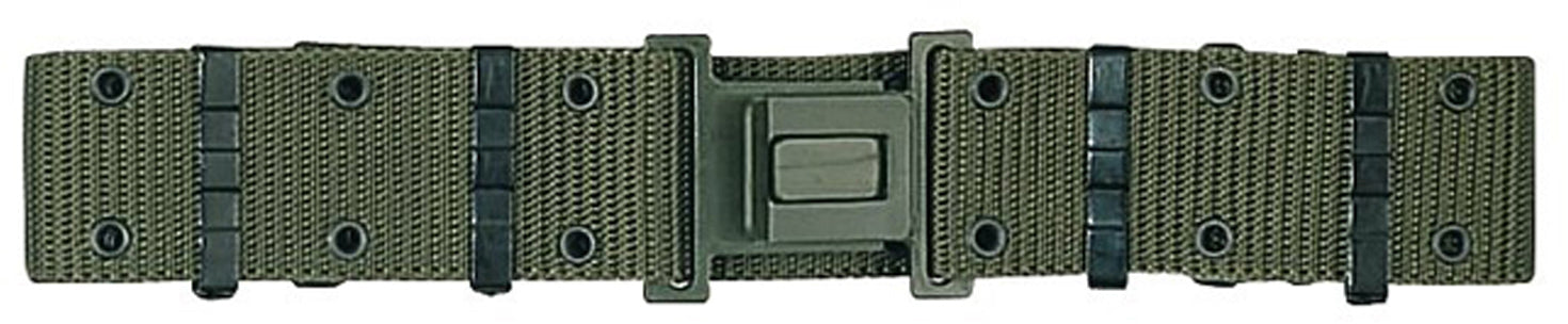 Heavy duty nylon material. Brand new belt. Adjustable belt. Features a quick release buckle and medal waist adjusters. It is grometted with eyelets to hold certain type of gear. Fits BDU pants and many others. GI Government Issued style. Olive Drab nylon quick release pistol belt. Width: 2.25" (inches). Medium up to 40". Large up to 46". XL over 46".