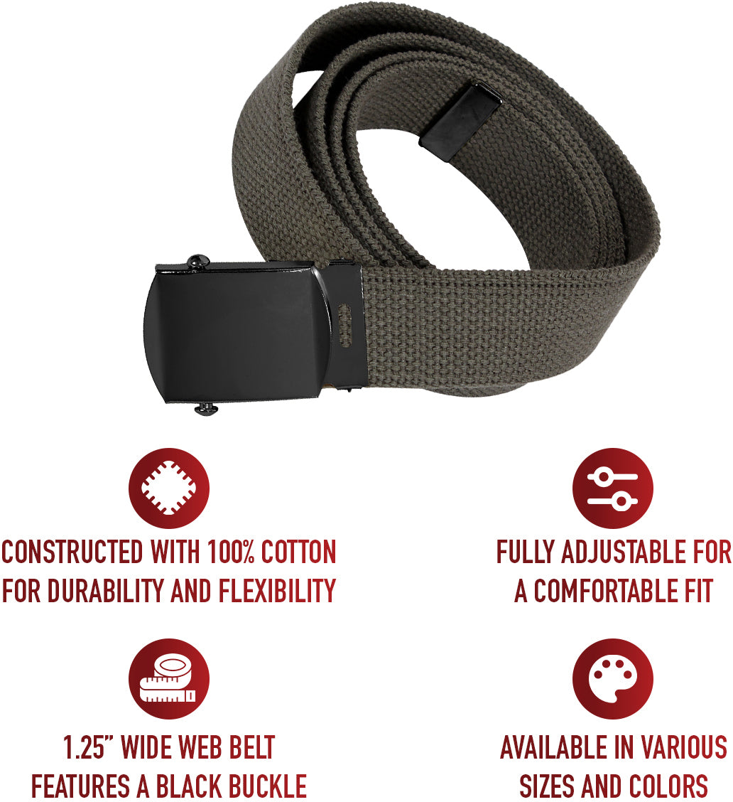 - 1 ¼” wide army web belt features a black buckle