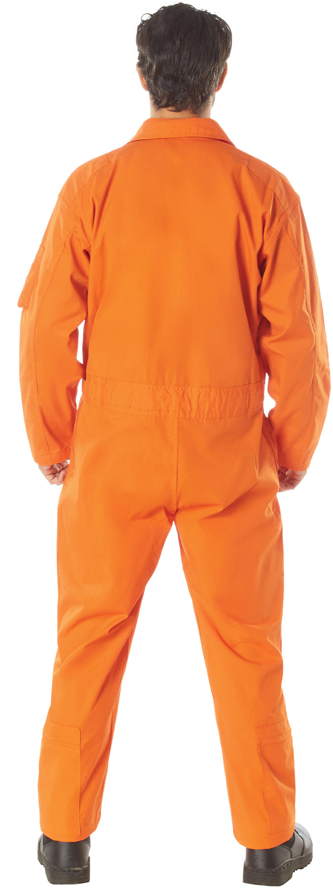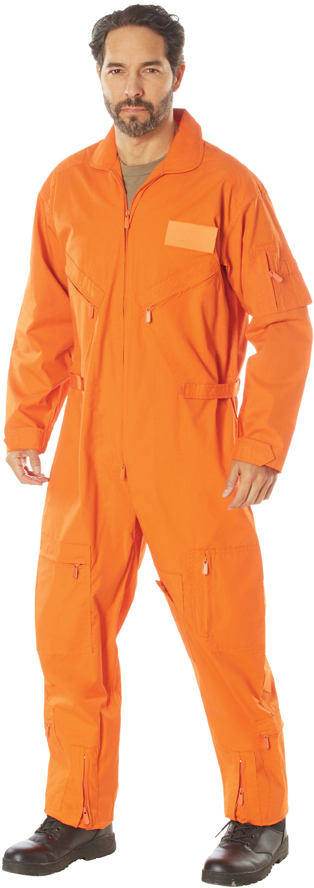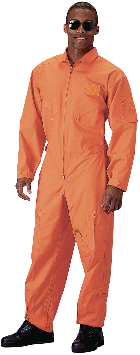 Made of Polyester/Cotton material. Collard flight suit. 2 way front zipper. Pleated leg zippers on front and bottom of leg. Adjustable wrist cuff tabs with hook and loop closure. Adjustable waist tabs with hook and loop closure. 2 slash pockets on chest with zipper closure. Removable name badge holder on right chest. Reinforced shoulders. Zippered utility pocket with pen holder on right arm. Under arm vents. 2 zippered slash pockets. Leg pockets with zipper closure and 1 with snap closure. USAF US Air Force style flight suit. Orange color.