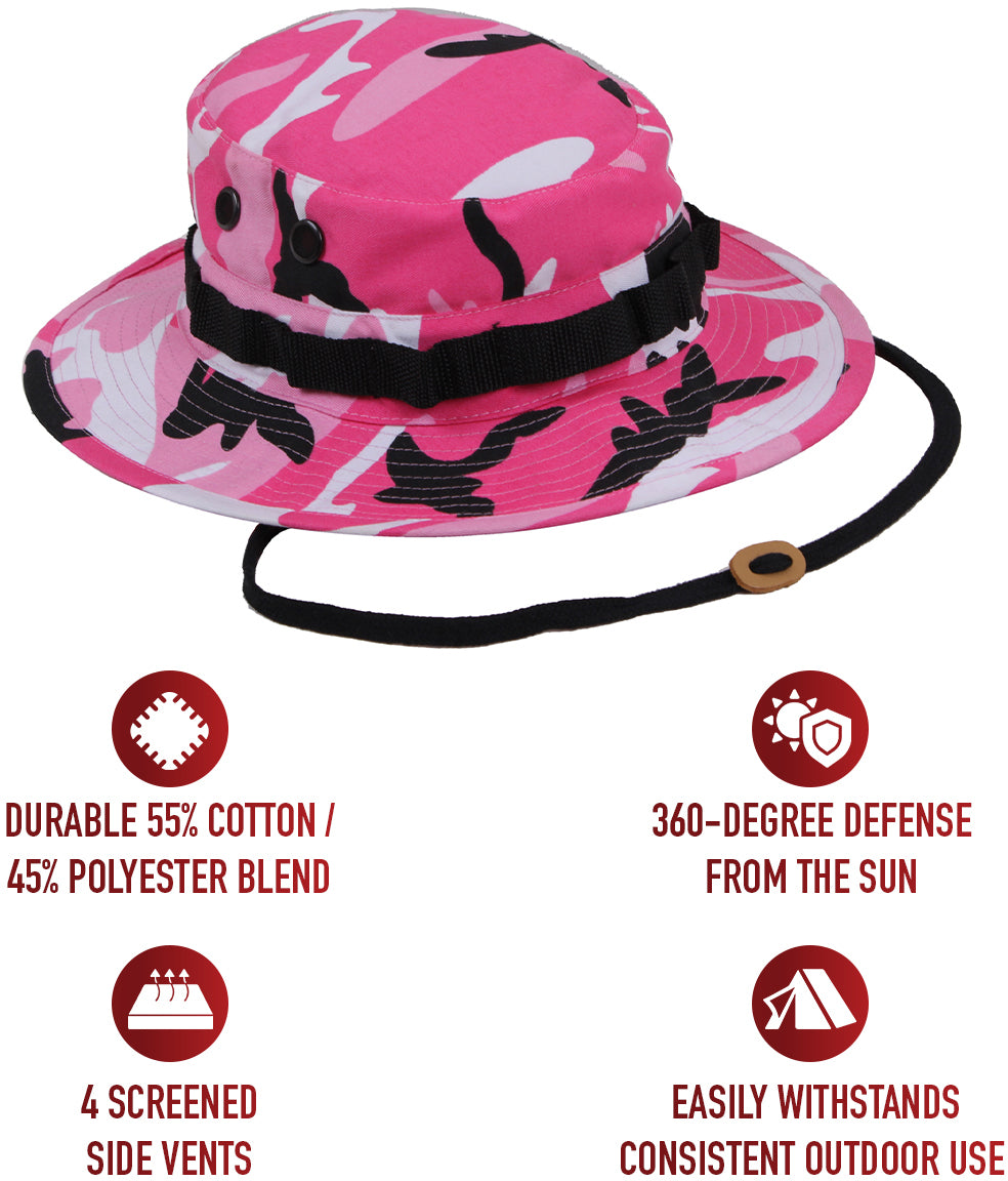 Polyester/Cotton material. Made to government specifications. Screened side vents. Branch loops. Chin straps. Perfect for fishing, hunting and everyday play. Made for durability and everyday wear and use. Unisex. Army style. Military style. Pink Camouflage boonie hat. Approximate brim size: 2.5" - 3".