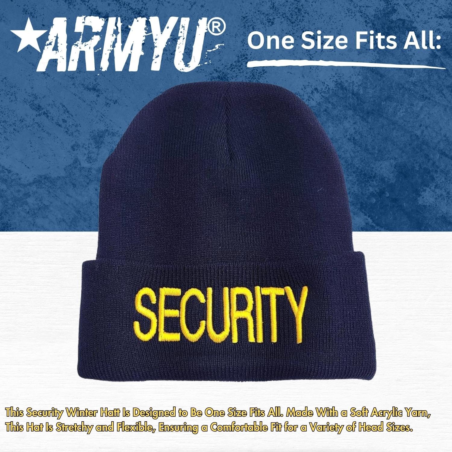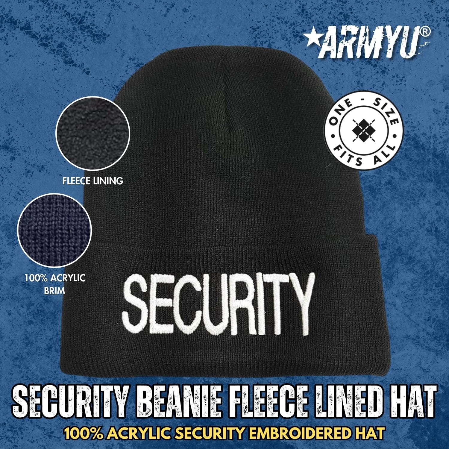 ARMYU Large Embroidered SECURITY Beanie Fleece Lined Hat Warm Winter Watch Cap - Attention all security guards, watchmen, and officers! Get ready to take your winter gear to the next level with the Army Universe Security Large Embroidered Beanie Fleece Lined Warm Winter Watch Cap. Made from 100% Warm Winter Acrylic Material, this beanie is the perfect way to keep your head warm and cozy during those long winter shifts. But this beanie is more than just functional - it's stylish too! With a large SECURITY embroidery on the front, you'll be sure to stand out from the crowd and show off your professionalism while on the job. And with the option to choose between gold or white thread, you can personalize your beanie to fit your unique style. What really sets this beanie apart from the rest is the fleece lining. That's right - this beanie is lined with 100% Polyester Fleece Material, giving you that extra warmth and comfort that you need during those cold winter days. And with a long knitted 9" high beanie skull head cover, you'll be sure to stay toasty all day long. The Army Universe Security Large Embroidered Beanie isn't just for work - it's perfect for outdoor activities too! With its water-resistant and water-repellent features, this beanie is great for skiing, snowboarding, or just running errands on a snowy day. So what are you waiting for? Don't settle for a boring old winter hat. Upgrade to the Army Universe Security Large Embroidered Beanie Fleece Lined Warm Winter Watch Cap and show off your style and professionalism all winter long!