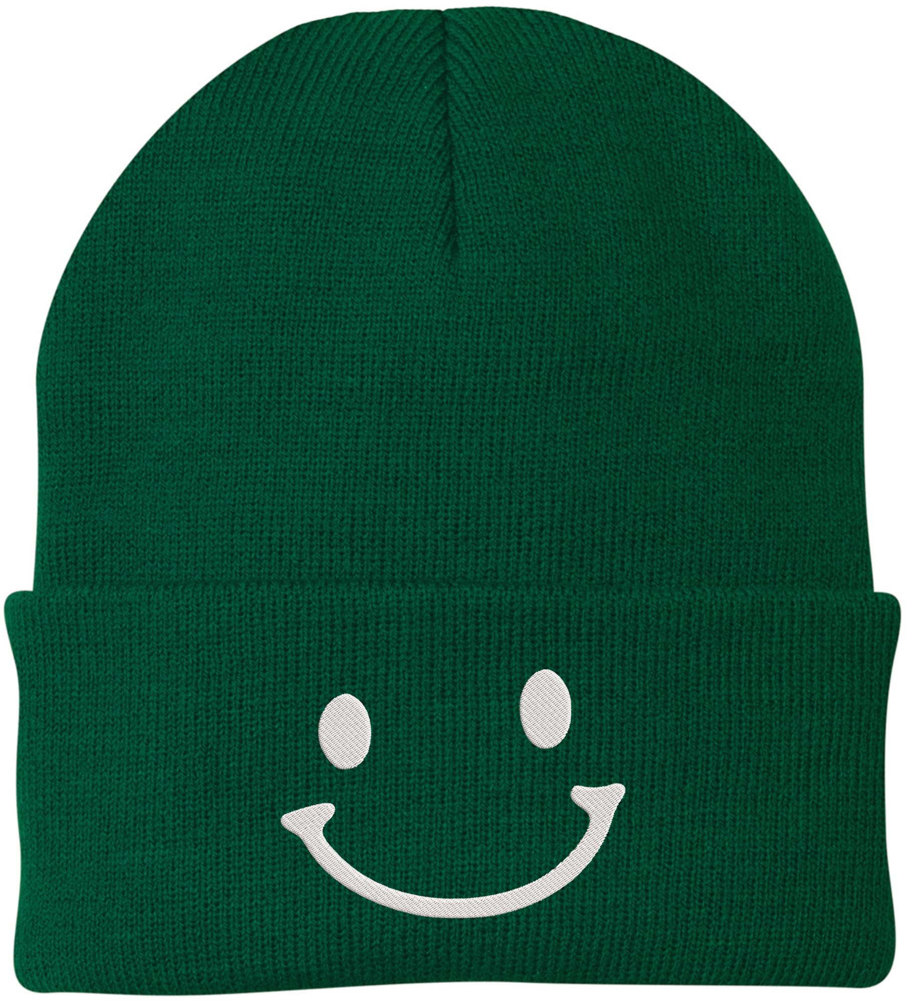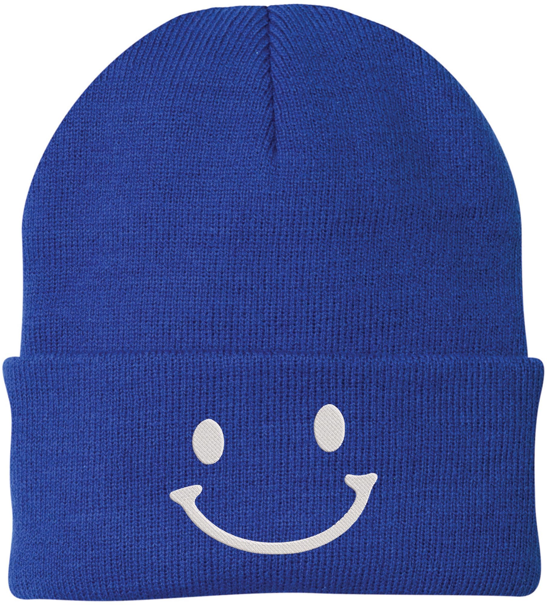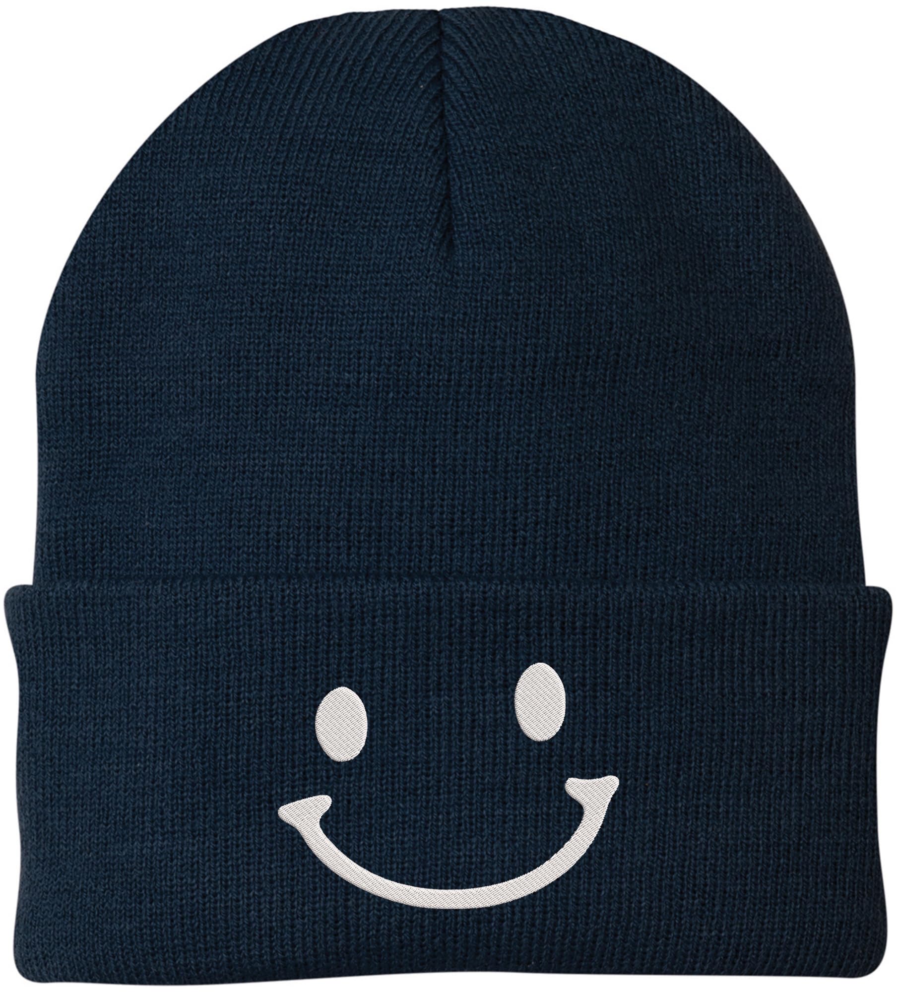 Smiley Face Outline Embroidered Beanie | Cute Knit Winter Hat | Unisex Warm Cuff Skull Cap for Men & Women