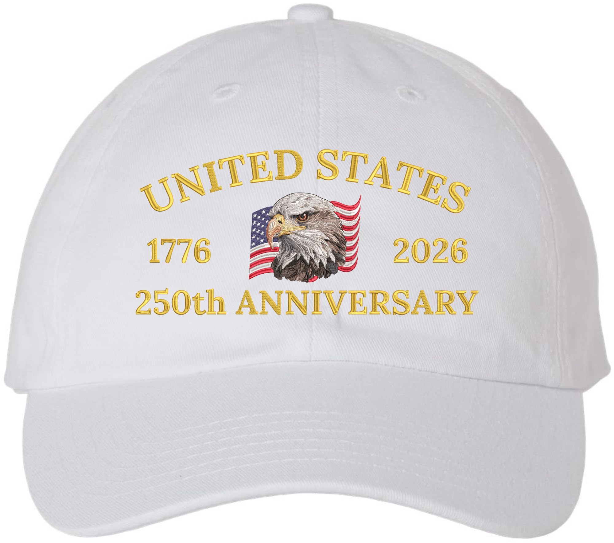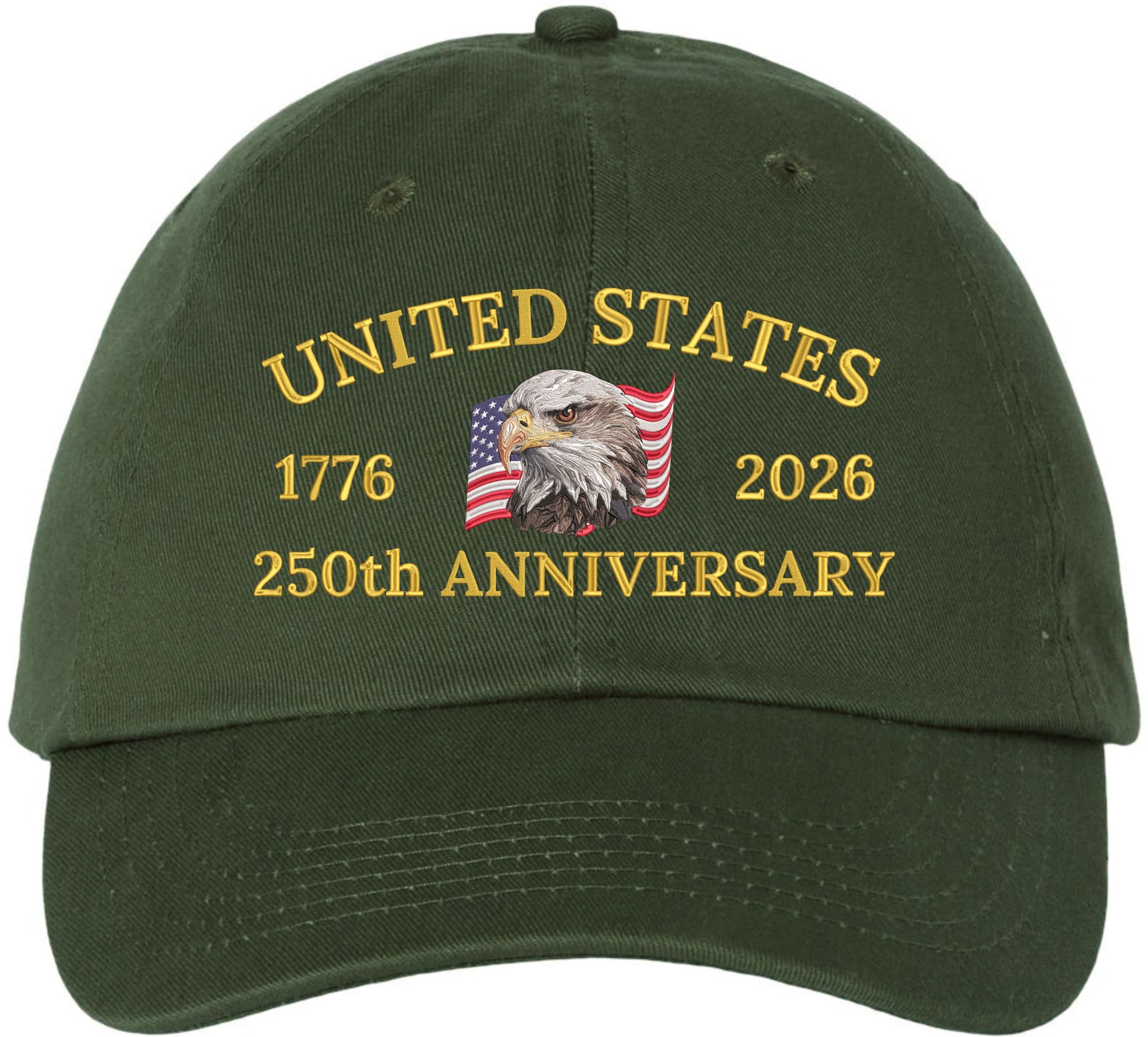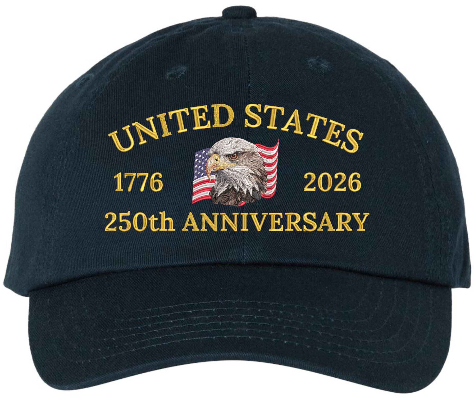This United States 250th Anniversary Embroidered Baseball Cap is a patriotic 100% cotton hat created to honor America's historic 1776-2026 milestone, featuring a bold USA bald eagle and American flag embroidery that represents freedom, independence, and national pride. Customers wear this patriotic baseball cap for Fourth of July celebrations, Independence Day events, Memorial Day, Veterans Day parades, fireworks shows, outdoor festivals, travel, sporting events, and everyday casual wear, making it suitable for both special occasions and daily use. The adjustable buckle closure provides a secure, comfortable fit for men and women, offering breathable comfort, durability, and sun protection during long hours outdoors. Chosen as an American flag baseball cap, USA anniversary hat, bald eagle hat, patriotic cotton dad hat, Fourth of July hat, Independence Day cap, veterans support hat, and USA patriotic gift, this embroidered baseball cap combines meaningful symbolism, comfort, and timeless style for anyone proud to celebrate American history.