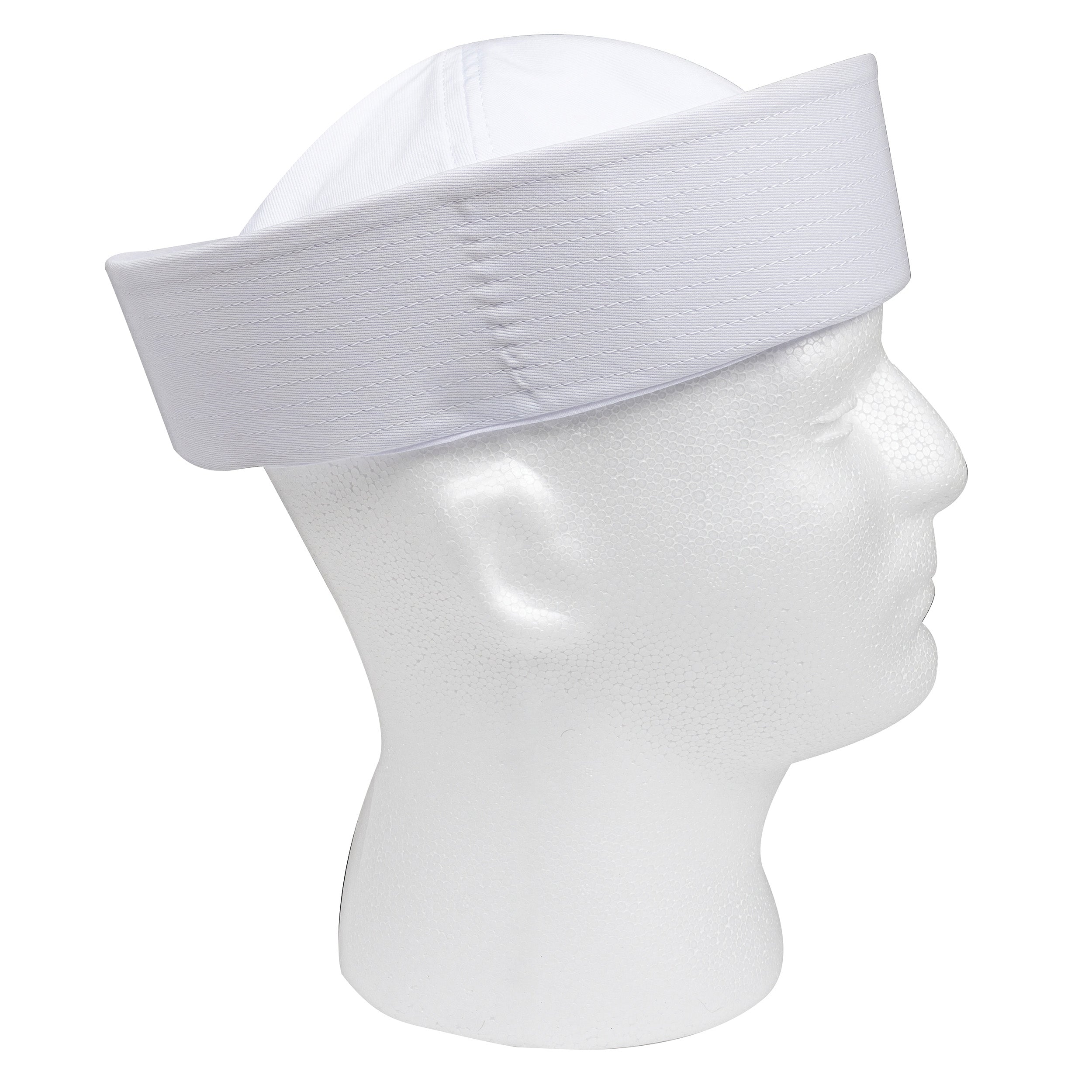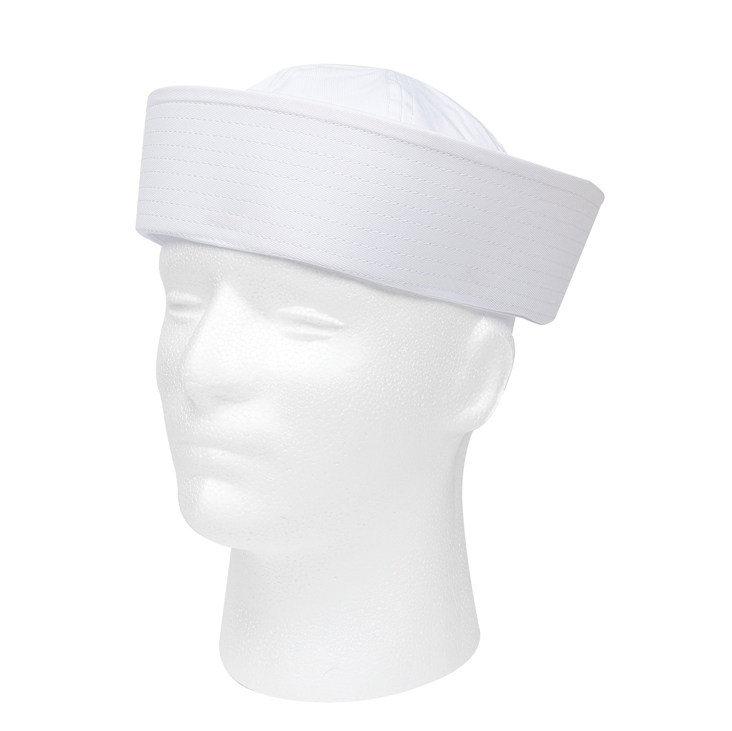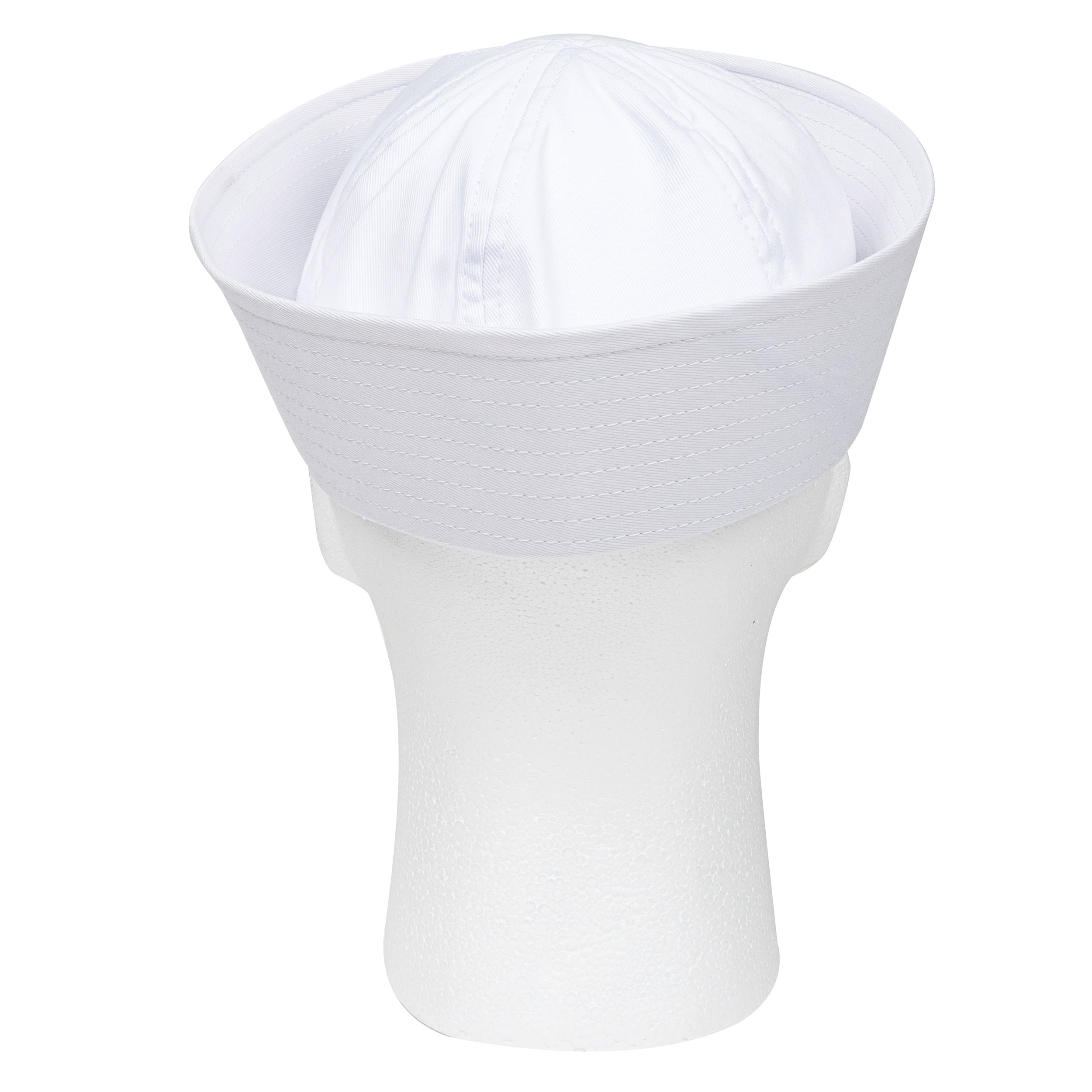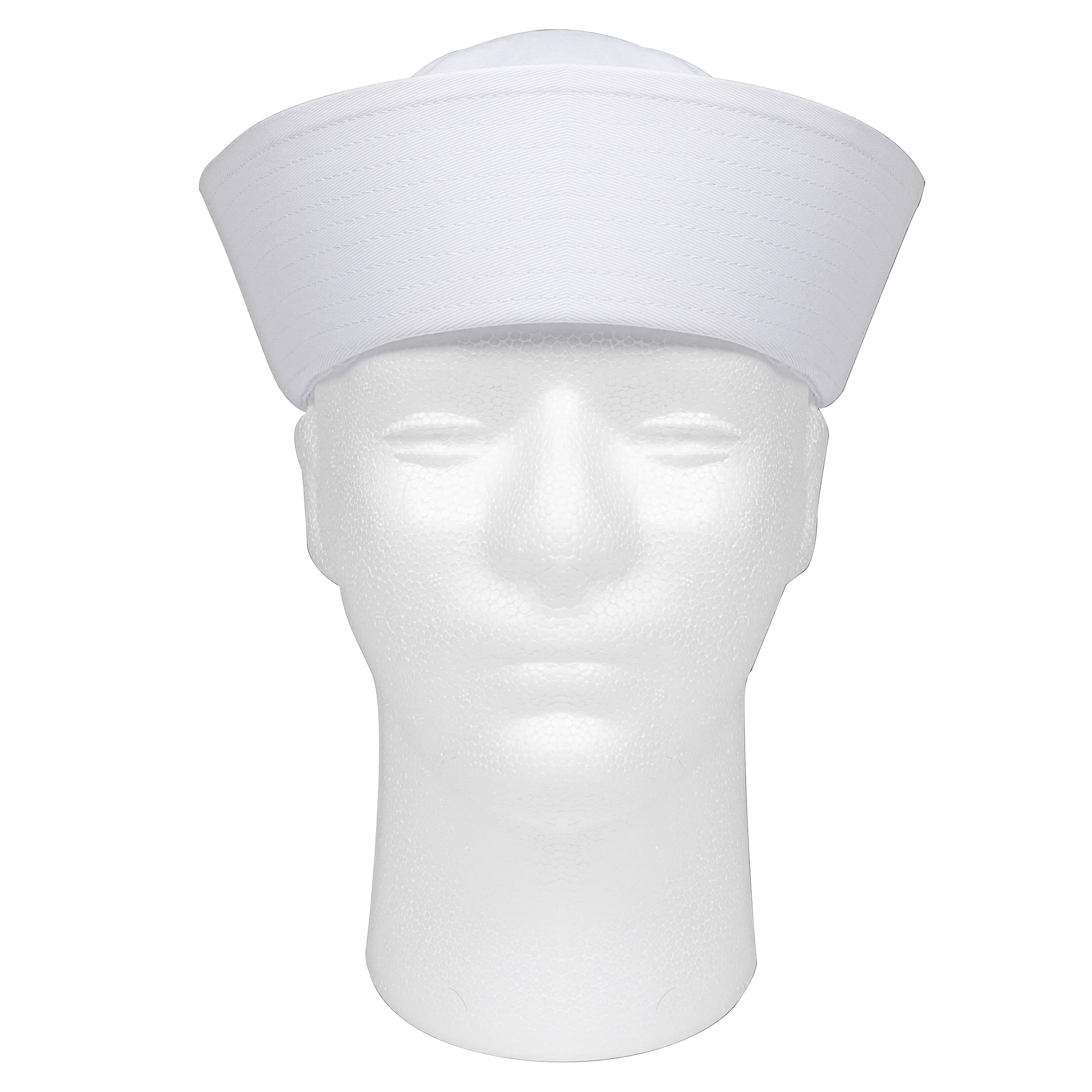 100% cotton. USN US Navy style reproduction of the cap that is worn by US sailors. Also referred to as Dixie Cup, Popeye Cap, Costume Doughboy hat.
