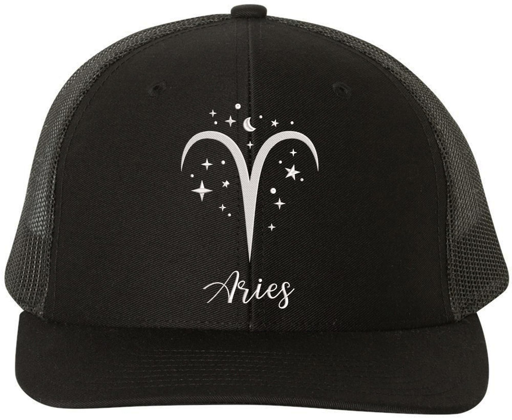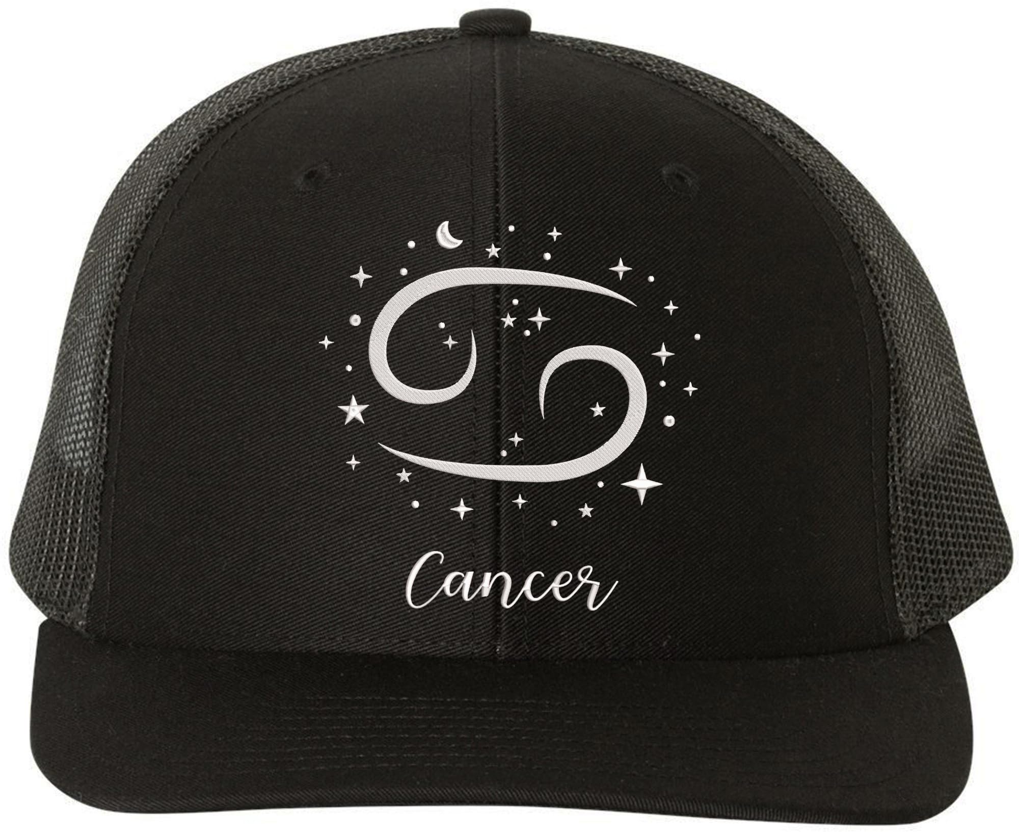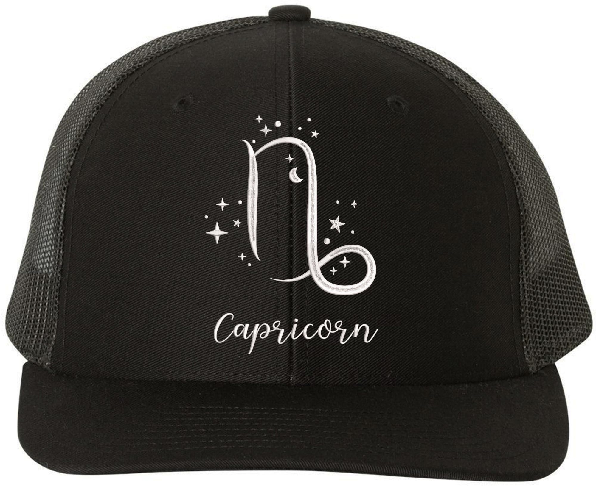 ID: zodiac-signs-embroidered-trucker-hat-adjustable-snapback-astrology-horoscope-monthly-symbols-designs-mesh-cap-black