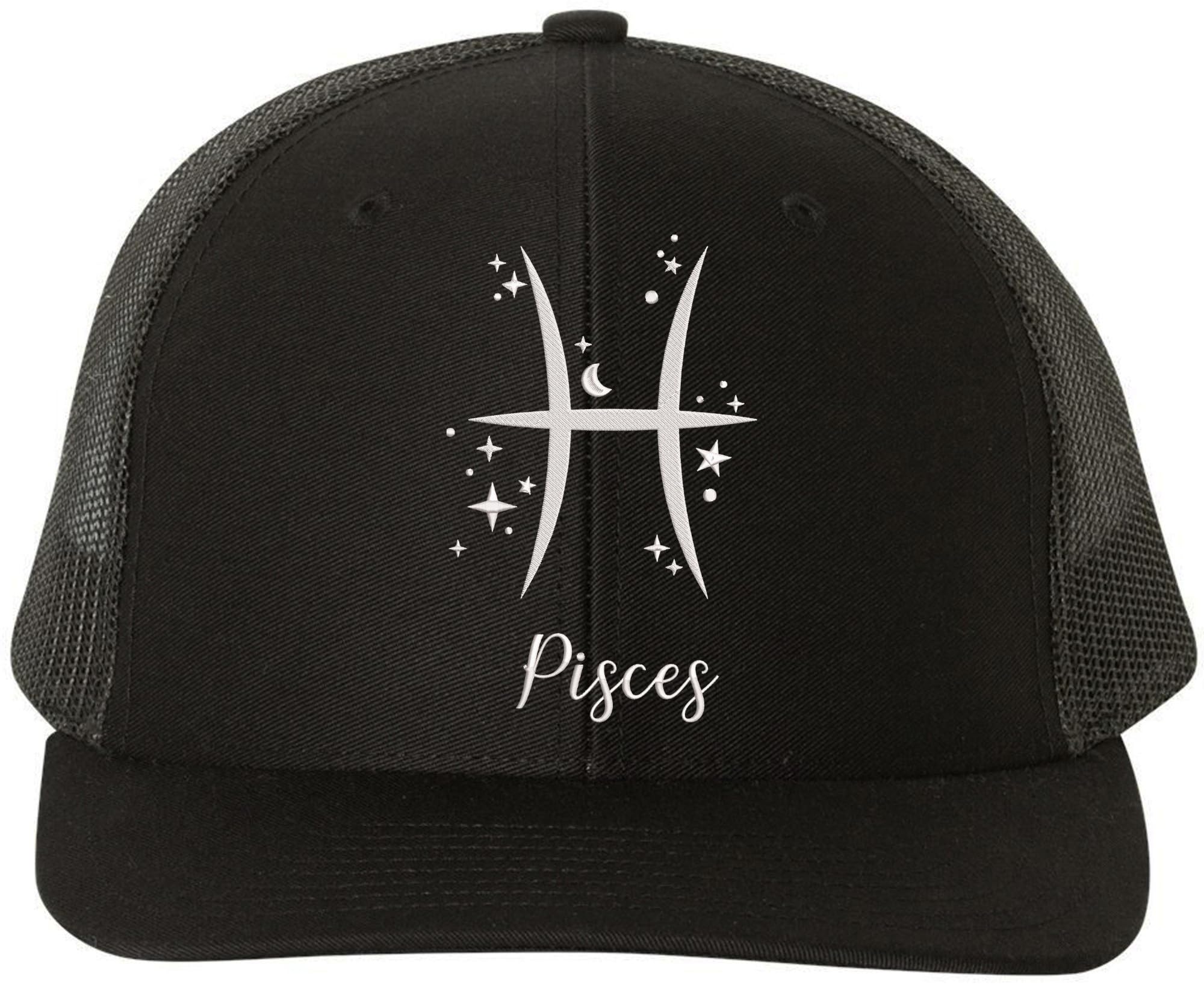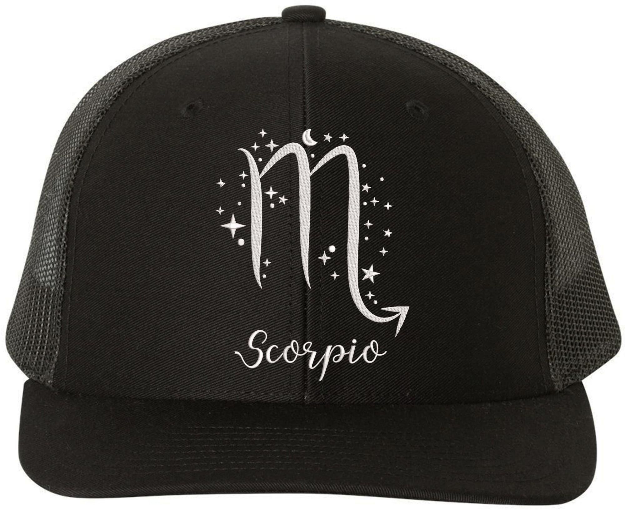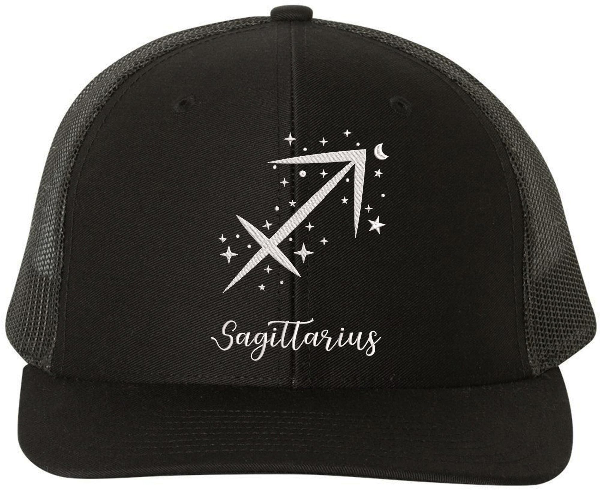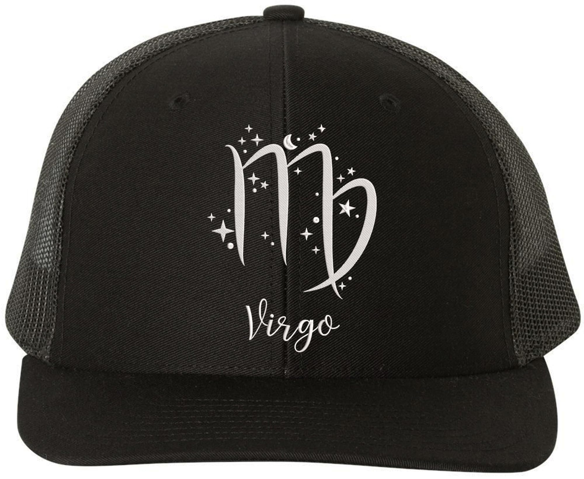ID: zodiac-signs-embroidered-trucker-hat-adjustable-snapback-astrology-horoscope-monthly-symbols-designs-mesh-cap-black